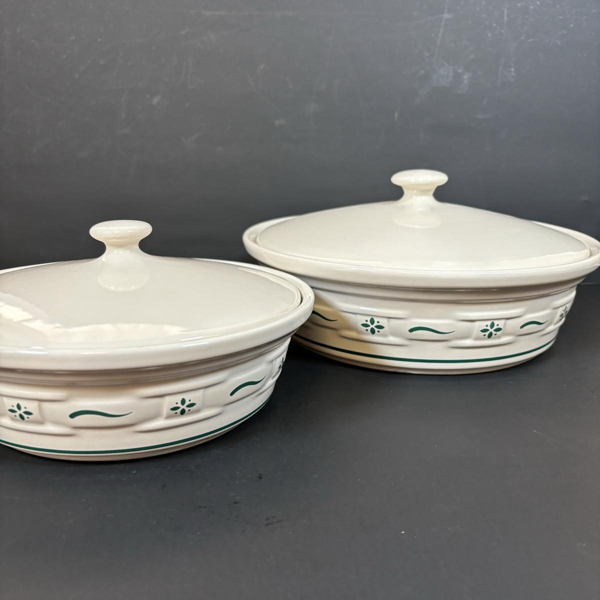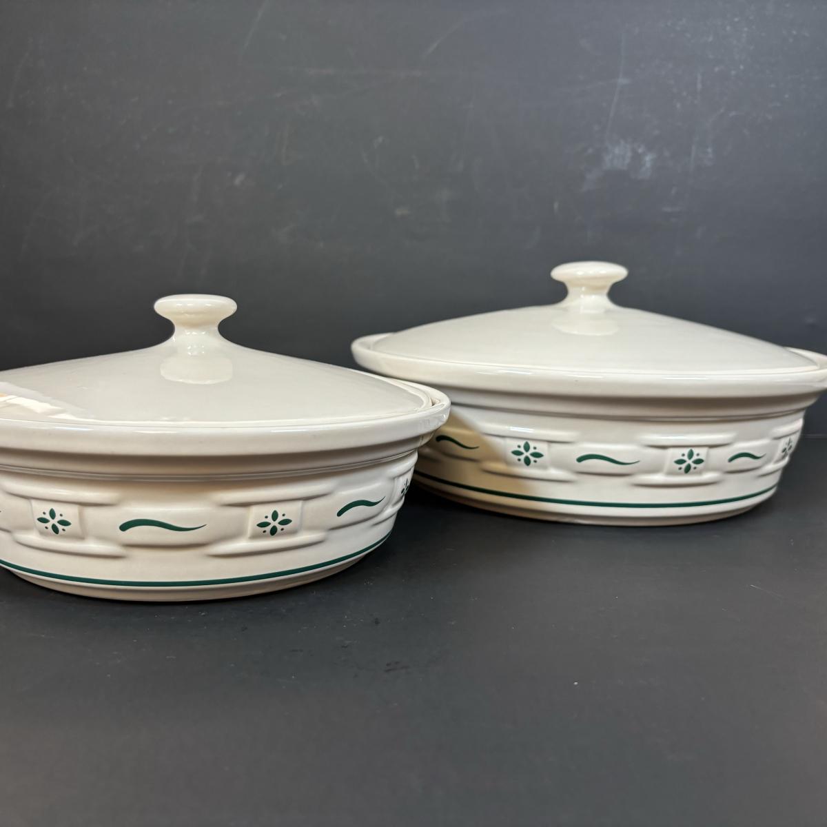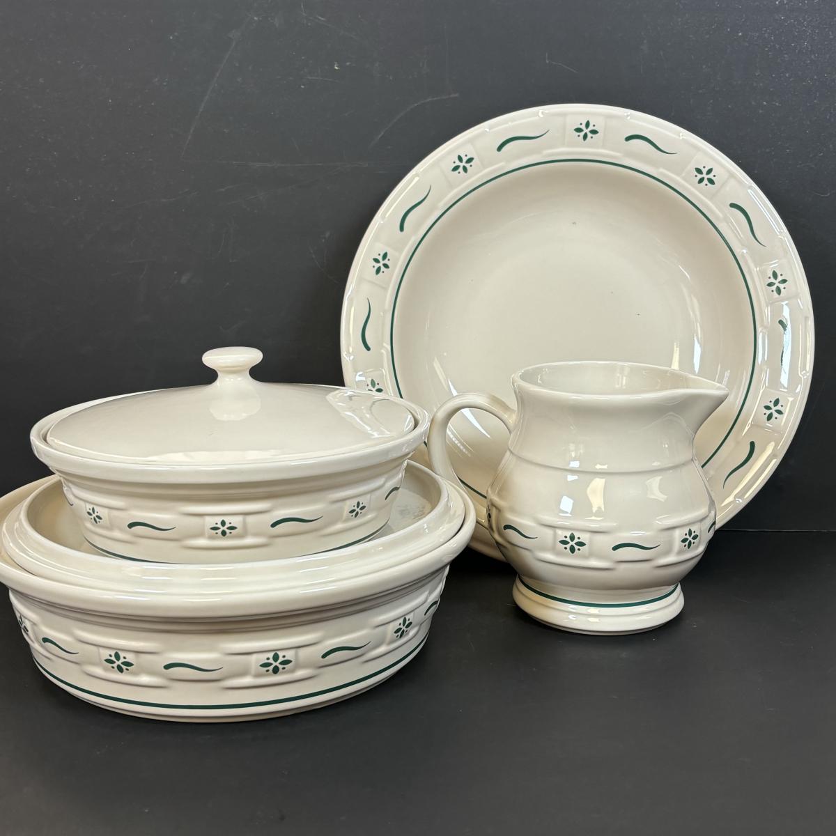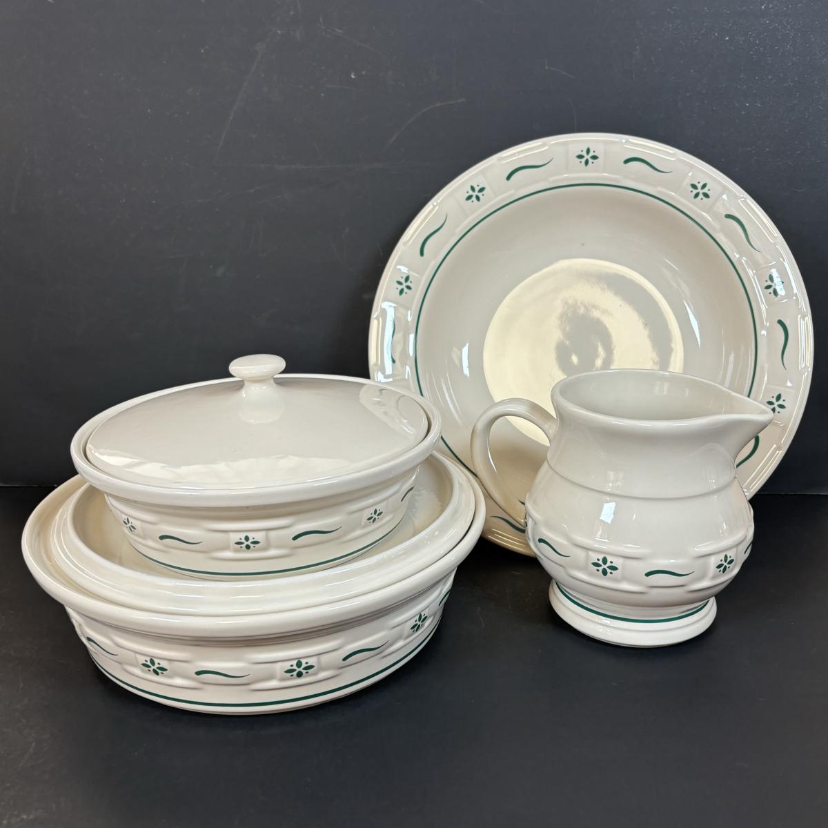 LOT 15: Longaberger Pottery Woven Traditions - Heritage Green: Serving Bowl, Pitcher & Covered Casserole Dishes