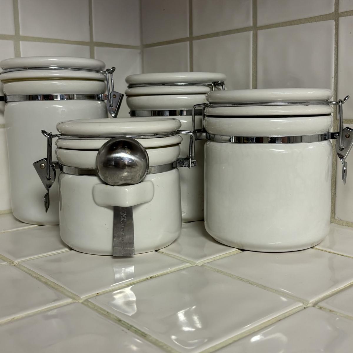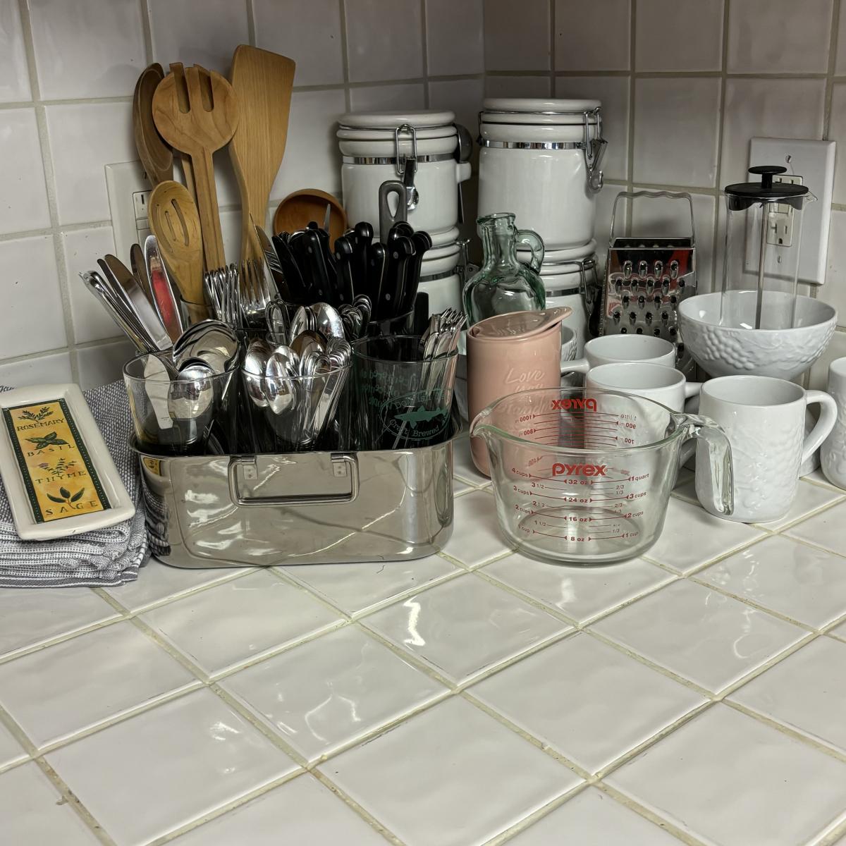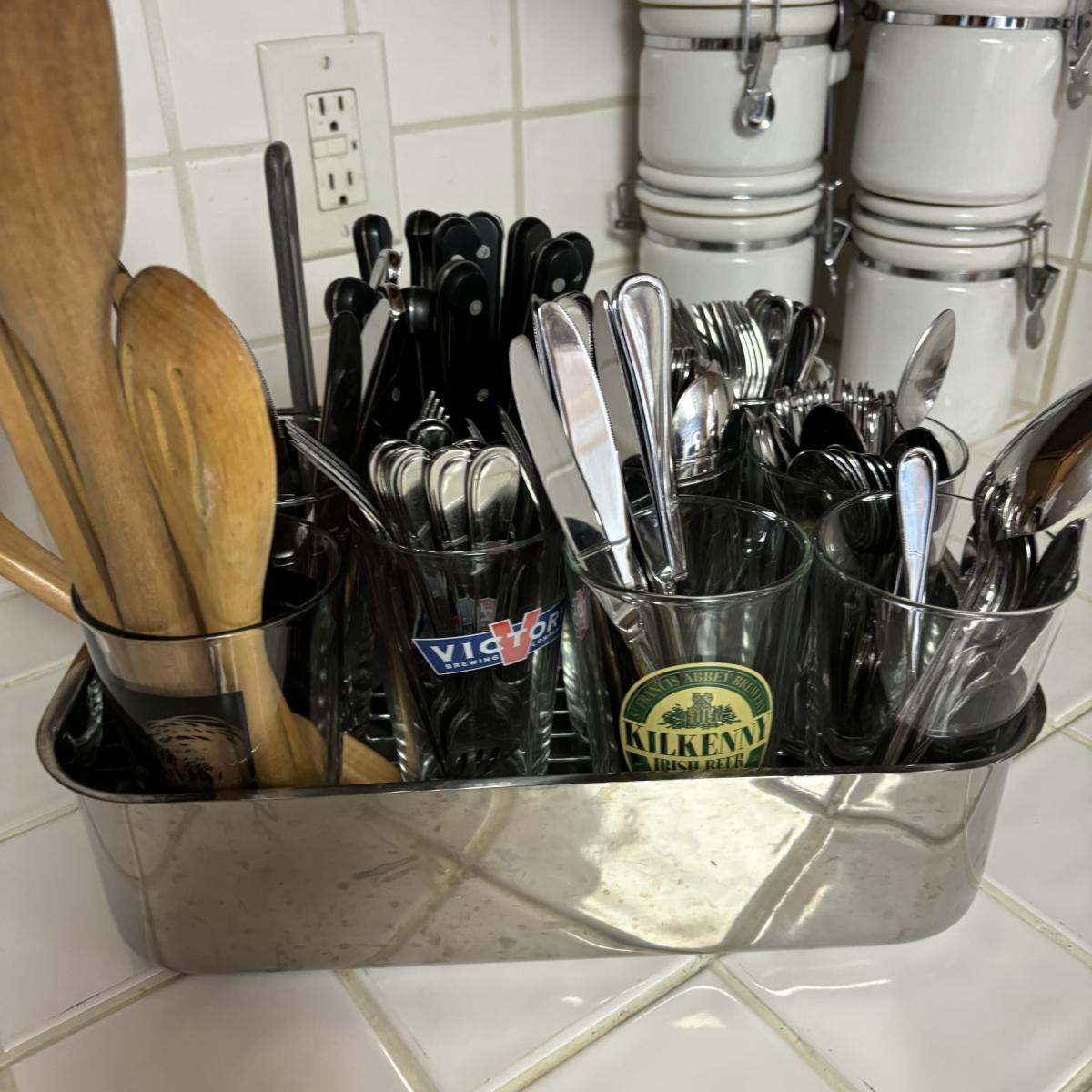 LOT 19: Le Gourmet Chef Mugs & Bowls, OGGI Canister Set, Flatware, Ikea Knives, Roaster Pan & More