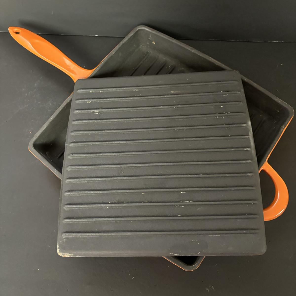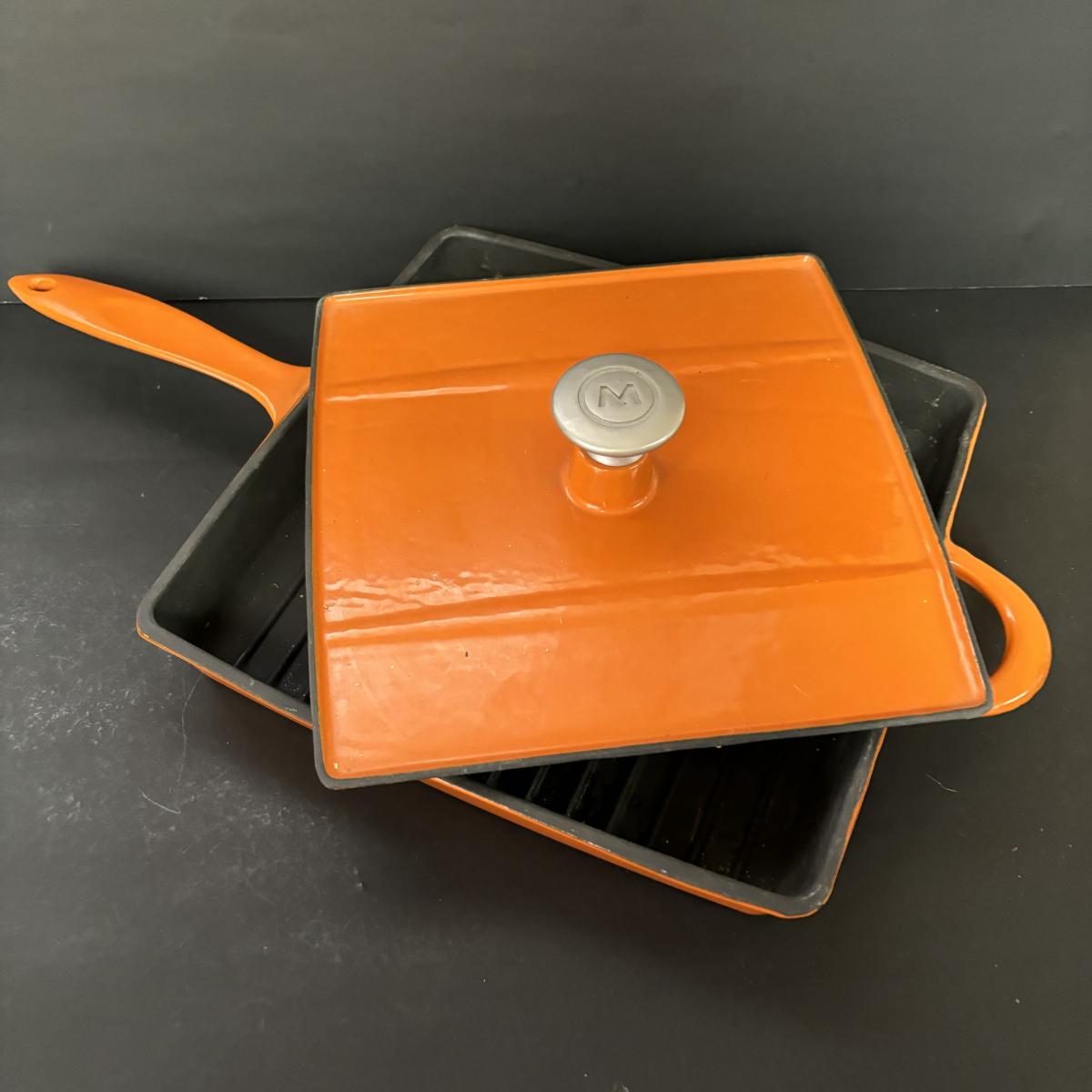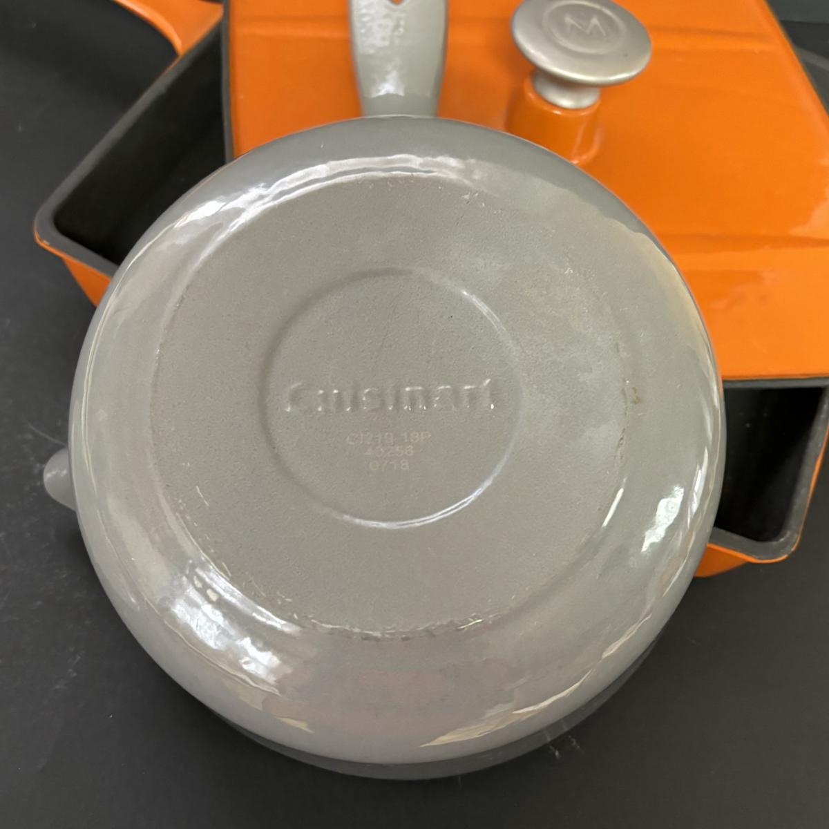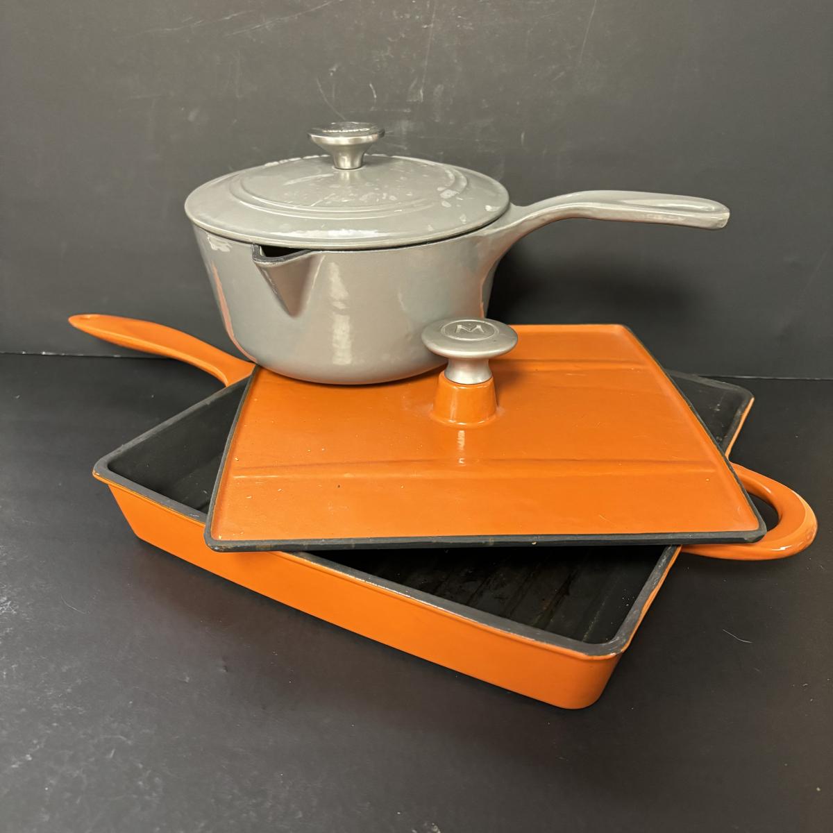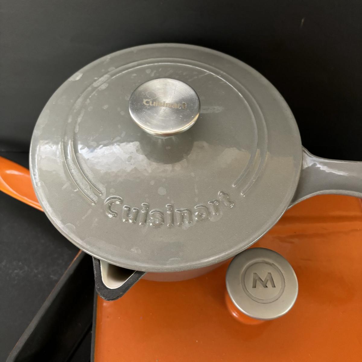 LOT 21: Cuisinart Cast Iron Enameled 2qt Saucepan & Mario Batali by Dansk Orange Enameled Cast Iron Grill Pan w/Panini Press Lid