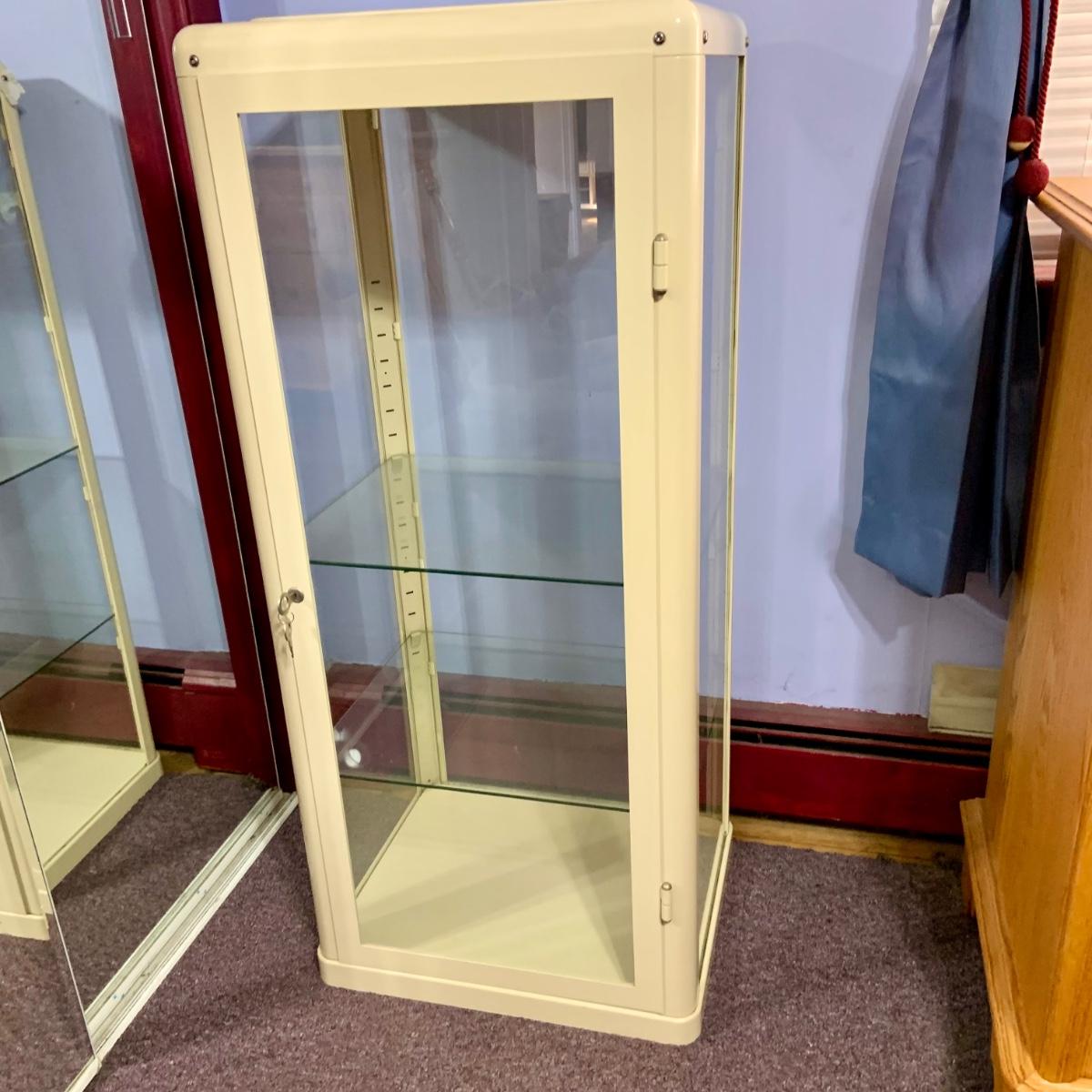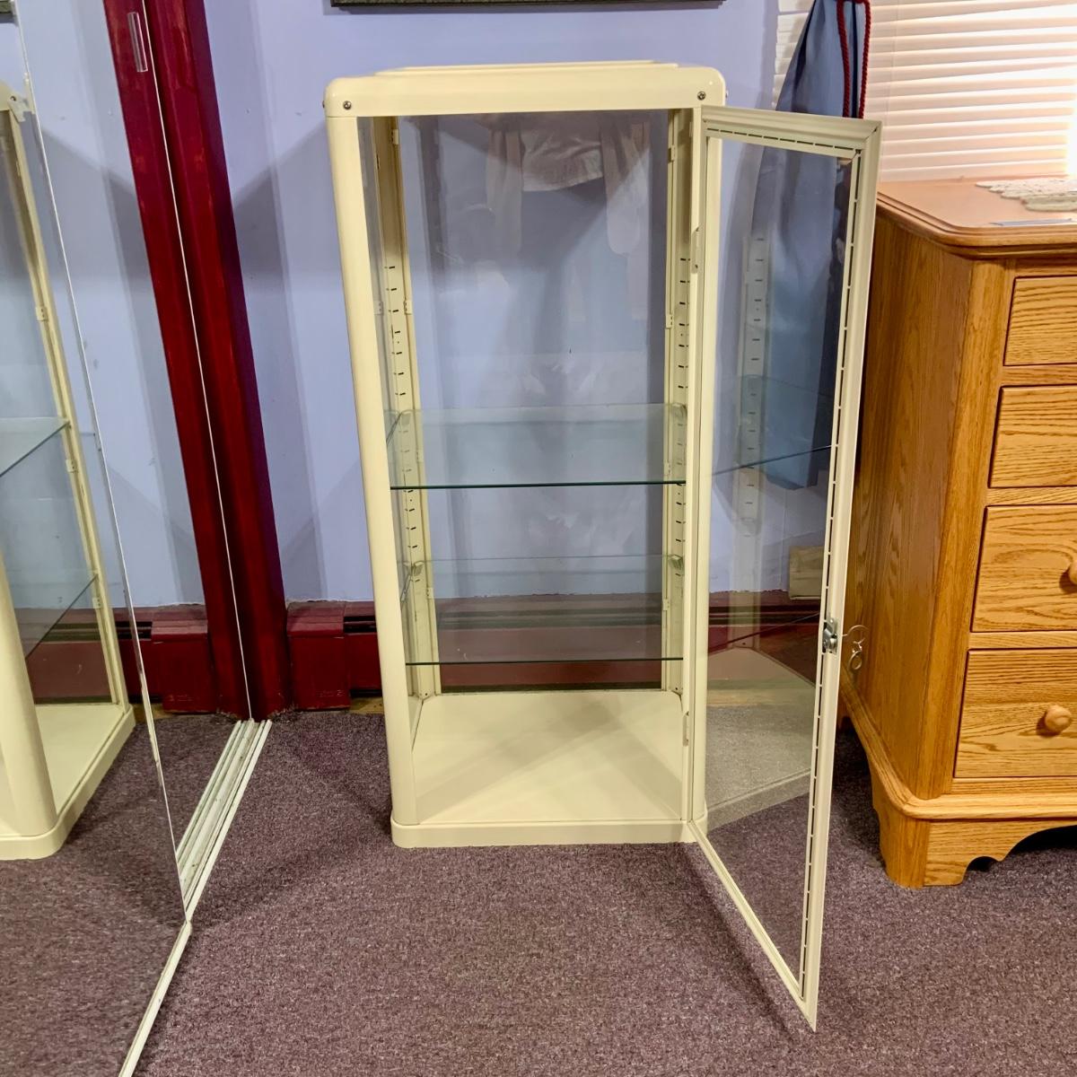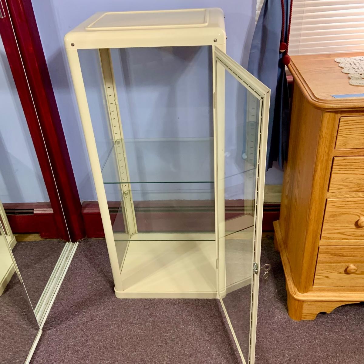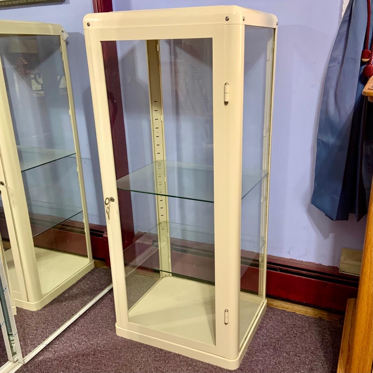 LOT:28: Yellow Metal and Glass Display Cabinet with Glass Shelves, Lock and Key.