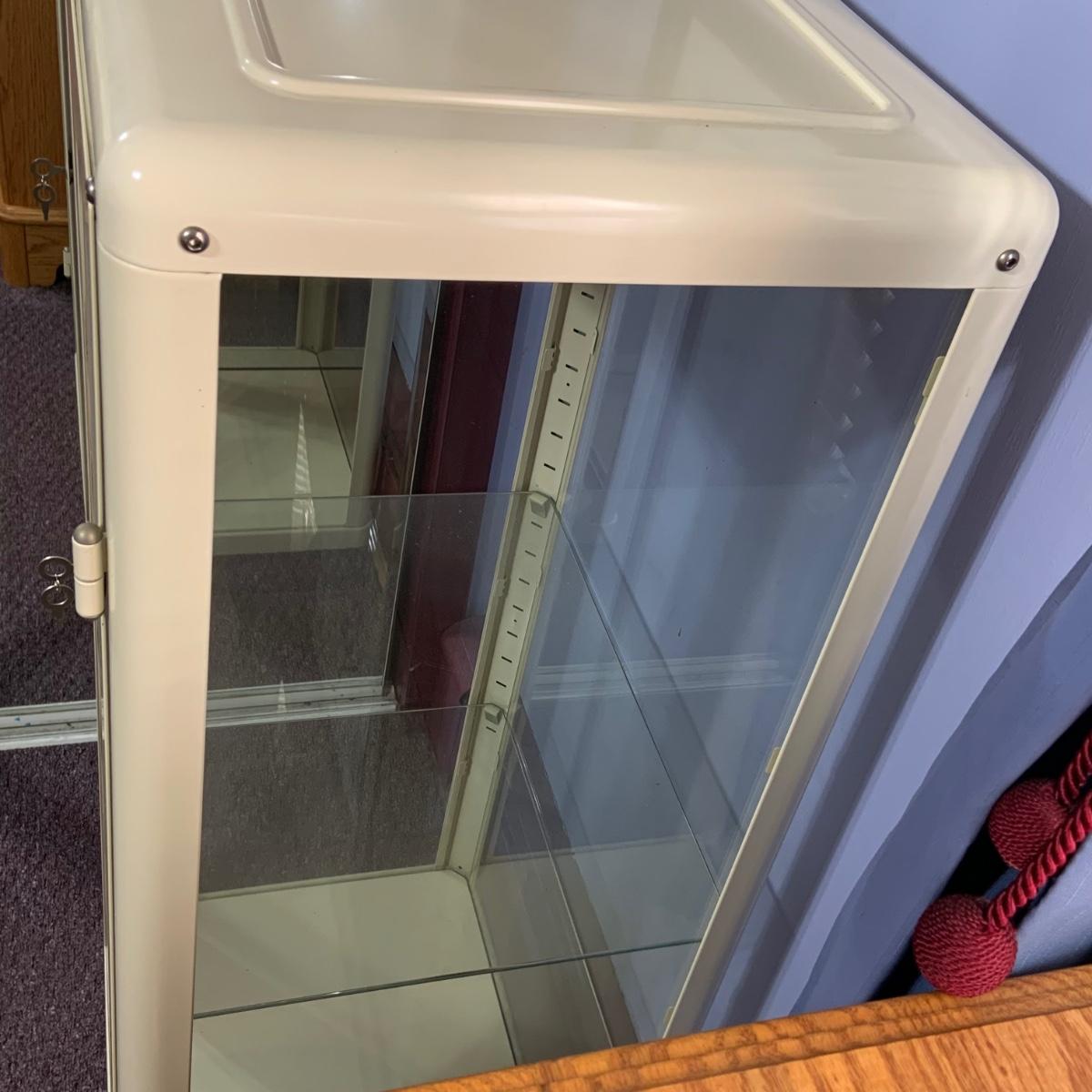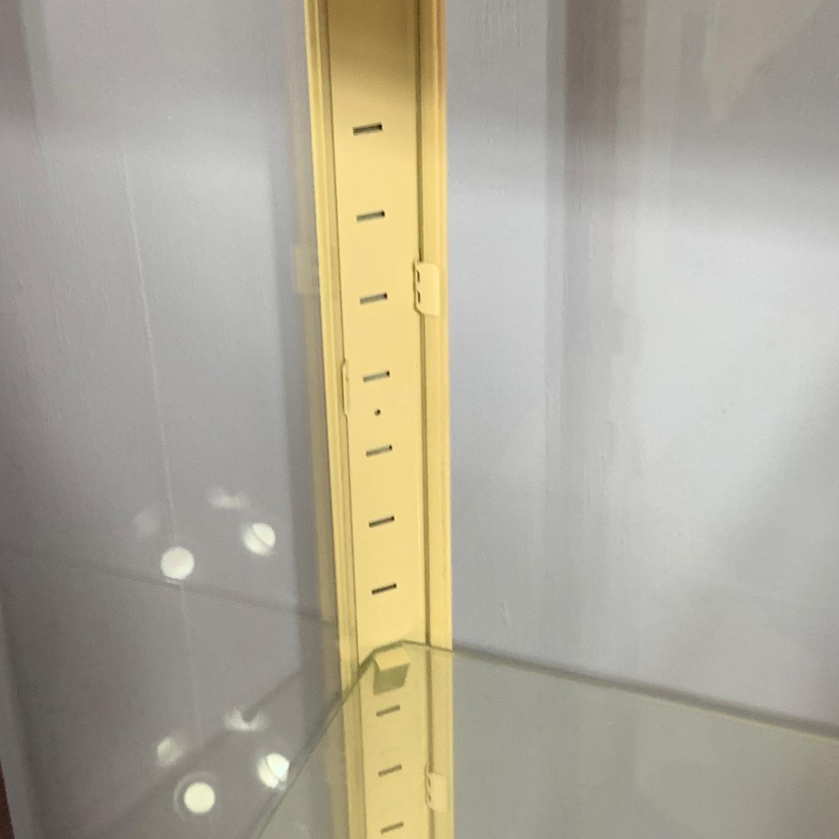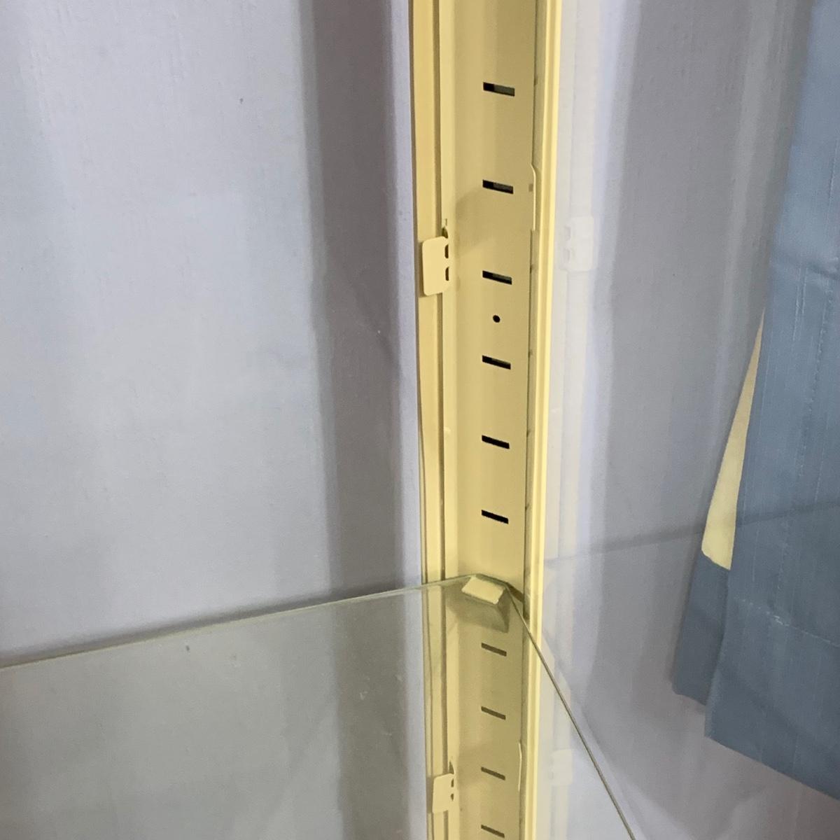 LOT:28: Yellow Metal and Glass Display Cabinet with Glass Shelves, Lock and Key.