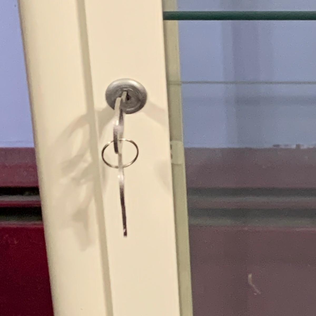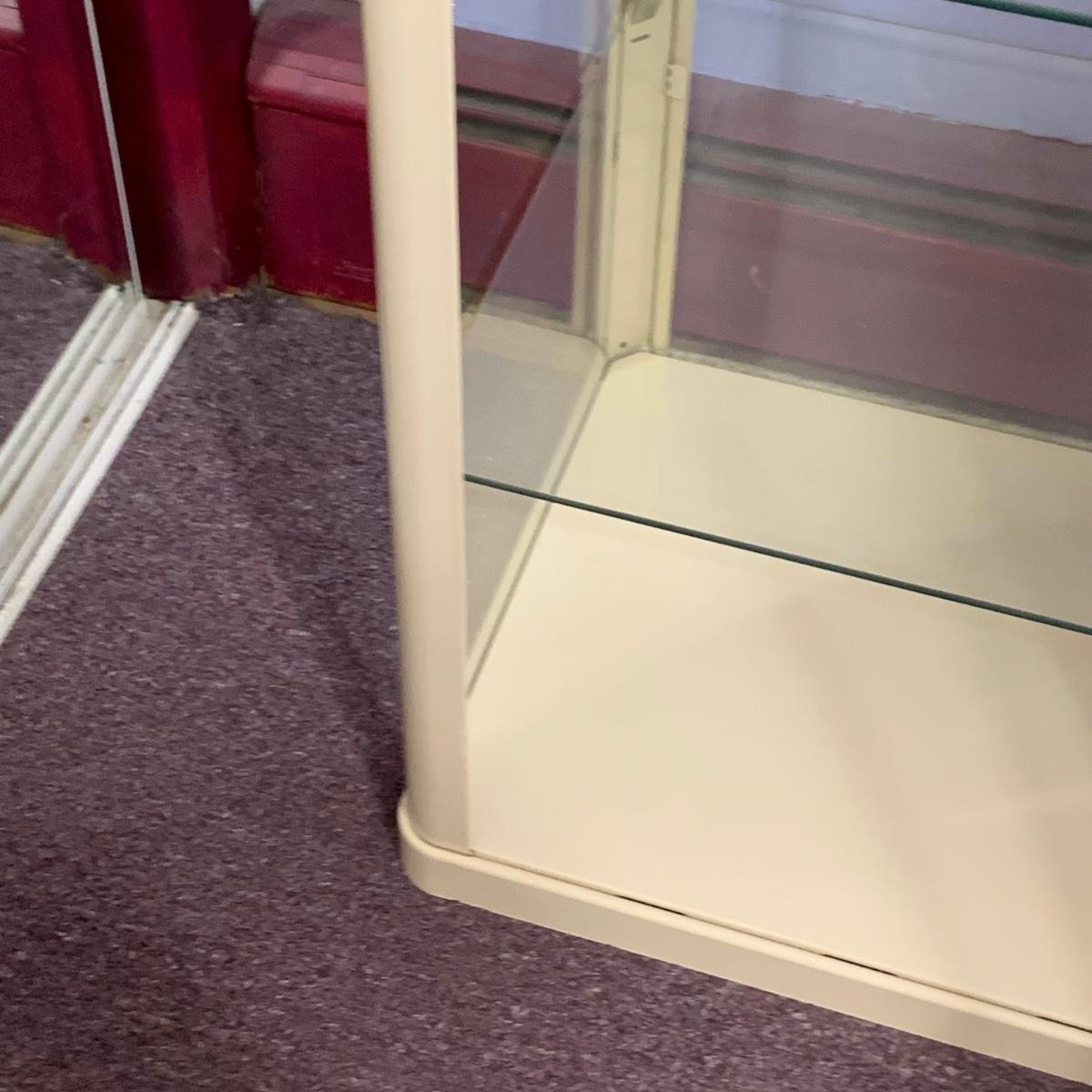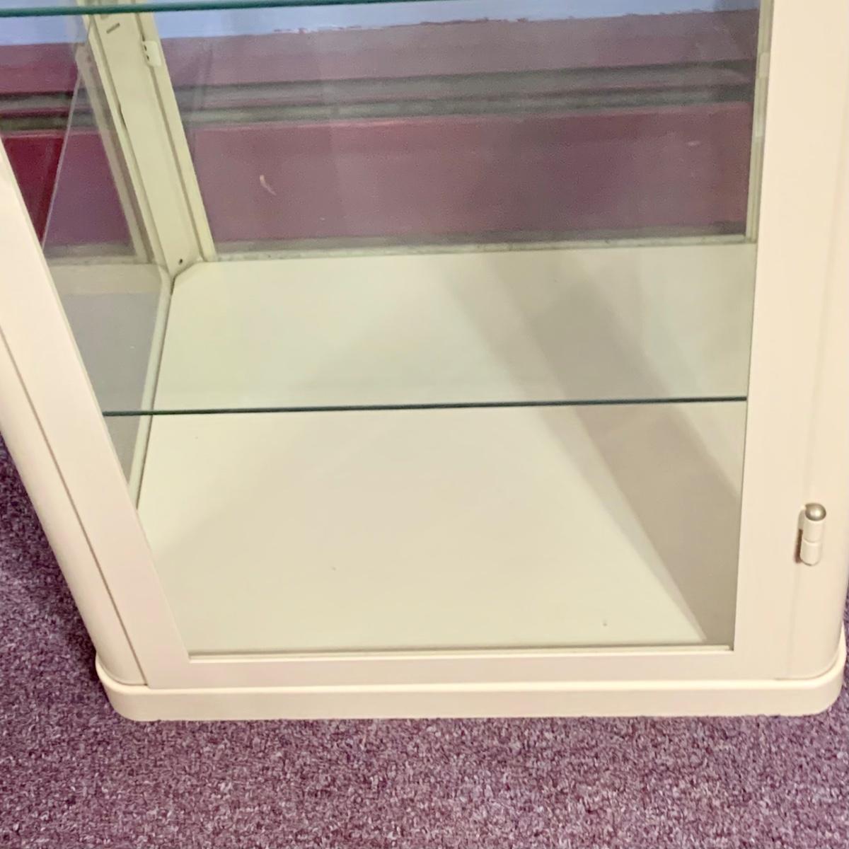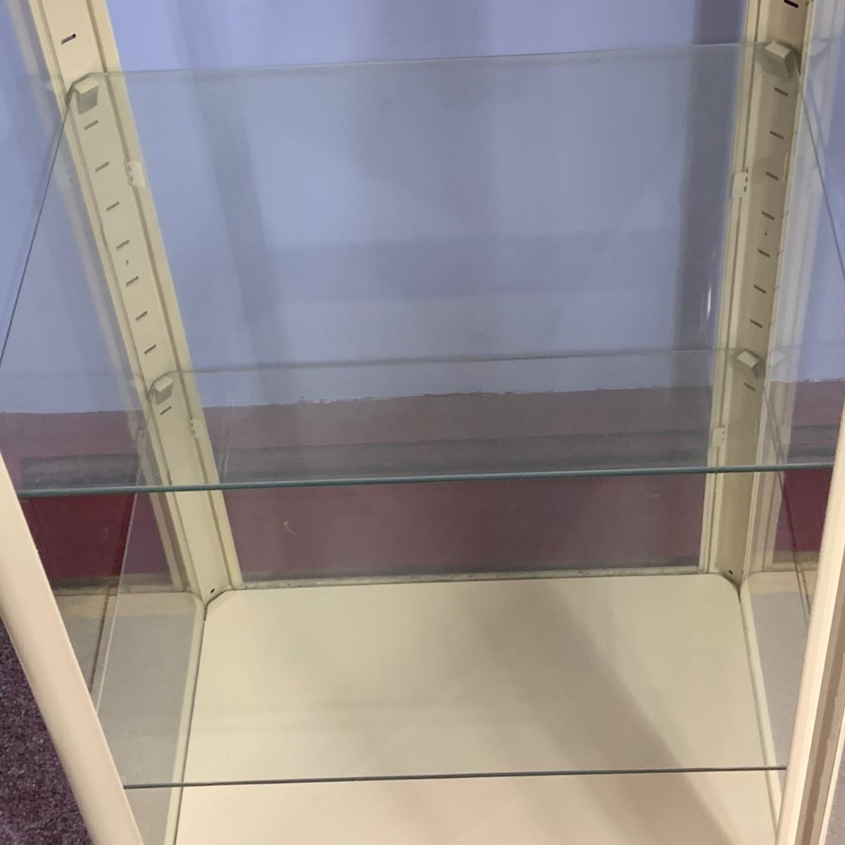 LOT:28: Yellow Metal and Glass Display Cabinet with Glass Shelves, Lock and Key.