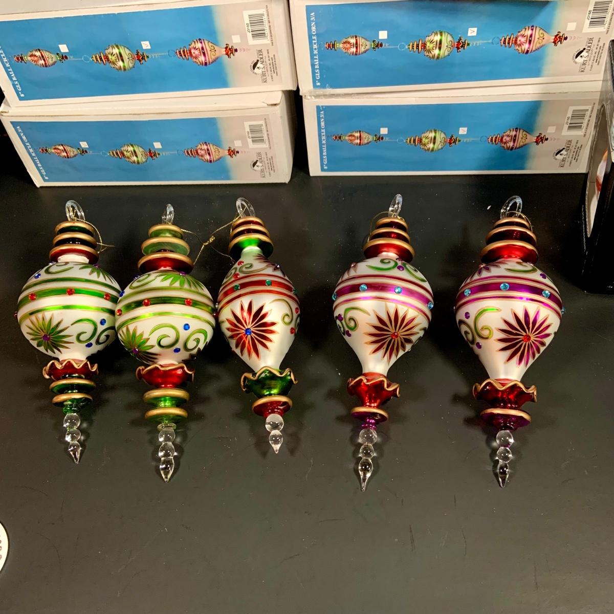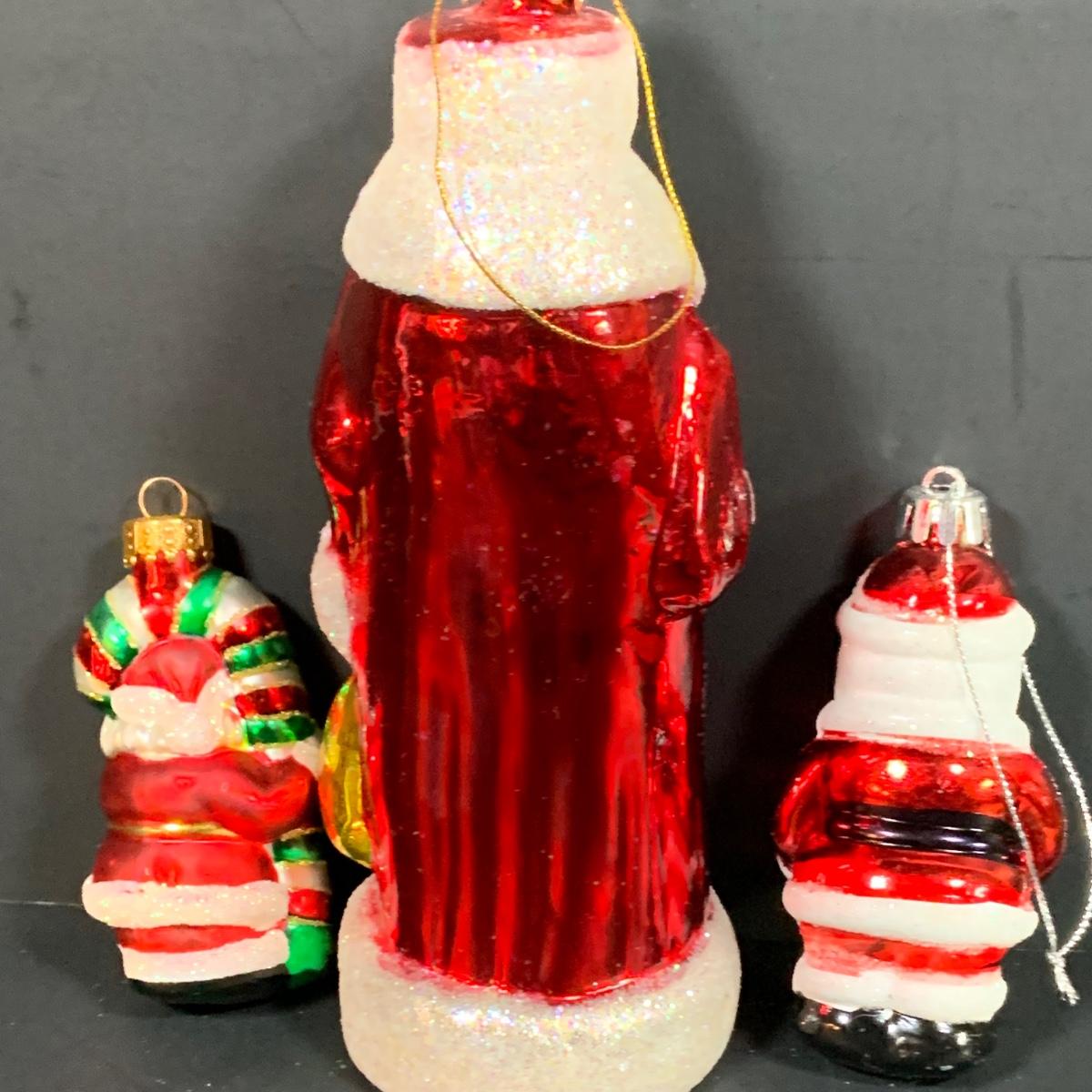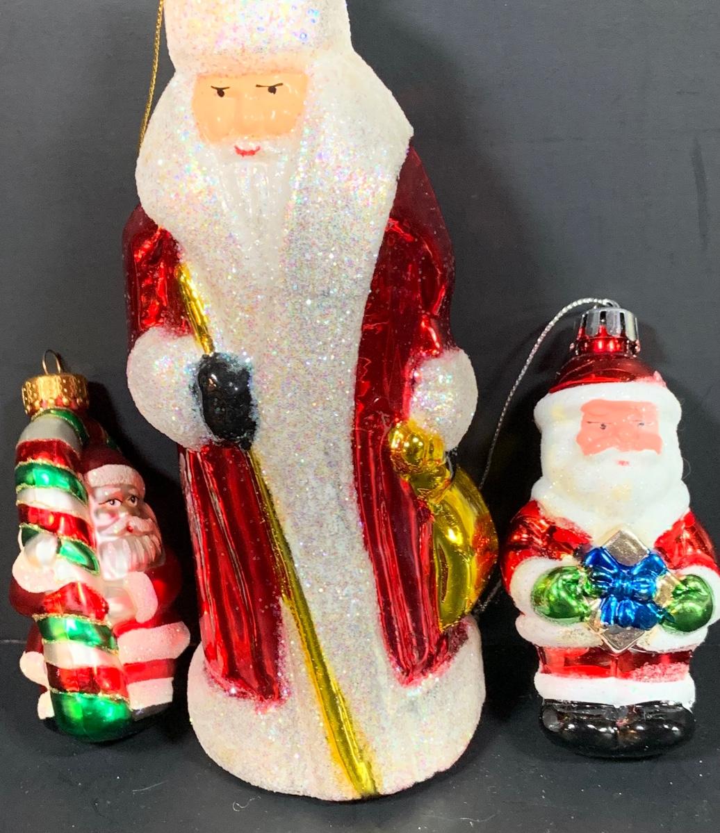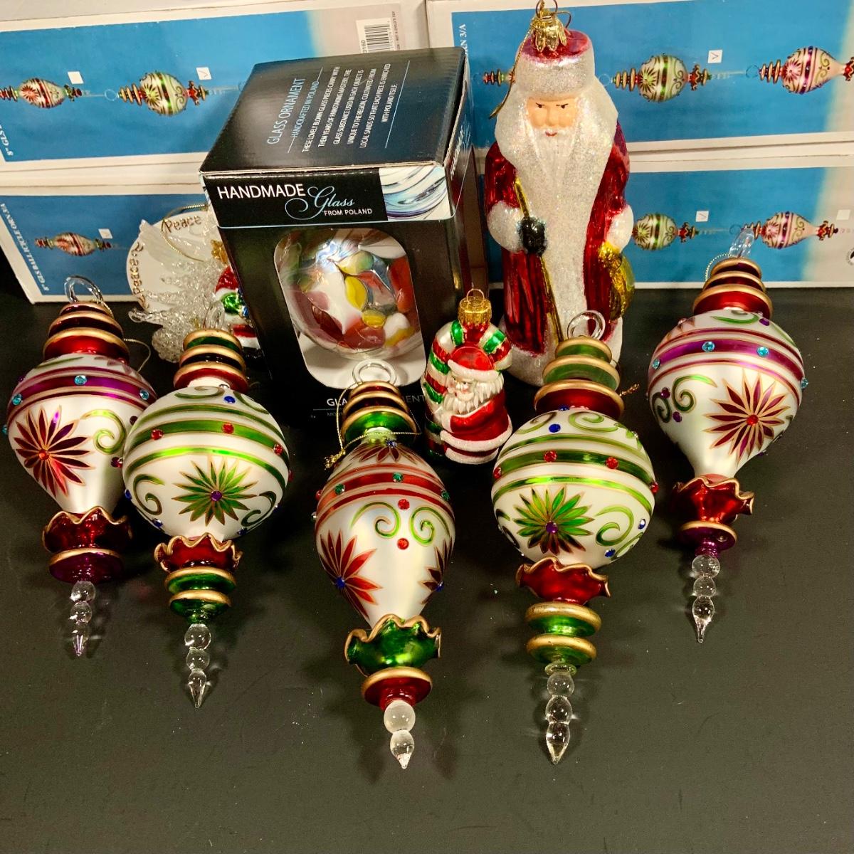 LOT:42: Beautiful Glass Christmas Ornaments Featuring a Handmade Glass Bulb from Poland, Kurt Adler Glass Icicle Ornaments and Santa Glass Ornaments