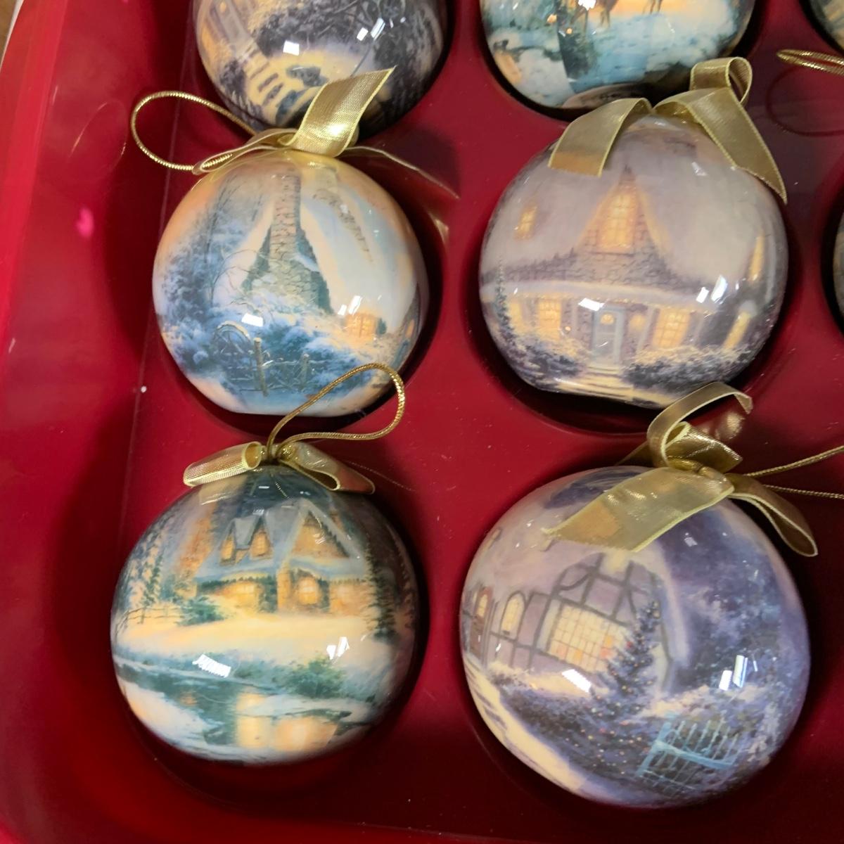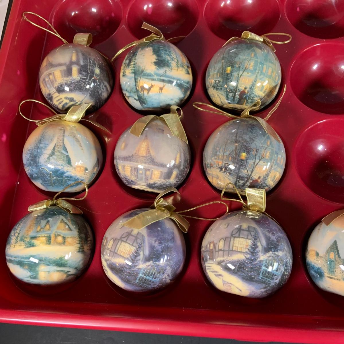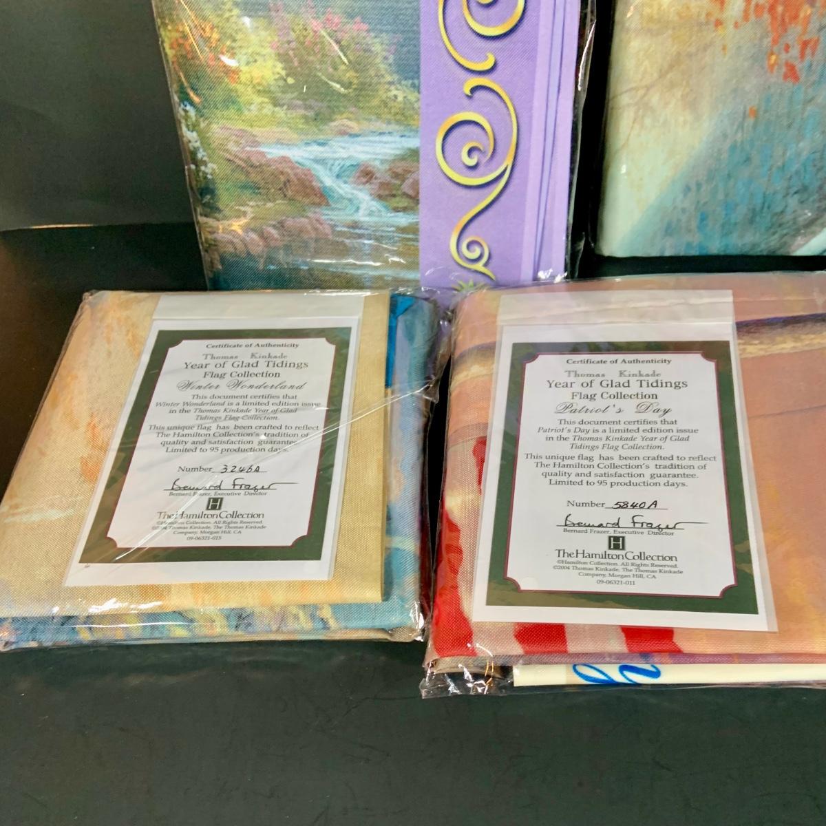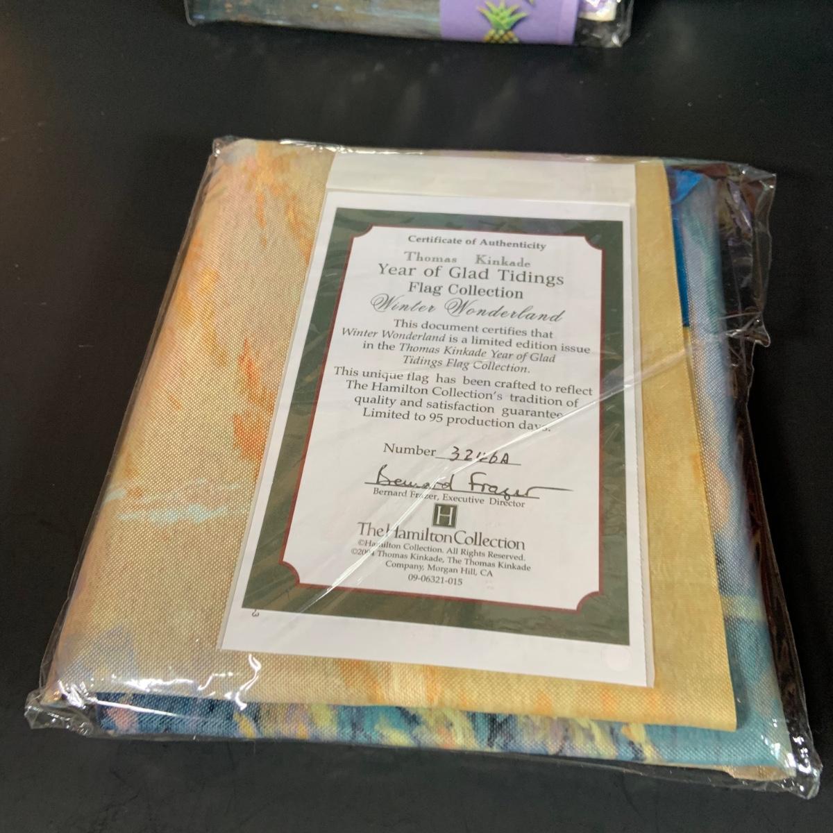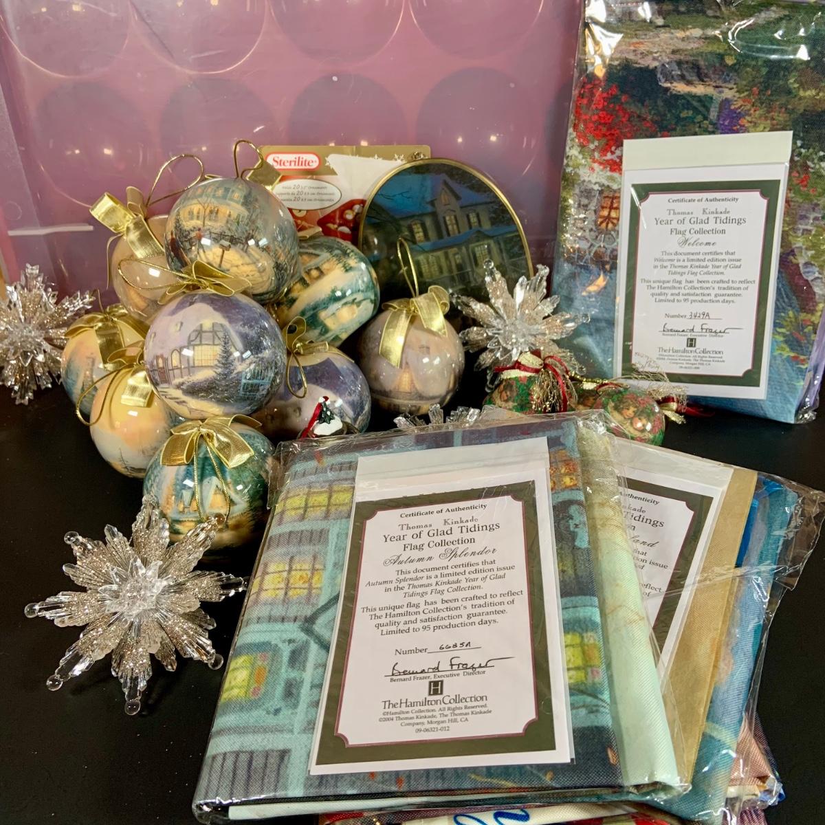 LOT:47: Collection of Thomas Kinkade Christmas Ornaments, Hamilton Collection Thomas Kinkade Seasonal Flags, a Sterilite Ornament Storage Container and More