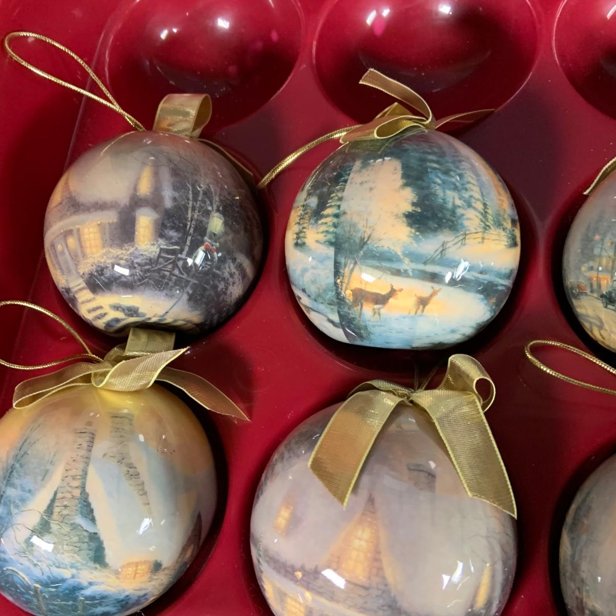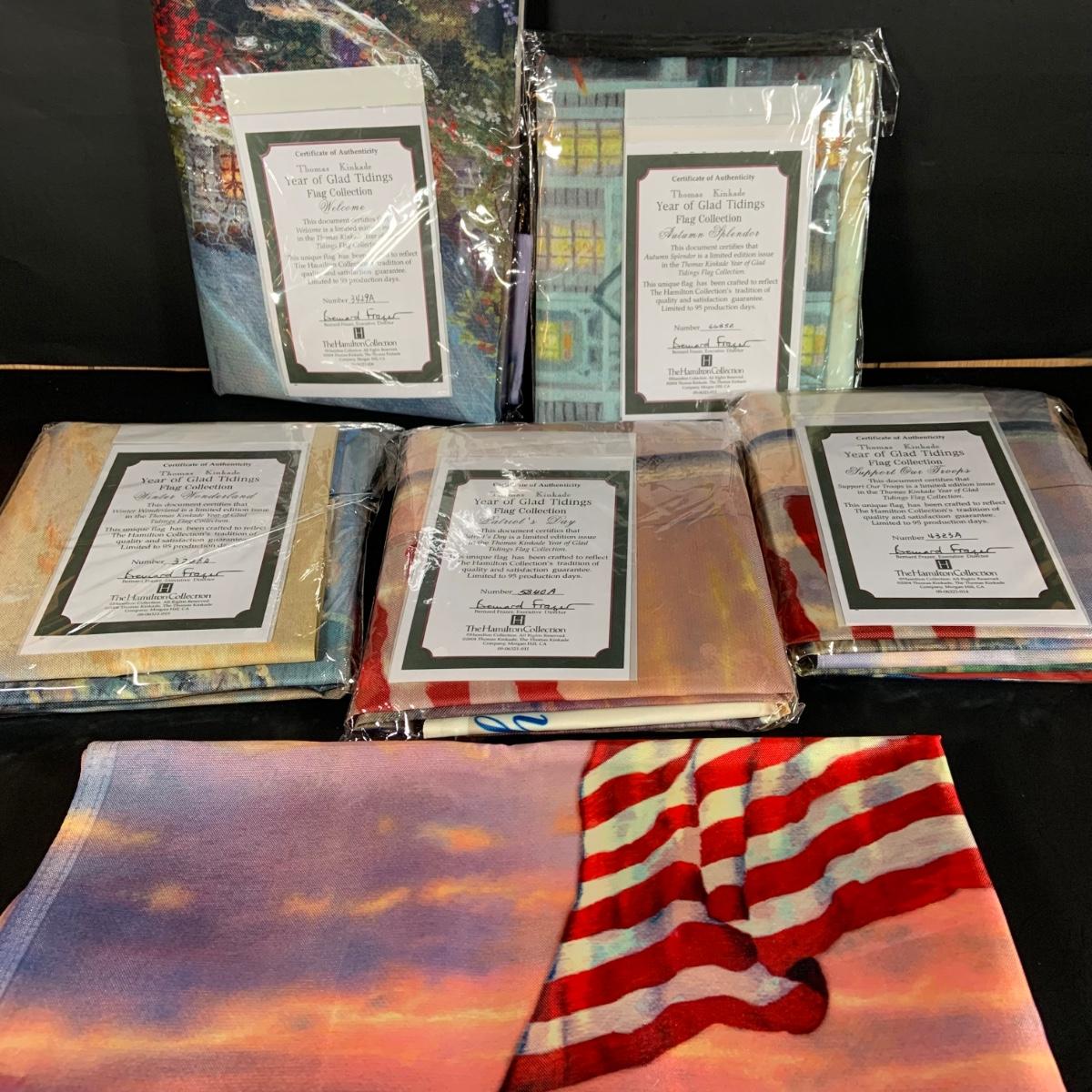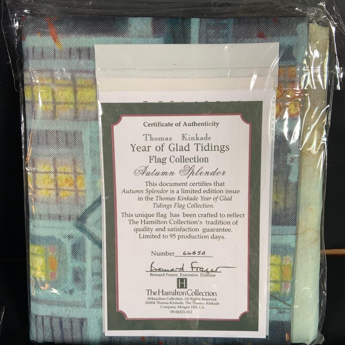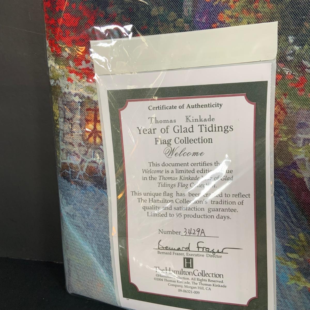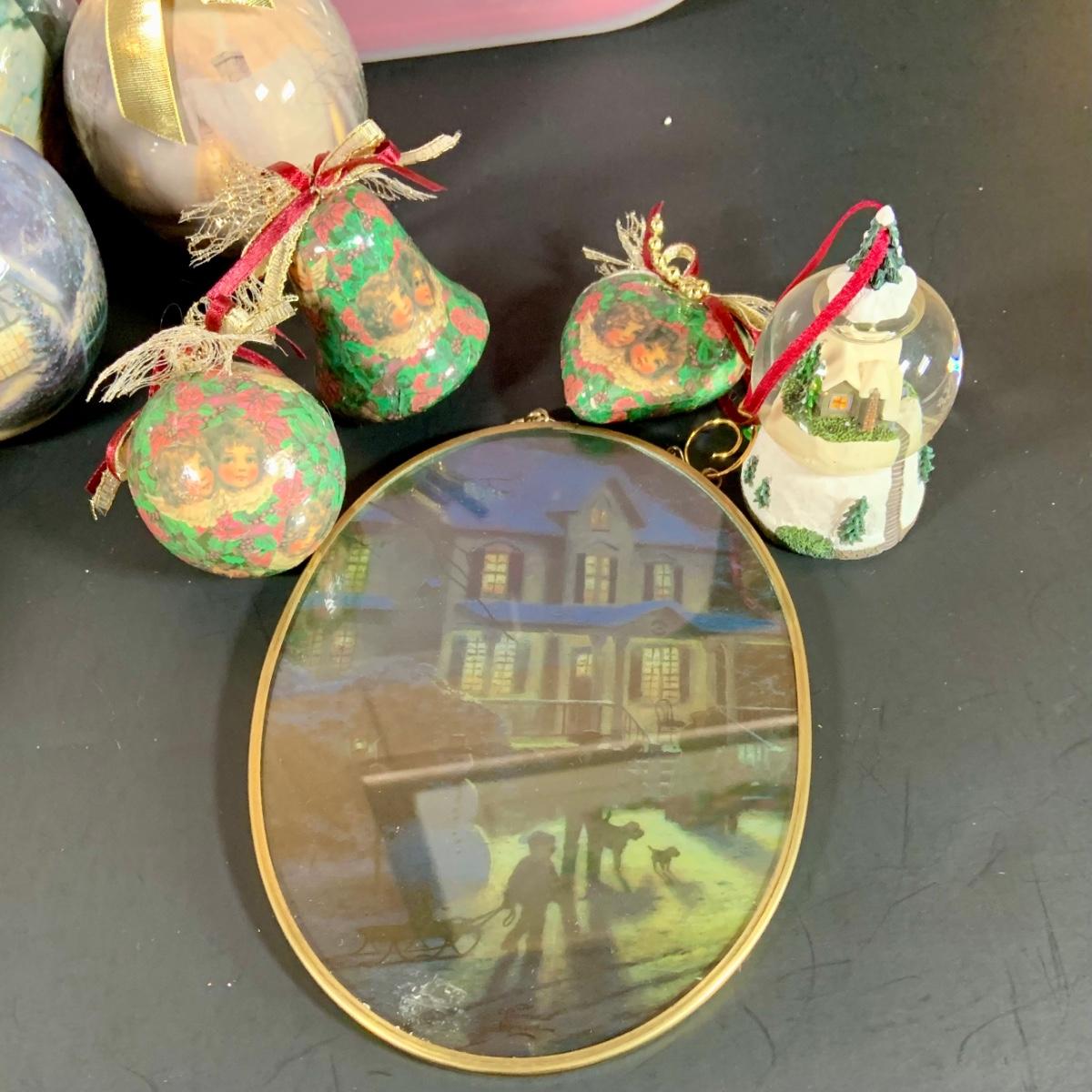 LOT:47: Collection of Thomas Kinkade Christmas Ornaments, Hamilton Collection Thomas Kinkade Seasonal Flags, a Sterilite Ornament Storage Container and More