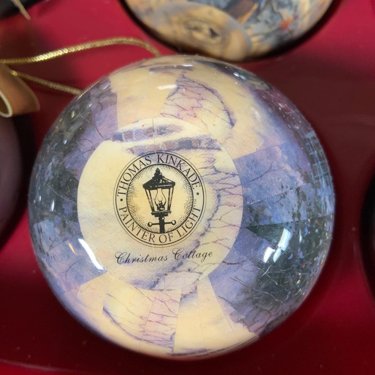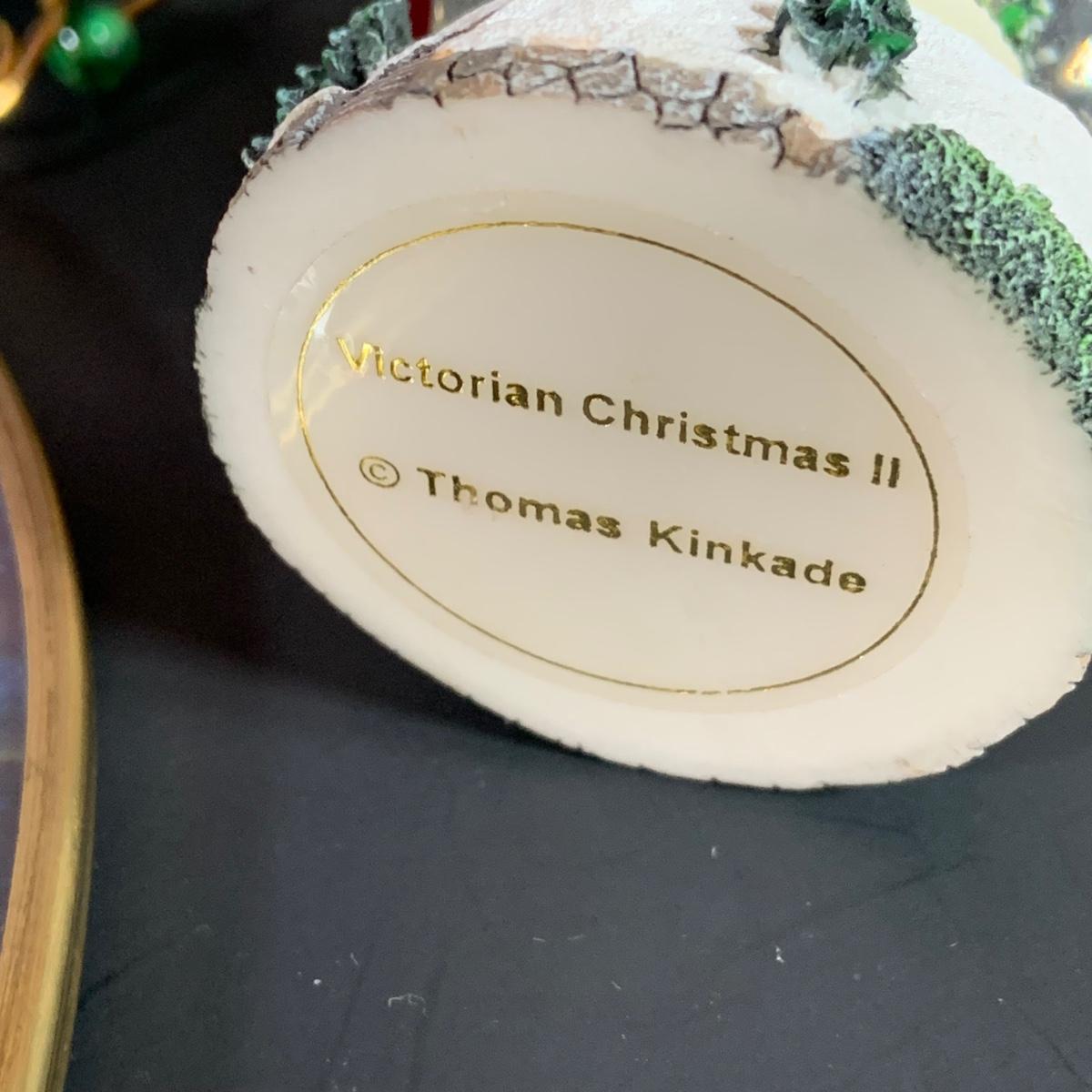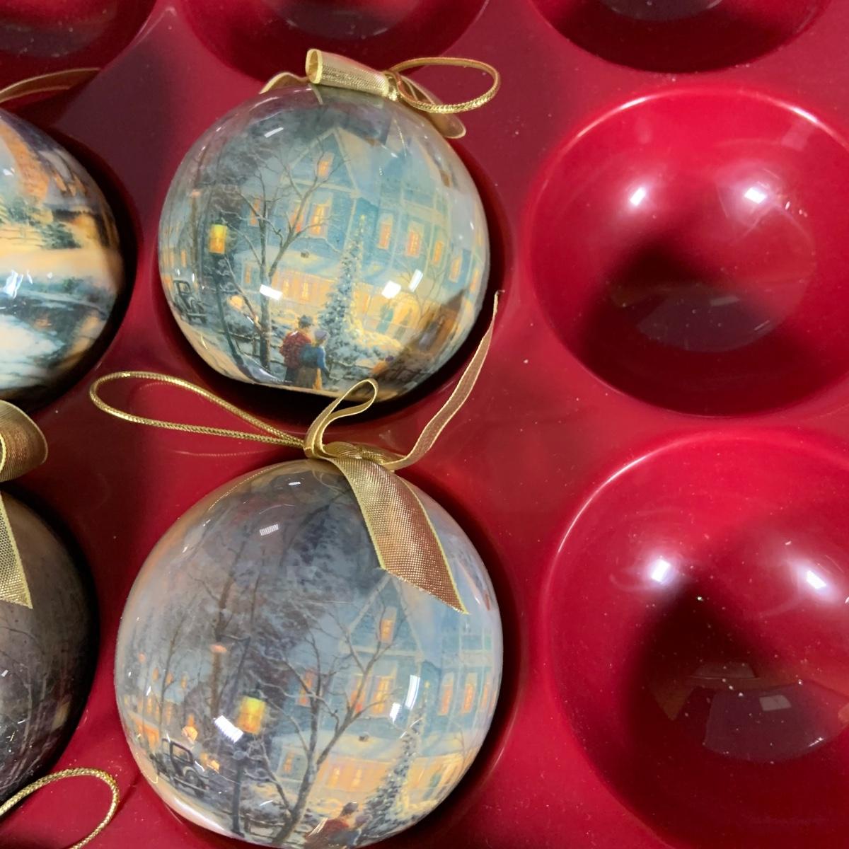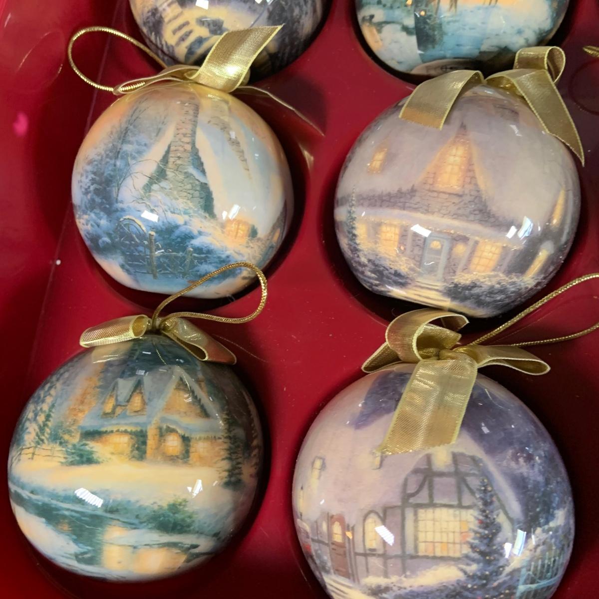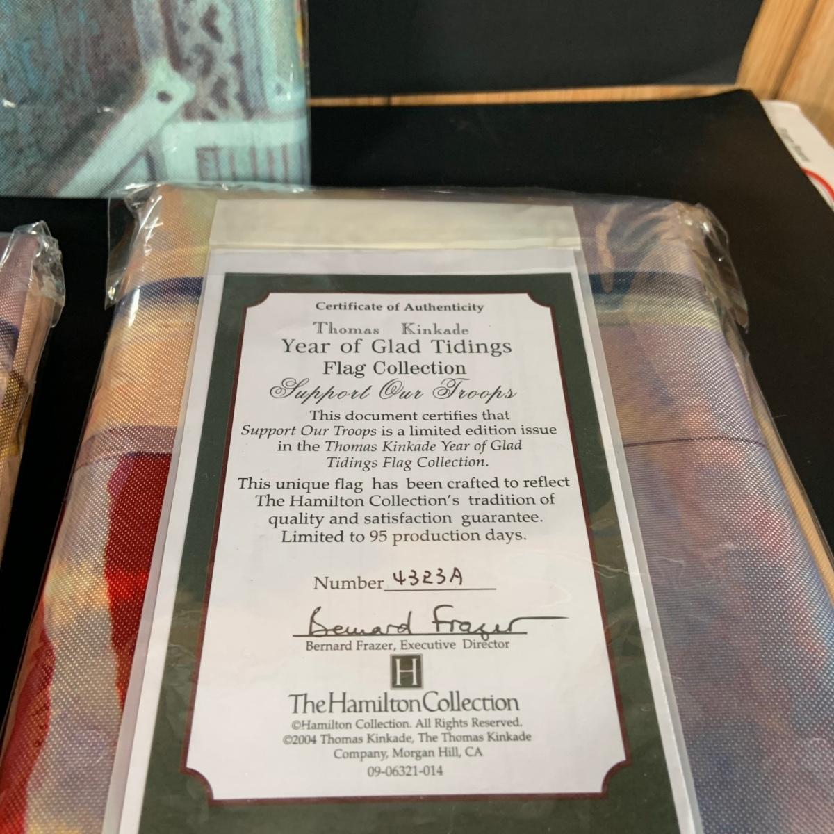 LOT:47: Collection of Thomas Kinkade Christmas Ornaments, Hamilton Collection Thomas Kinkade Seasonal Flags, a Sterilite Ornament Storage Container and More