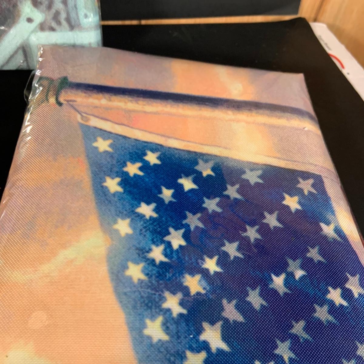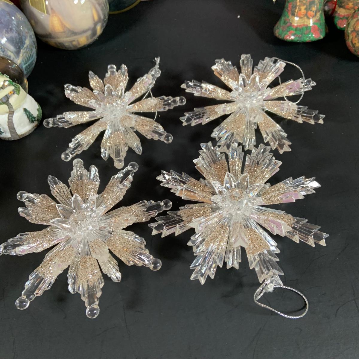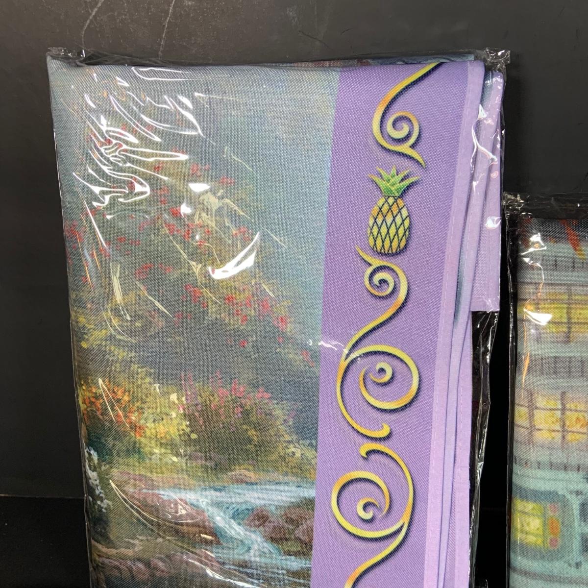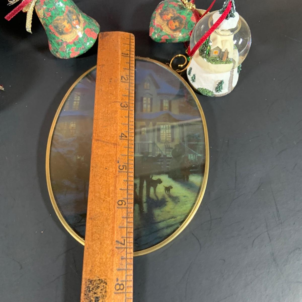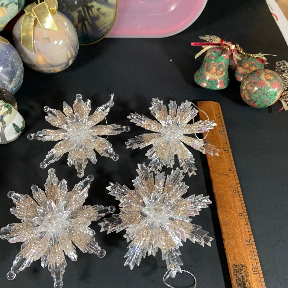 LOT:47: Collection of Thomas Kinkade Christmas Ornaments, Hamilton Collection Thomas Kinkade Seasonal Flags, a Sterilite Ornament Storage Container and More