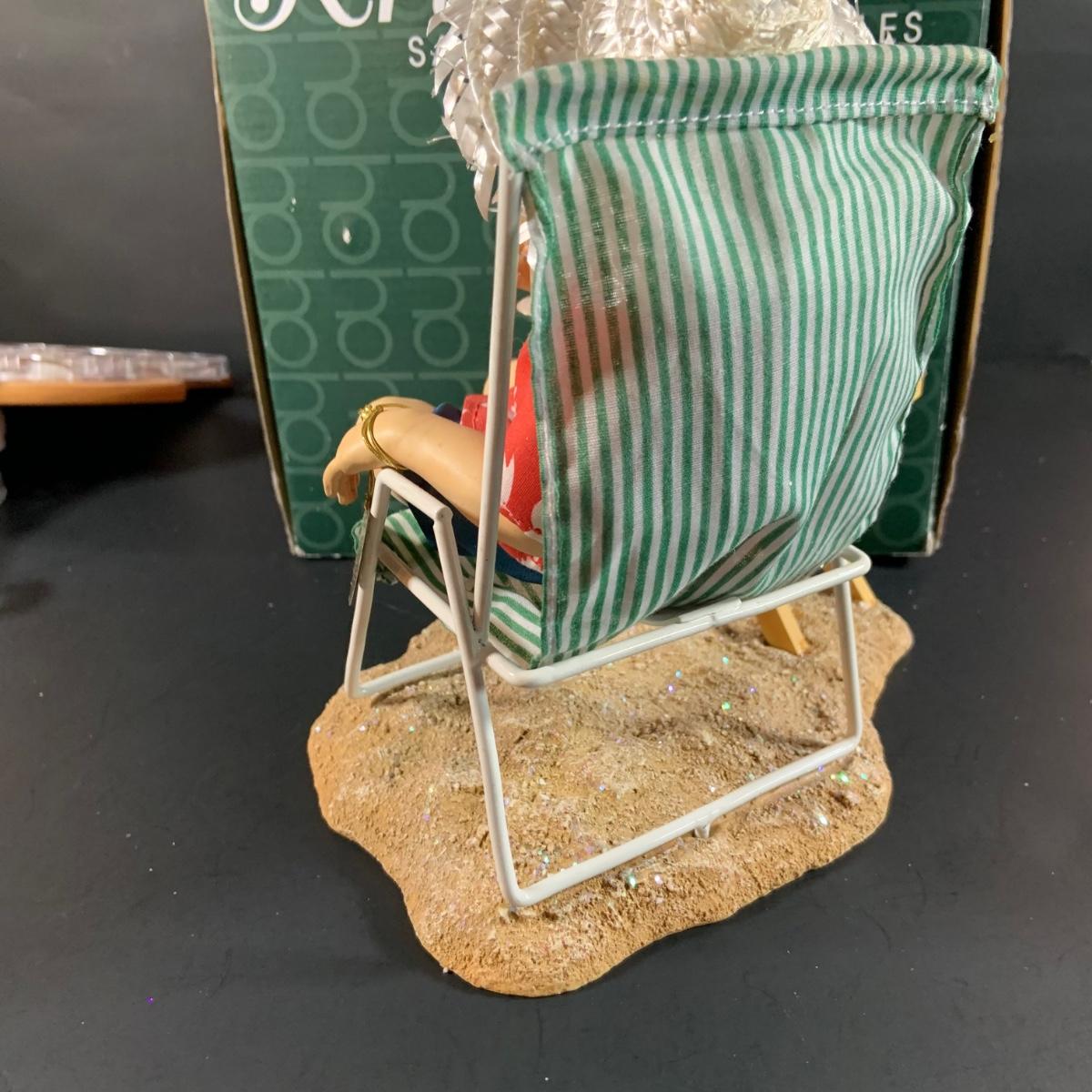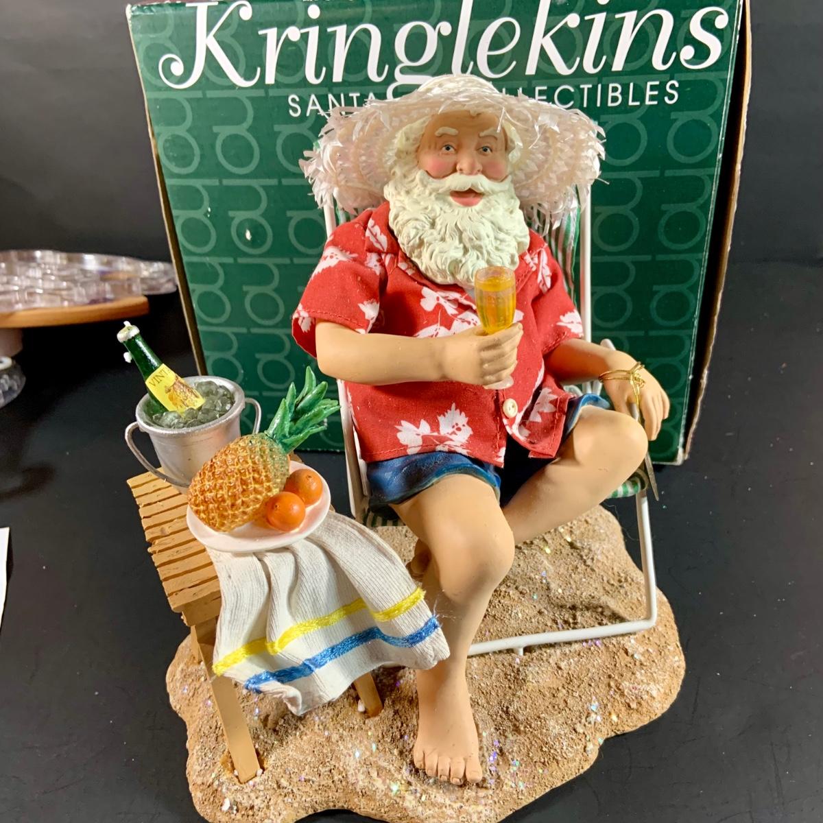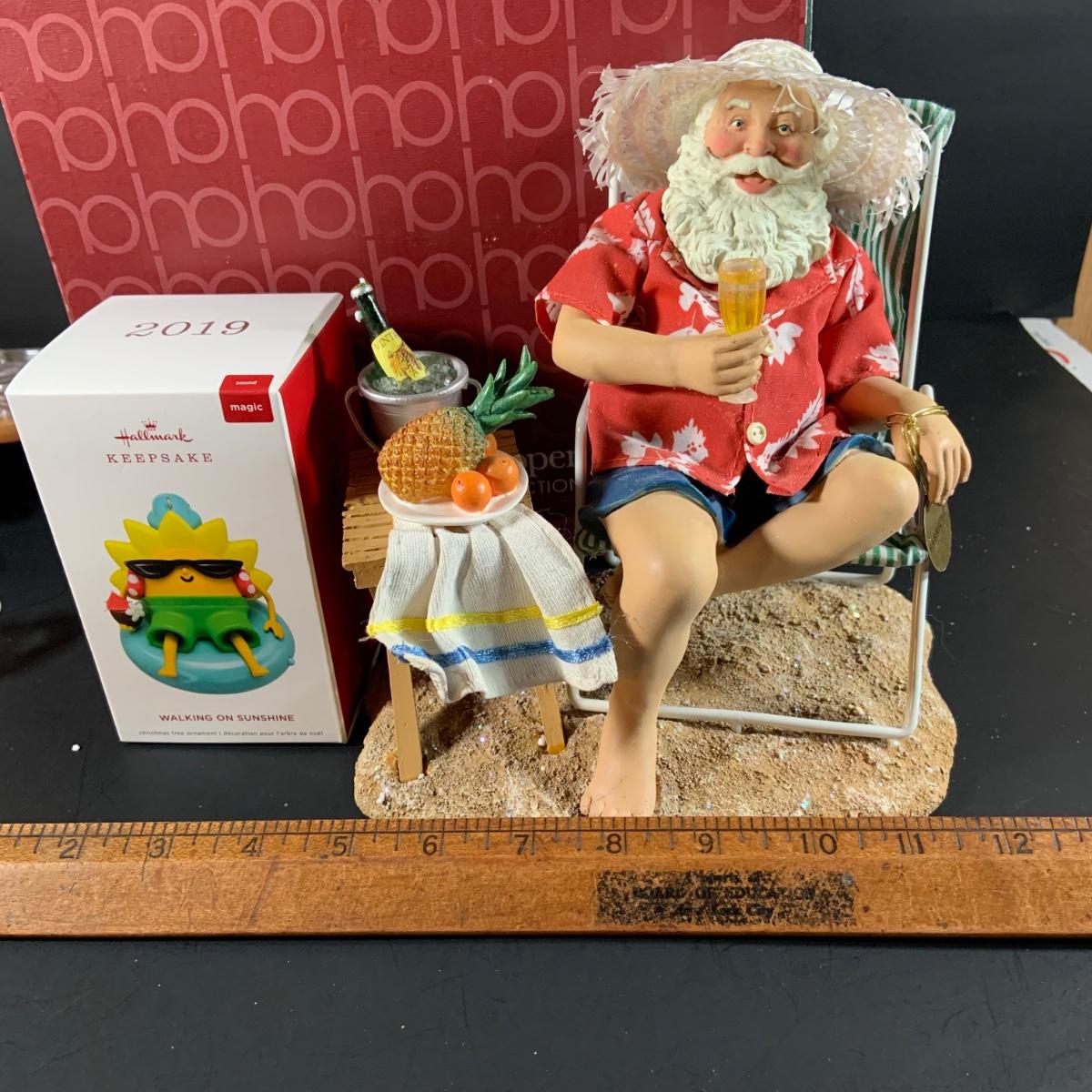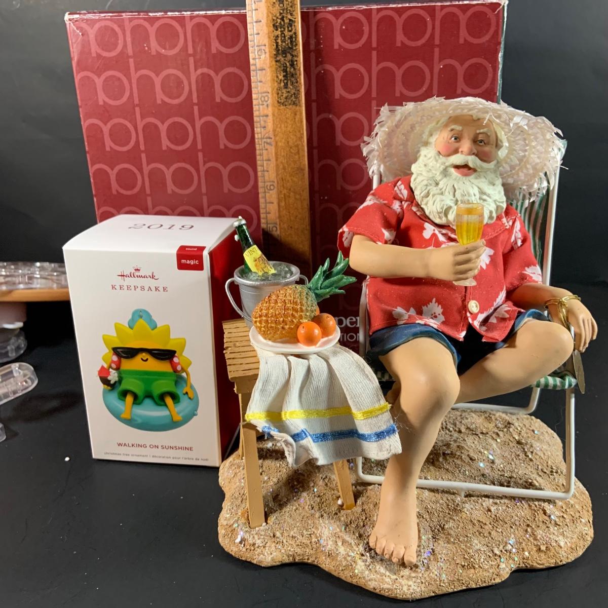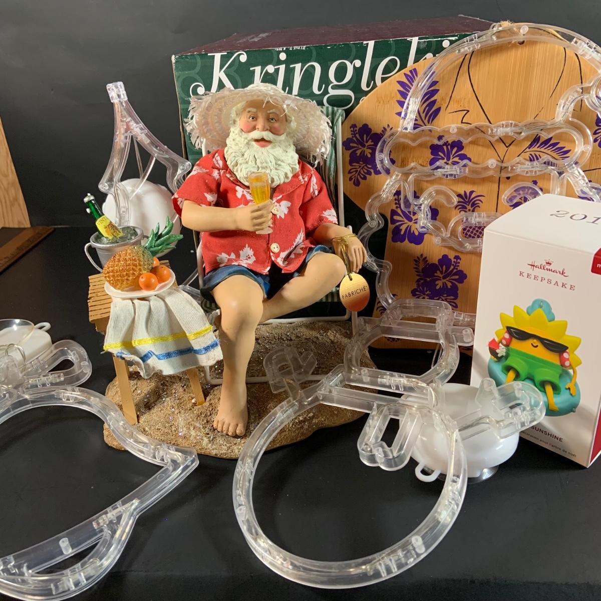 LOT:50: Santa on Vacation Statue by Ashley Cooper, Hallmark Ornament Bamboo Cutting Board and More