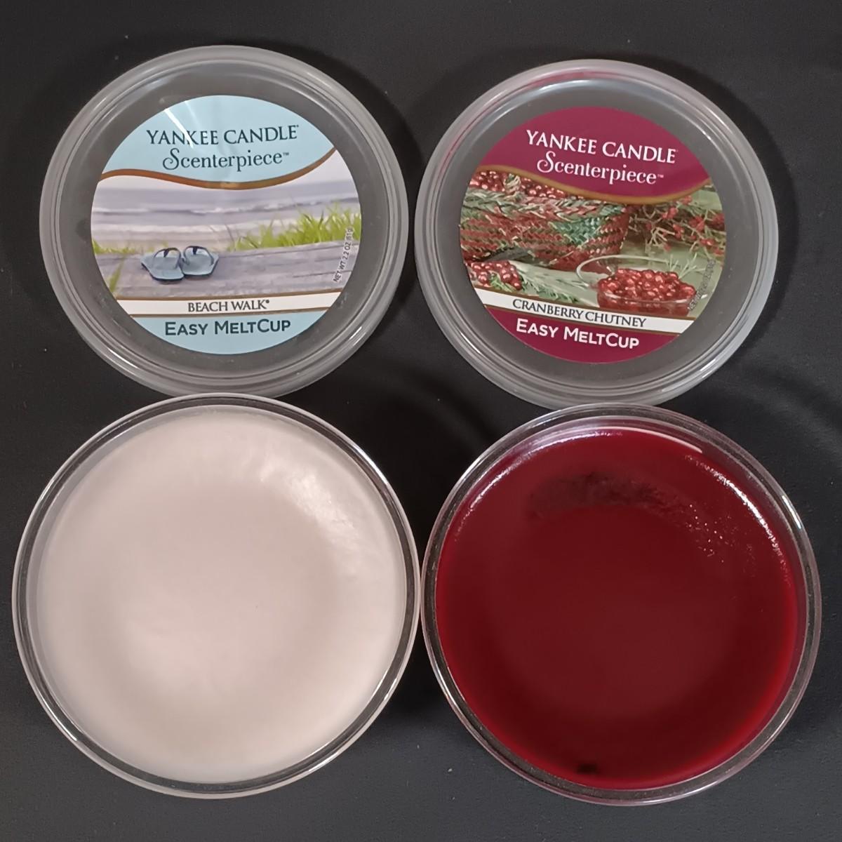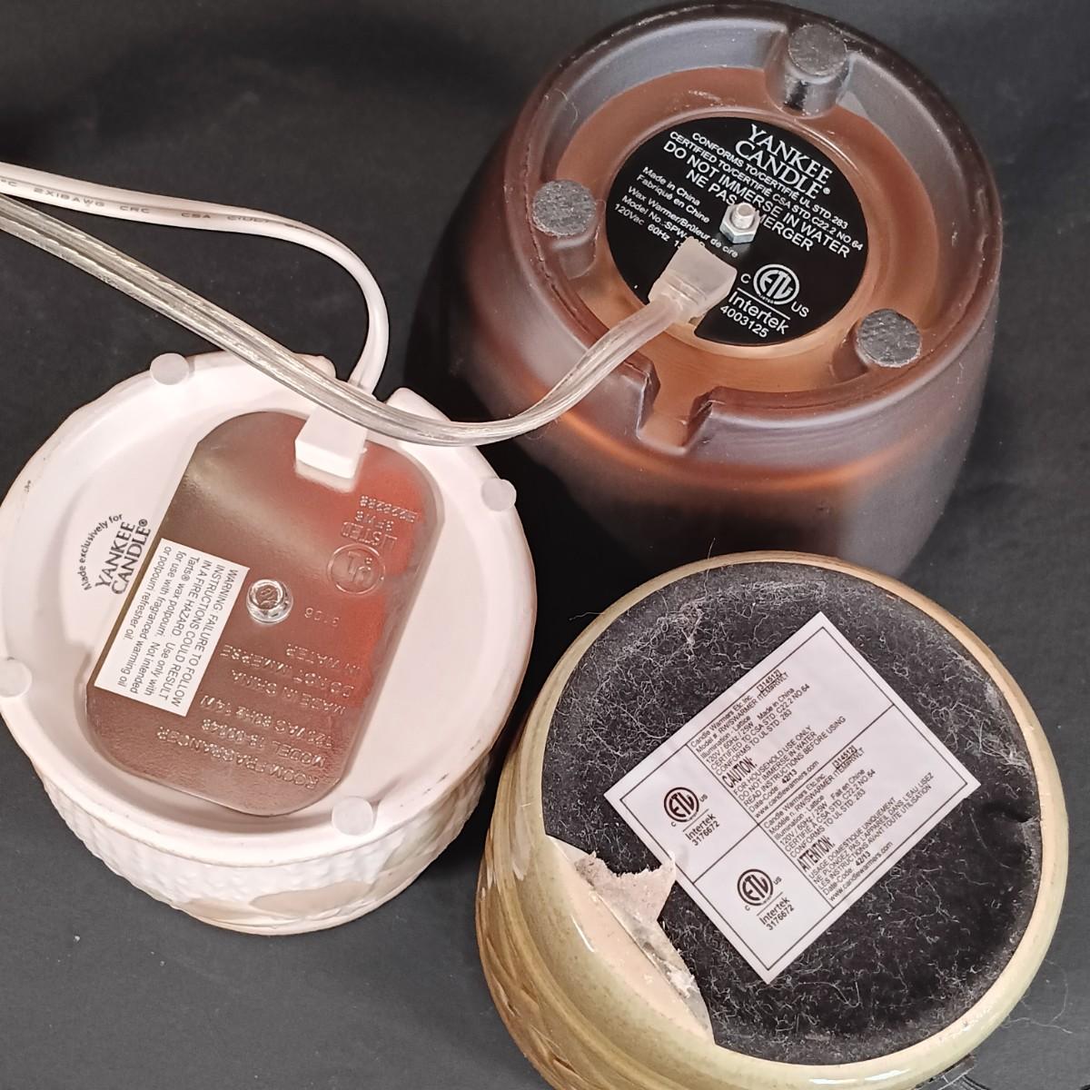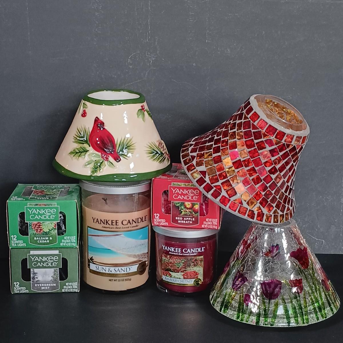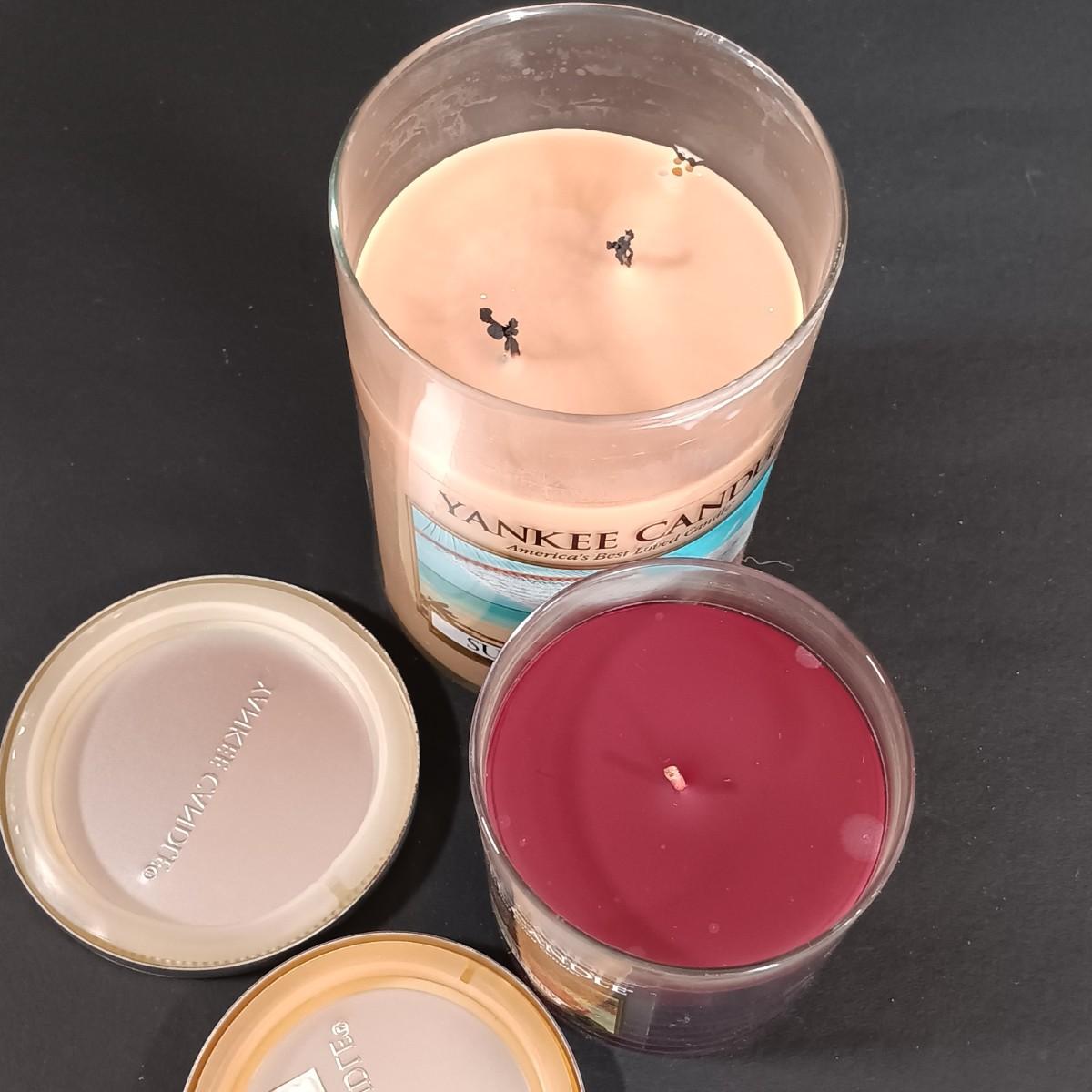 One of the Yankee candles is used, and some of the wax melts are missing.