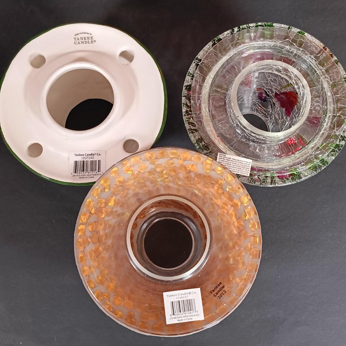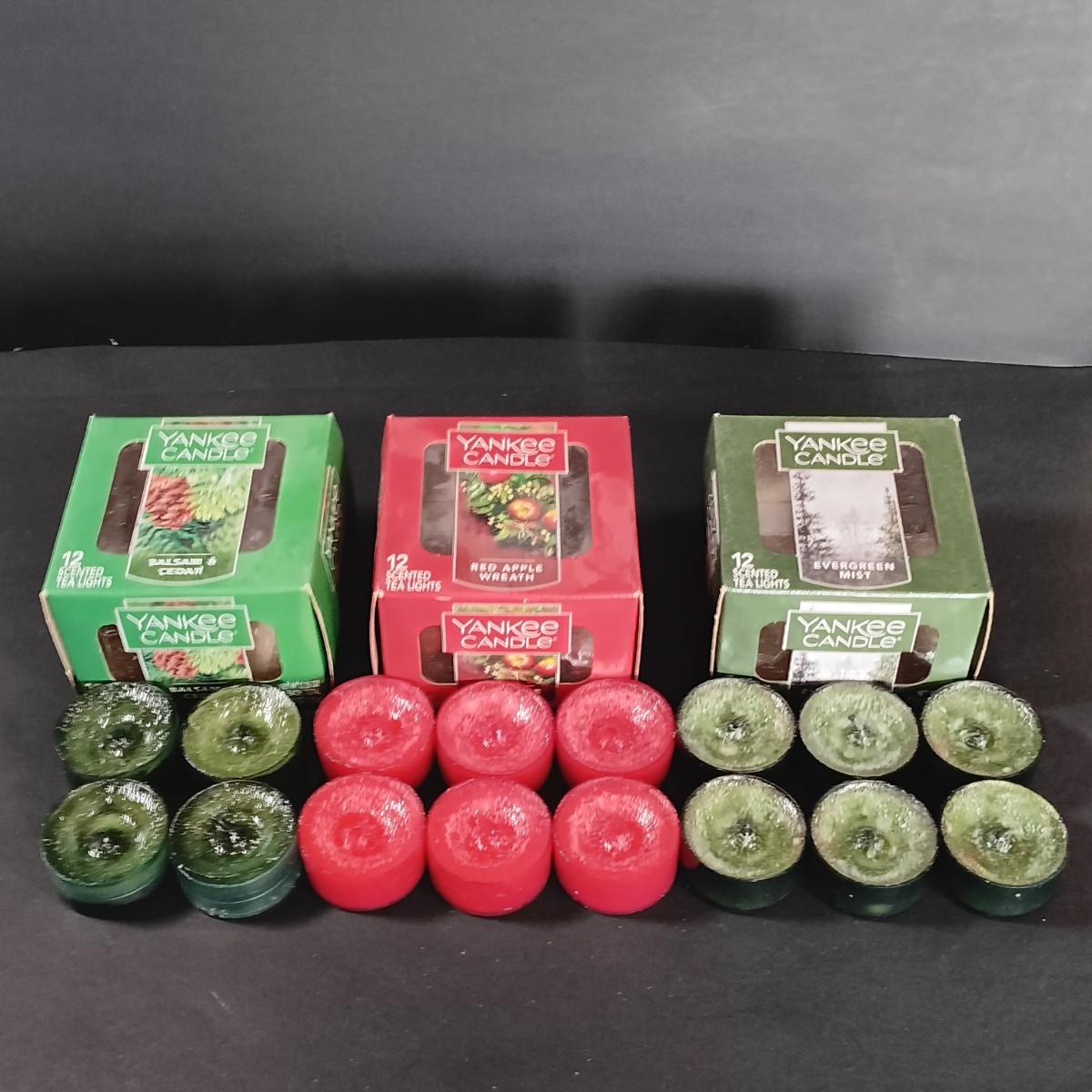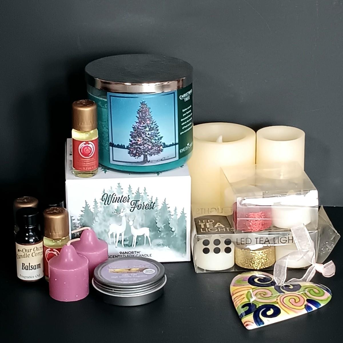 One of the Yankee candles is used, and some of the wax melts are missing.