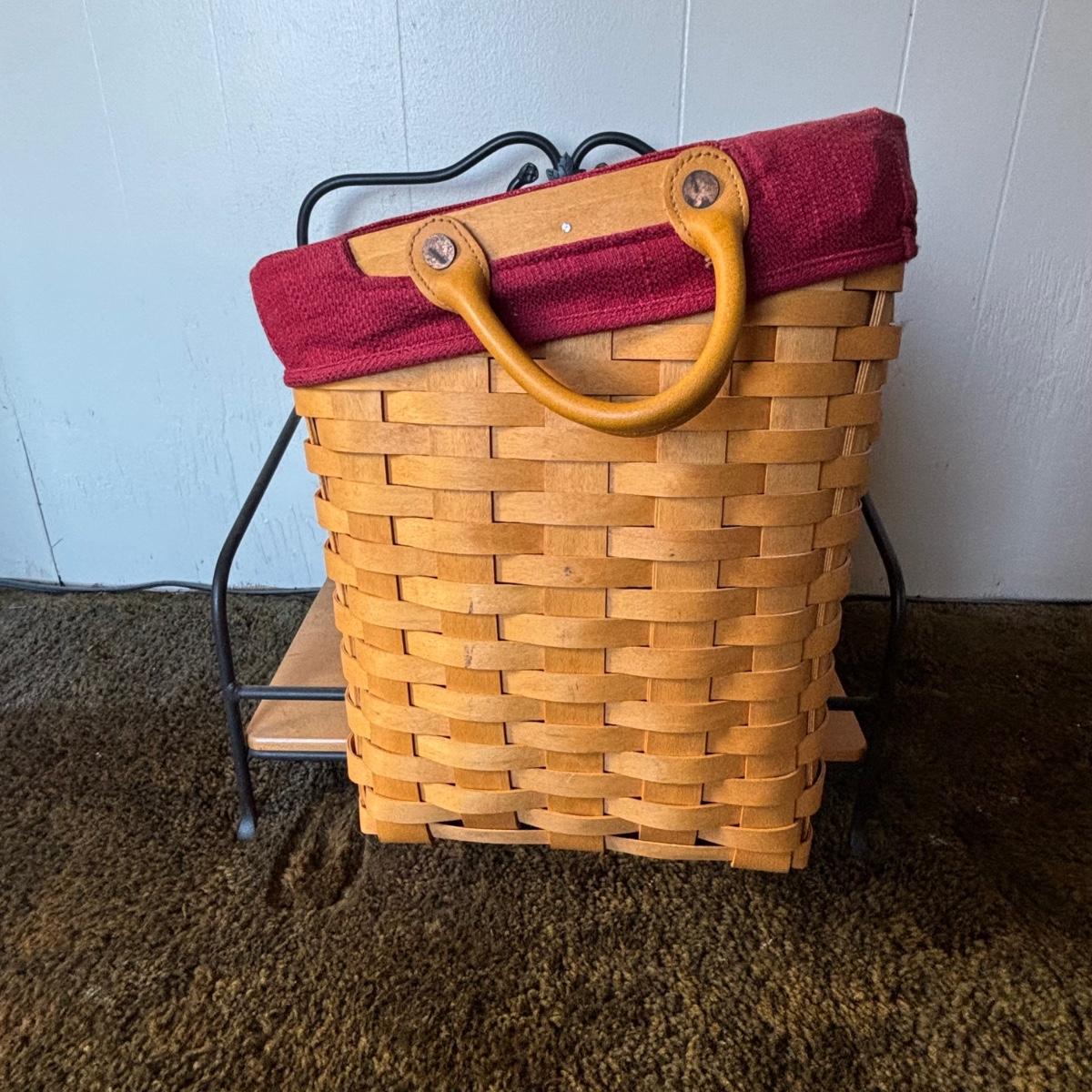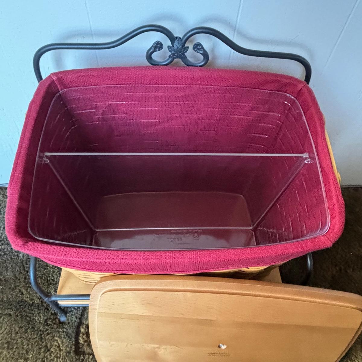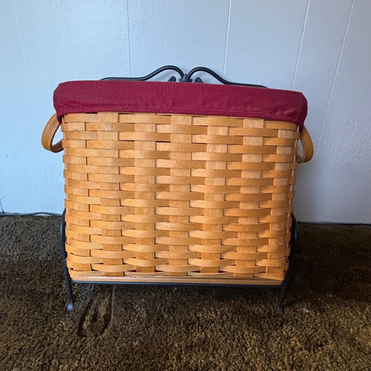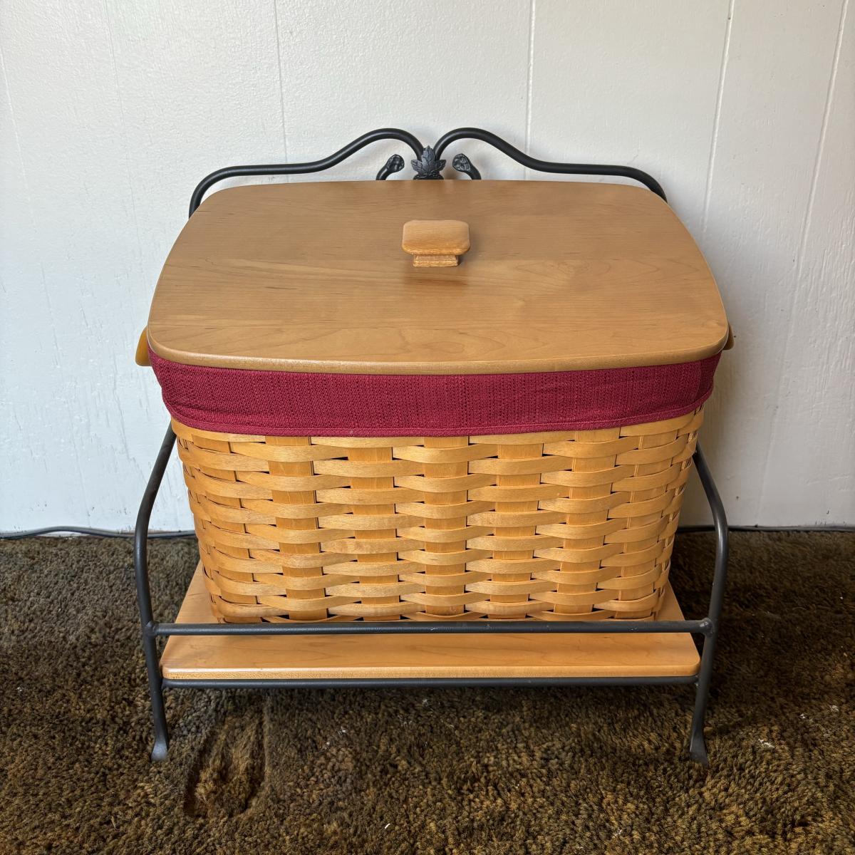 LOT 85: Longaberger Wrought Iron Basket Stand w/Newpaper Basket, Wood Lid, Divided Proctor & Fabric Liner