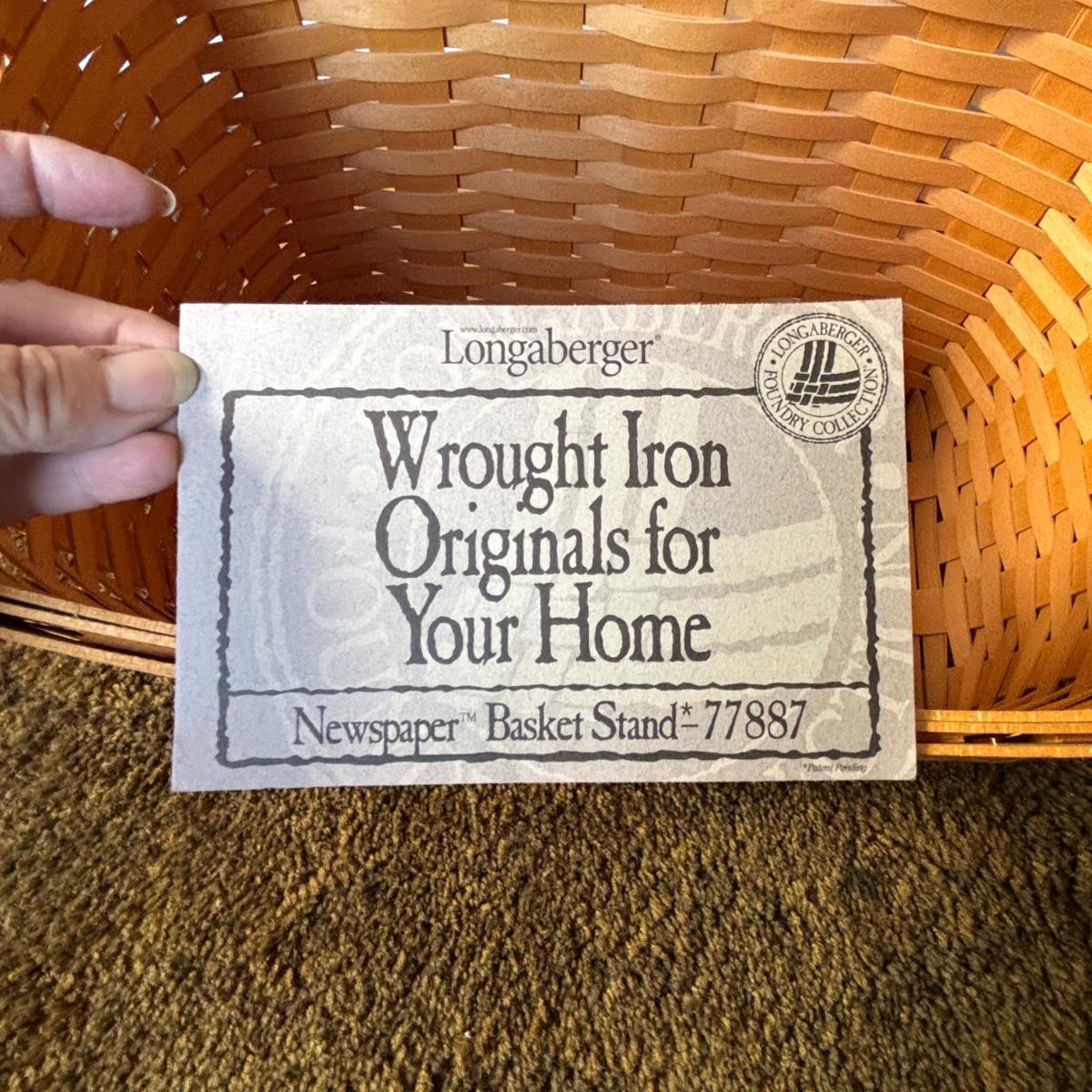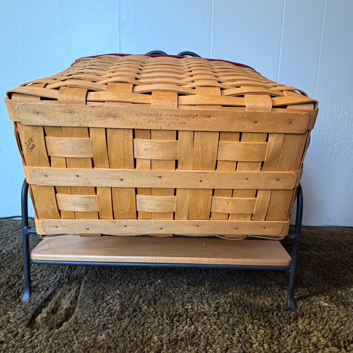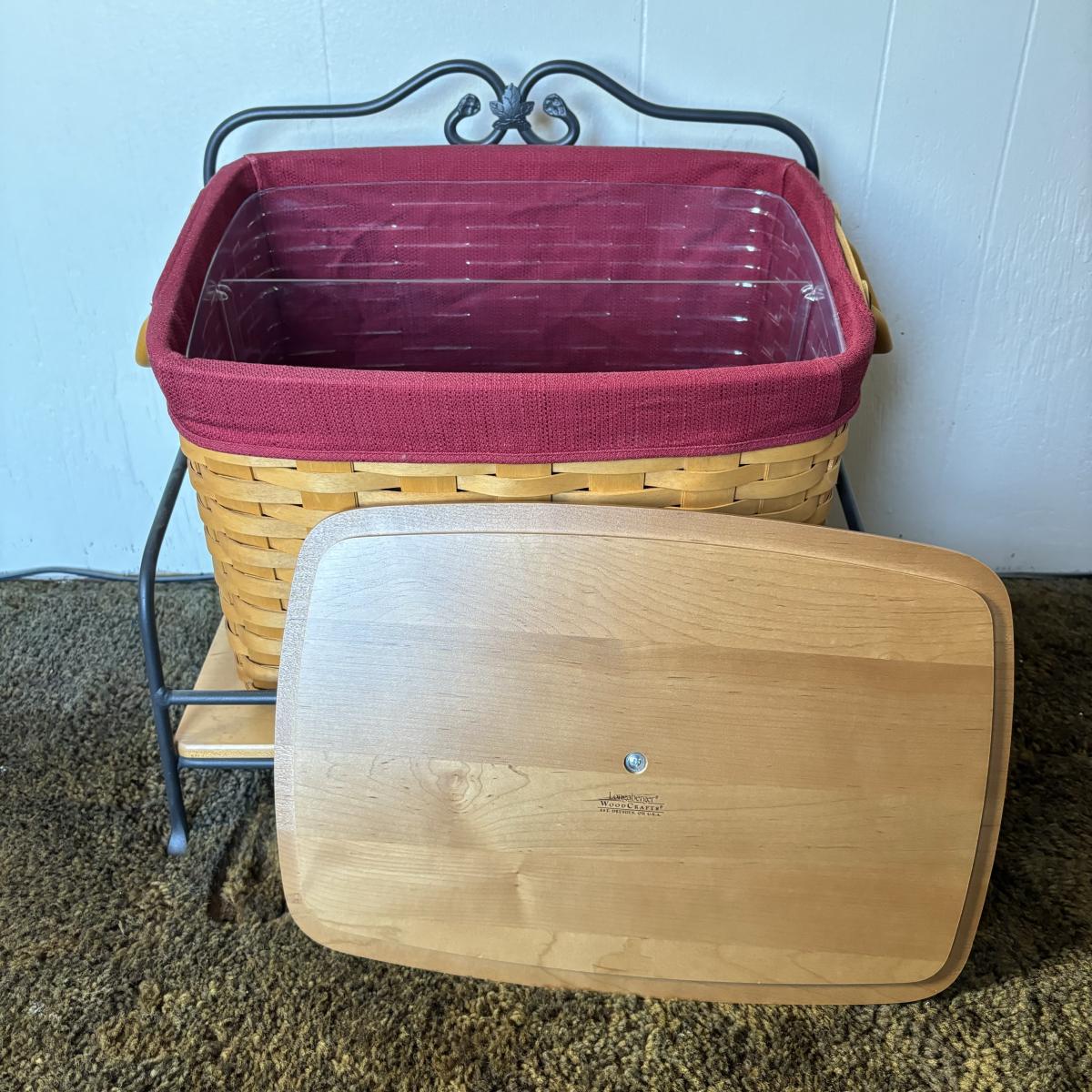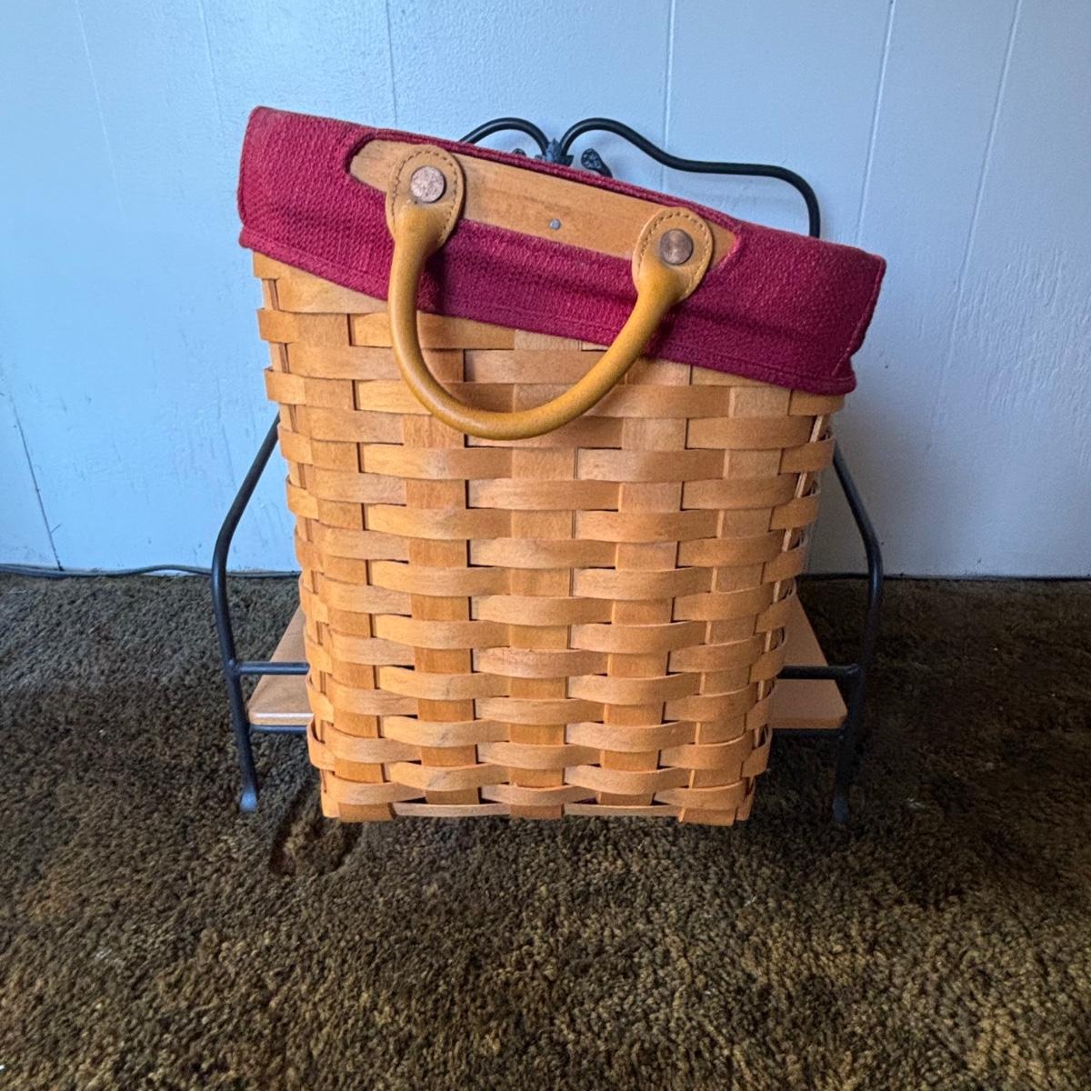 LOT 85: Longaberger Wrought Iron Basket Stand w/Newpaper Basket, Wood Lid, Divided Proctor & Fabric Liner
