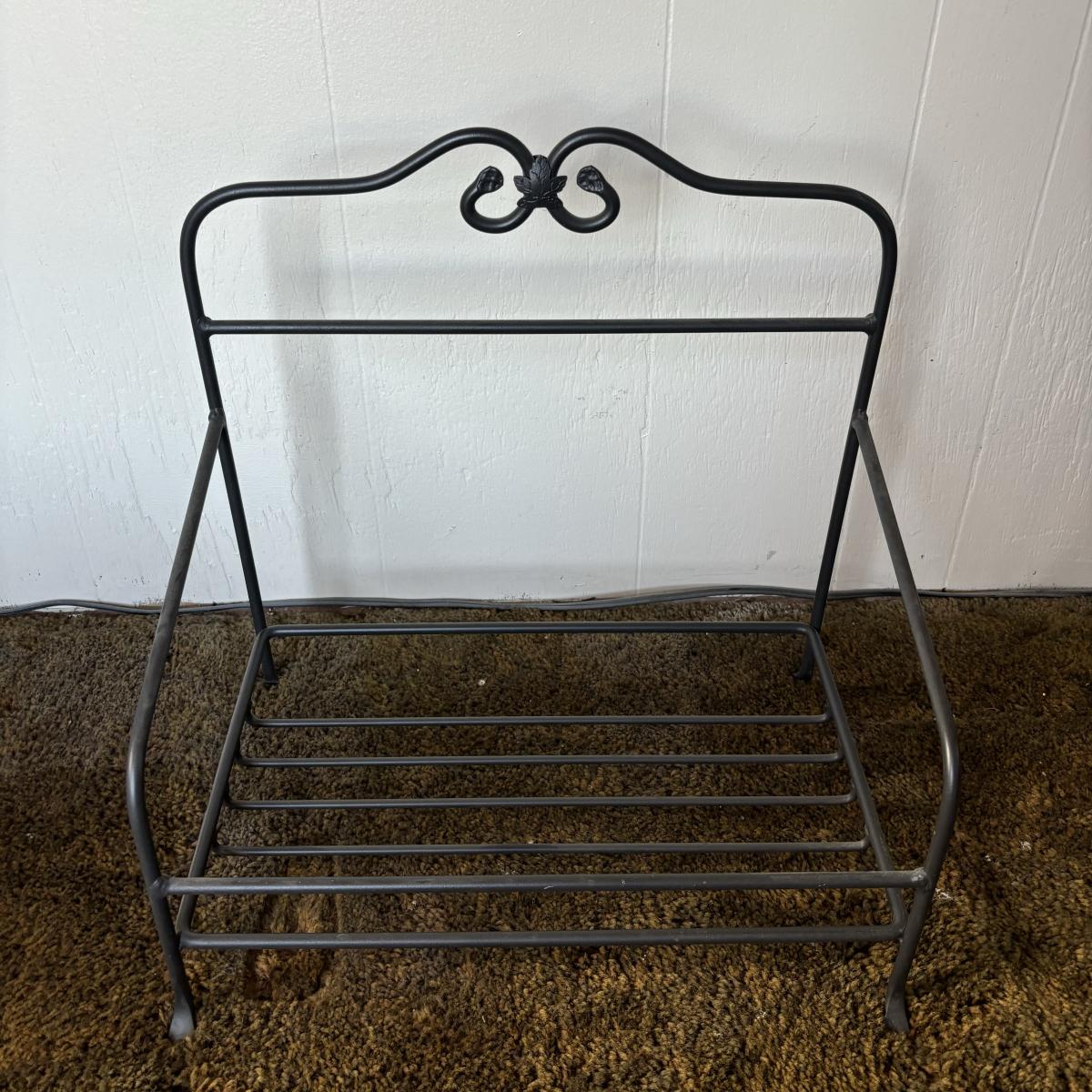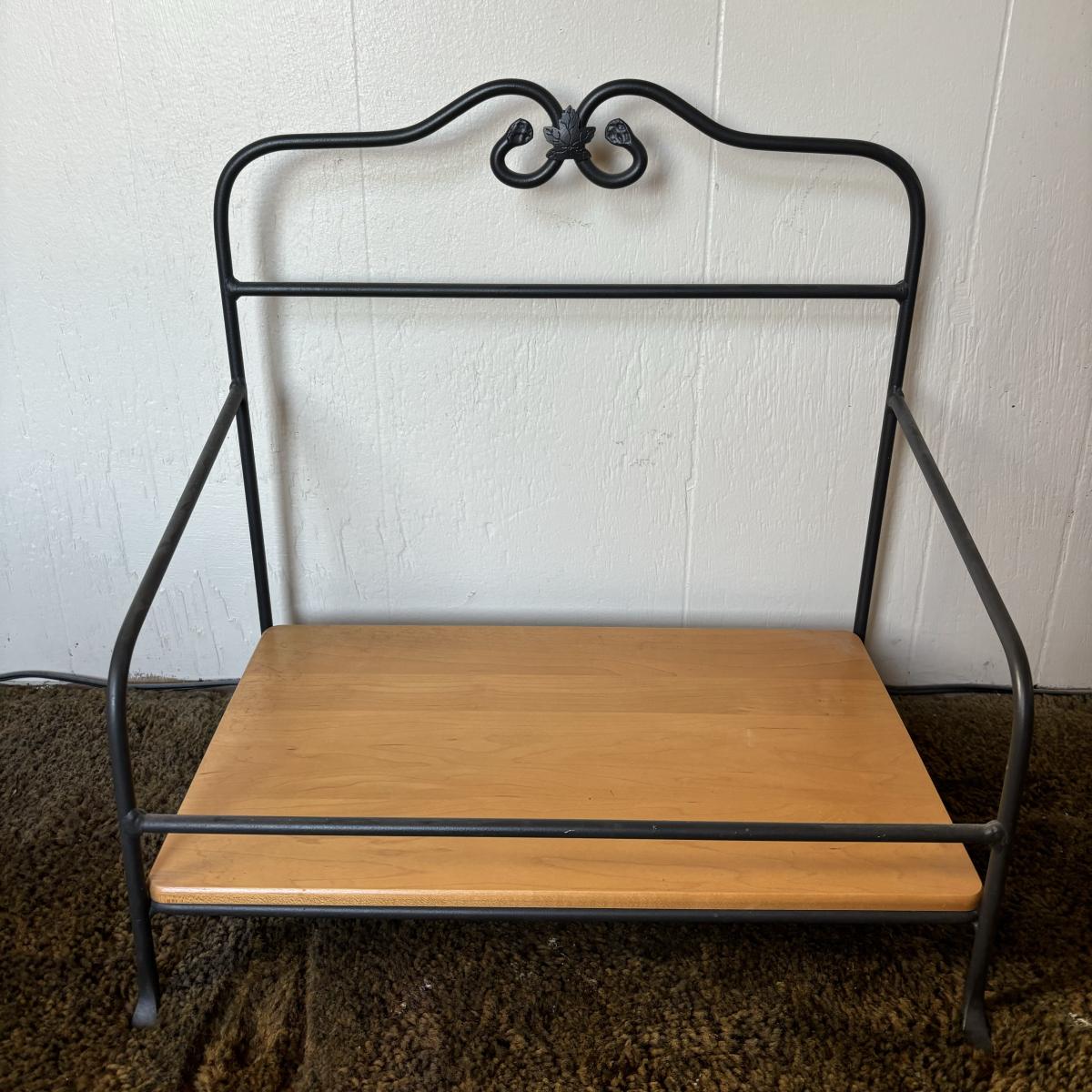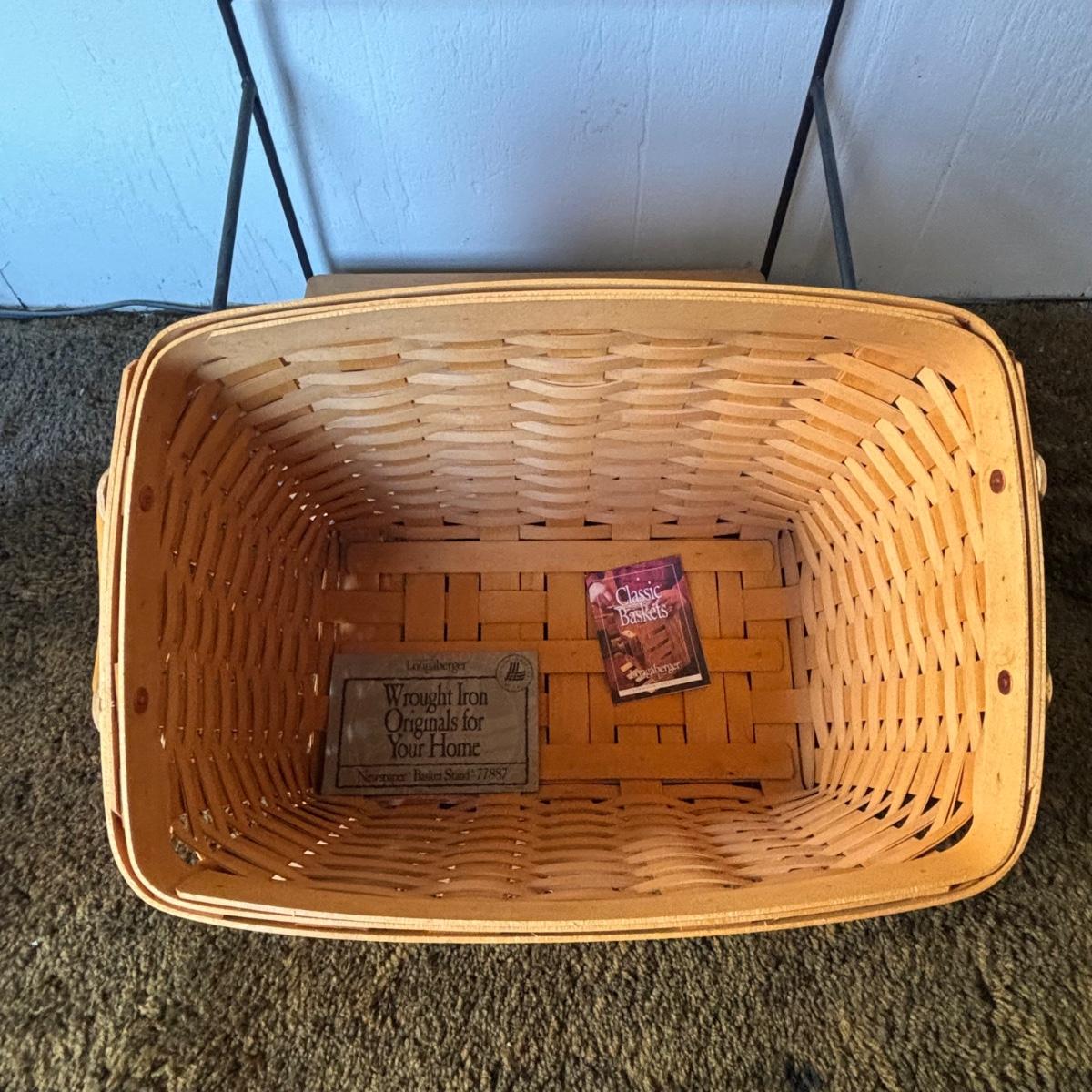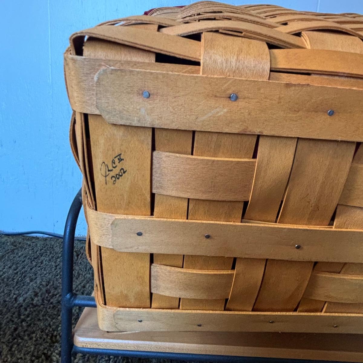 LOT 85: Longaberger Wrought Iron Basket Stand w/Newpaper Basket, Wood Lid, Divided Proctor & Fabric Liner