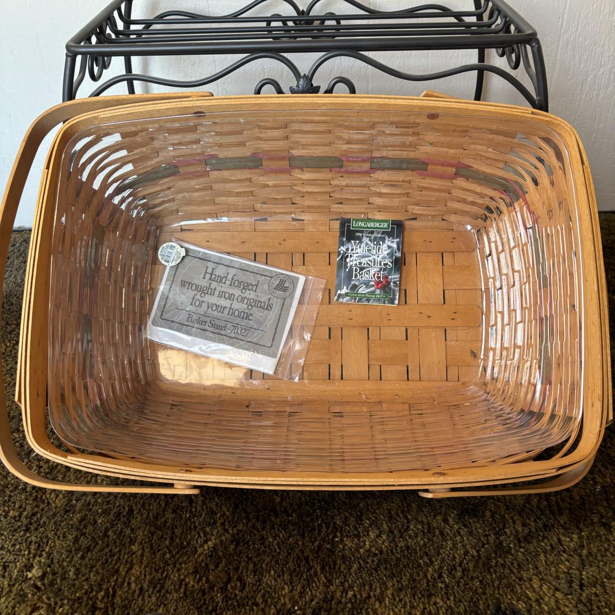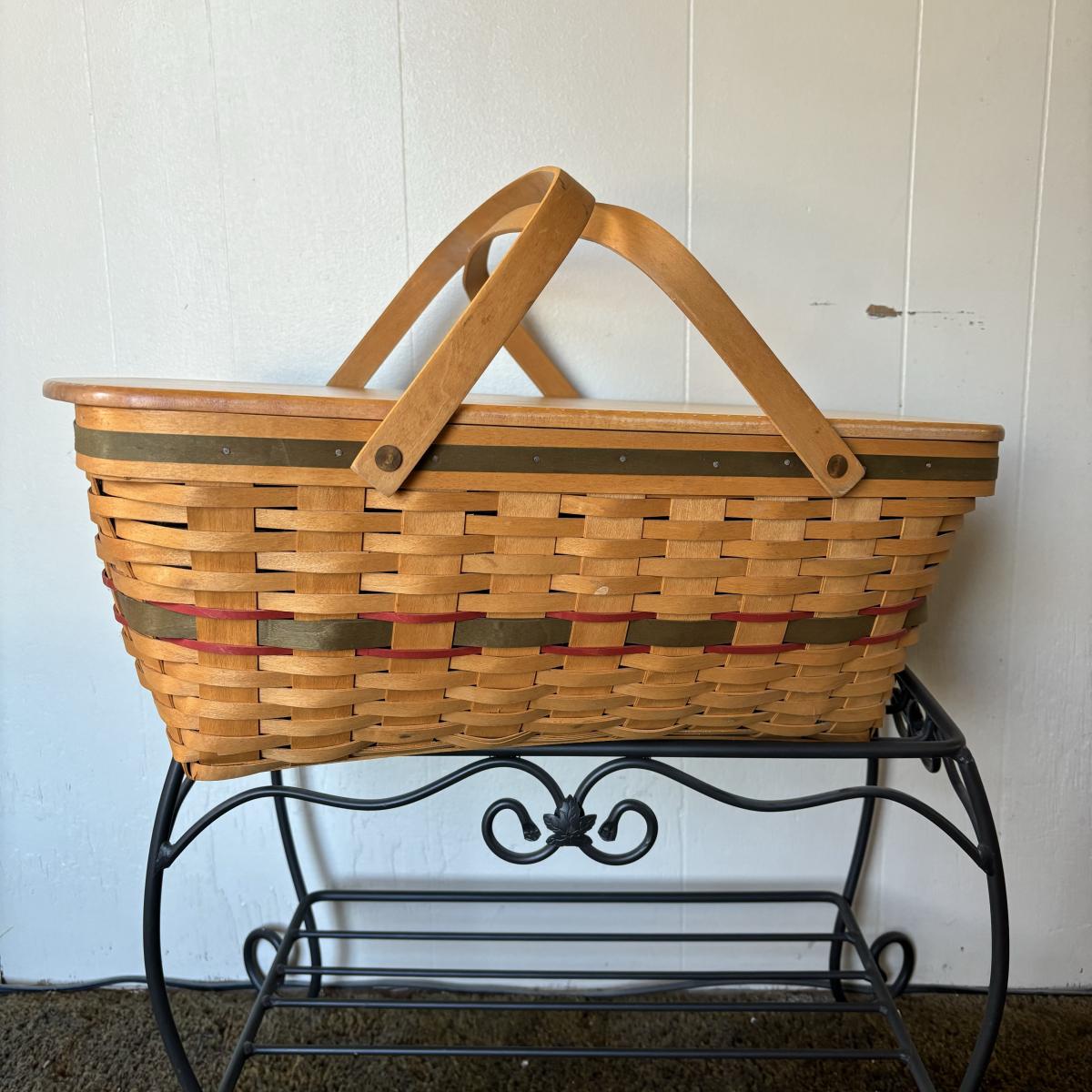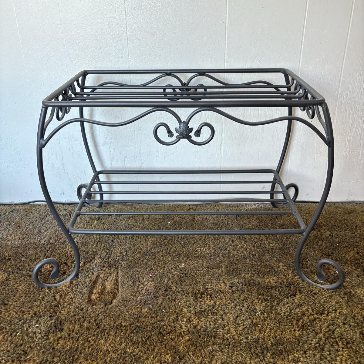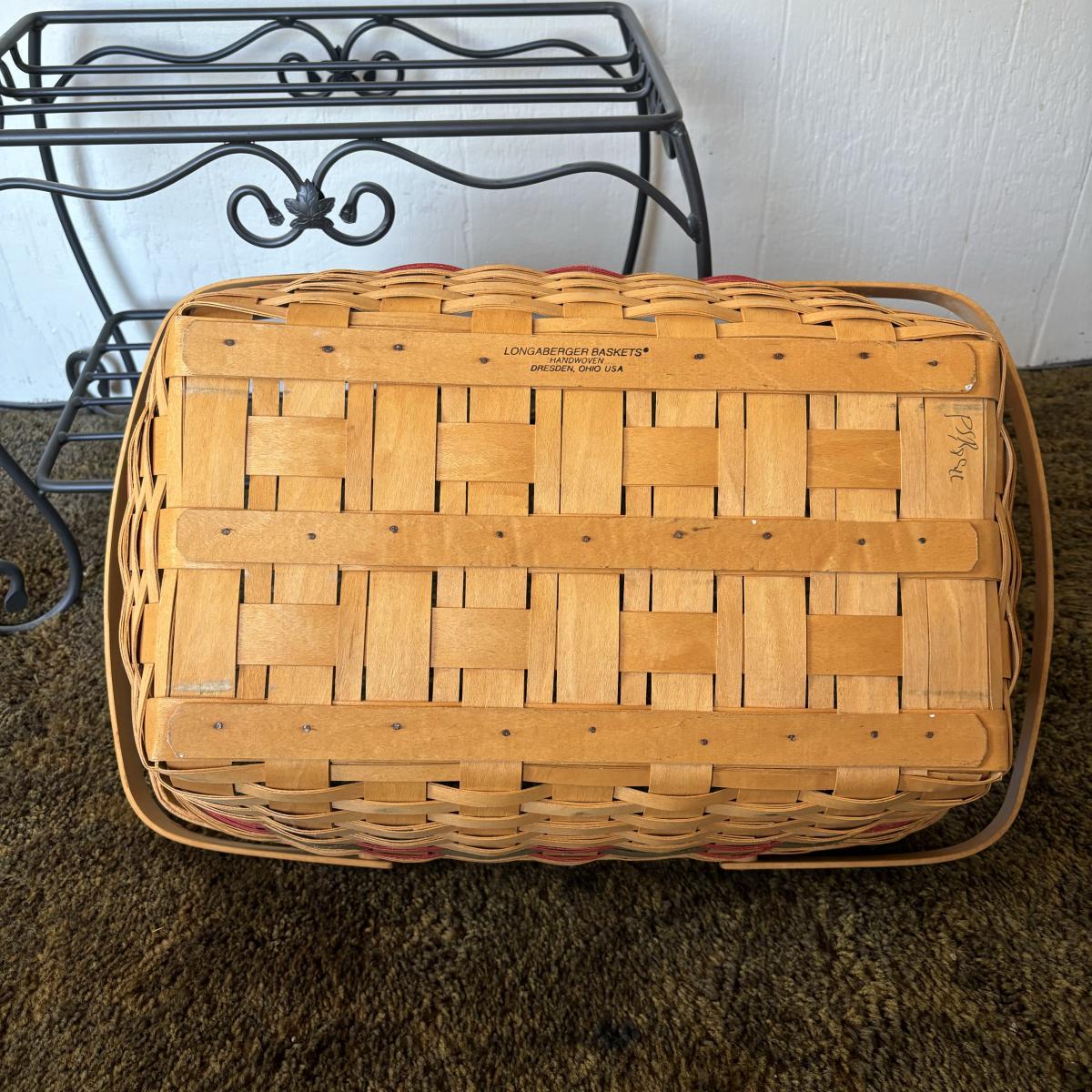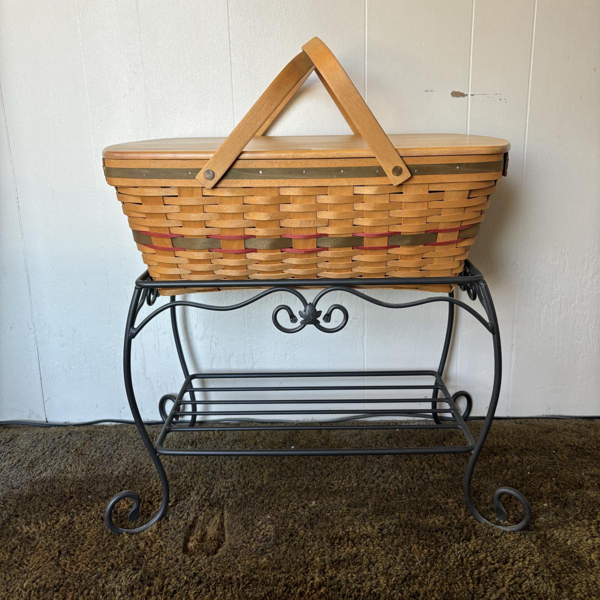 LOT 86: Wrought Iron Side Table Basket Holder & Basket w/Wooden Lid & Protector