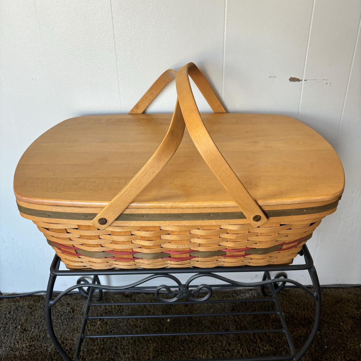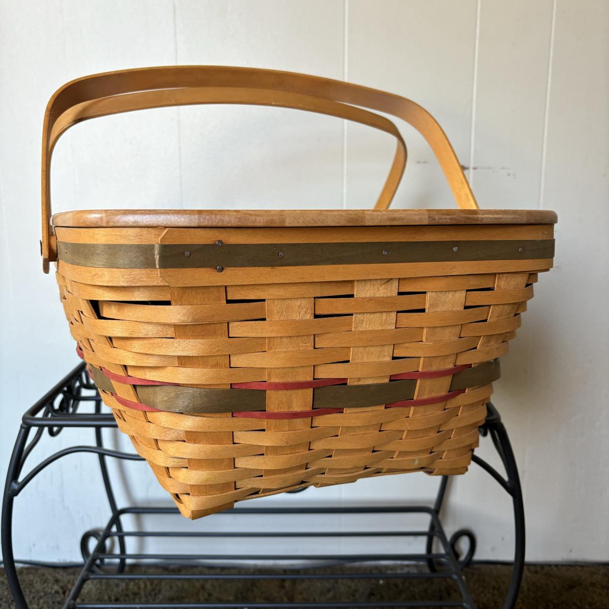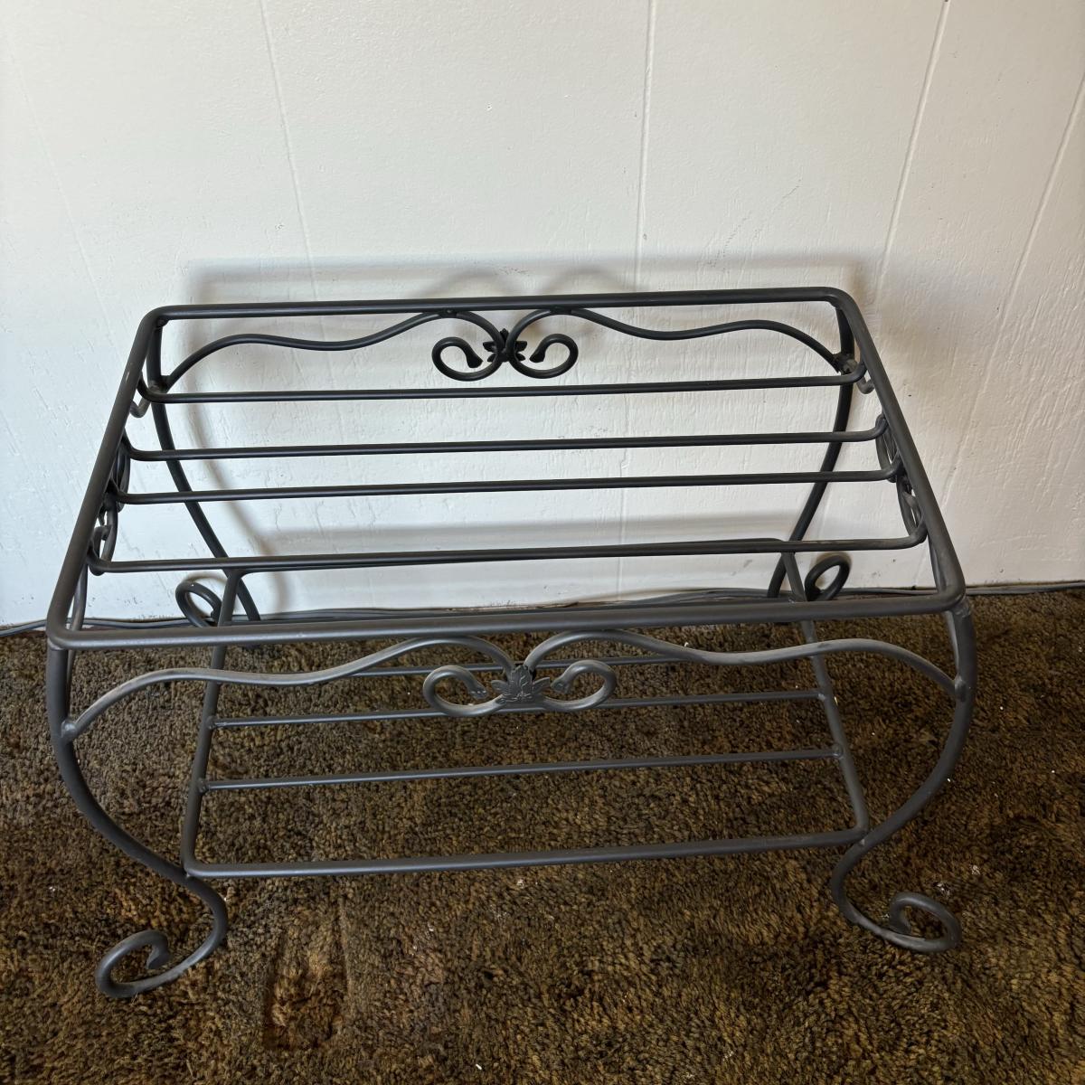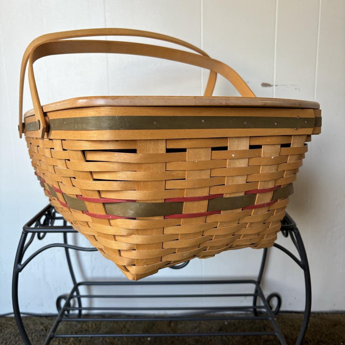 LOT 86: Wrought Iron Side Table Basket Holder & Basket w/Wooden Lid & Protector