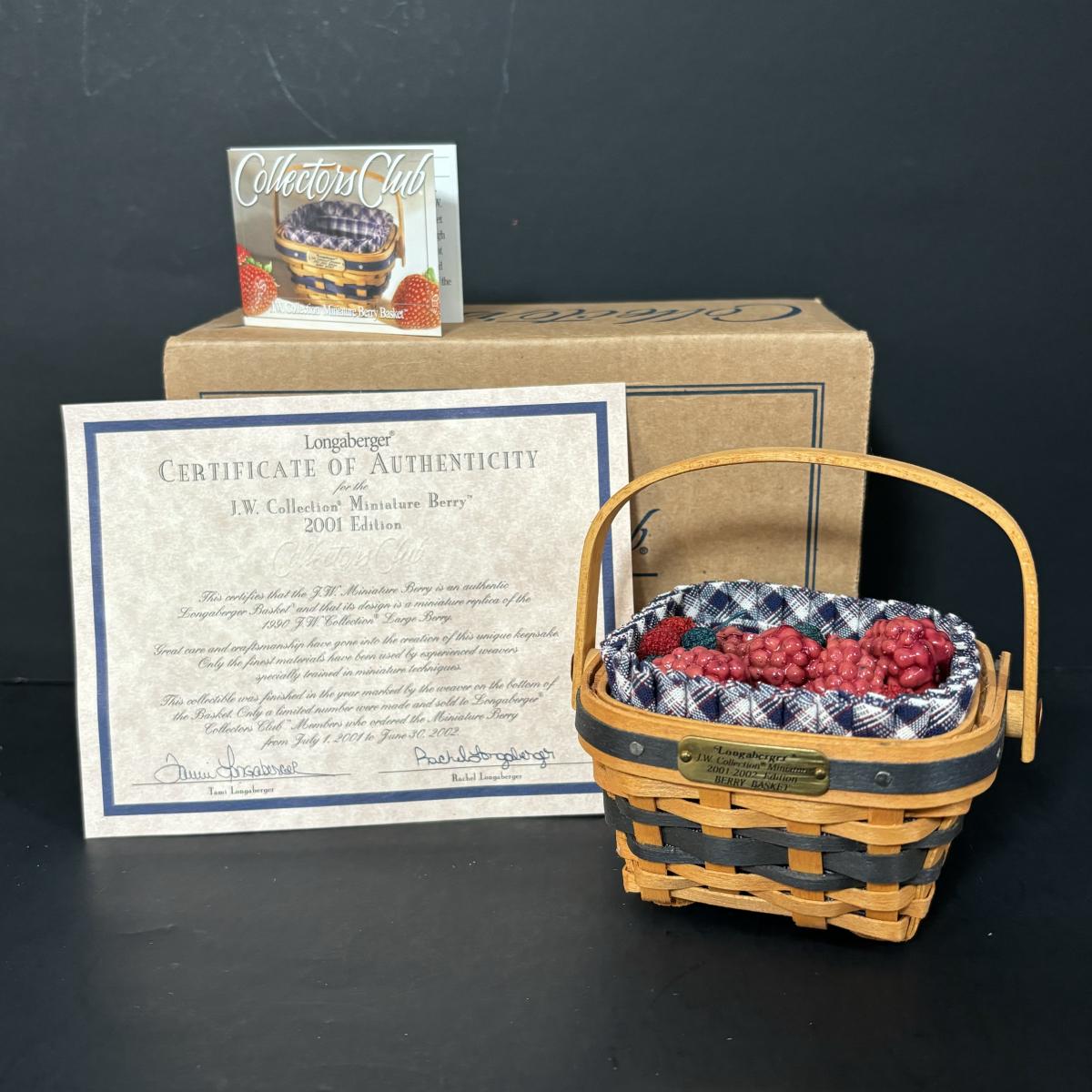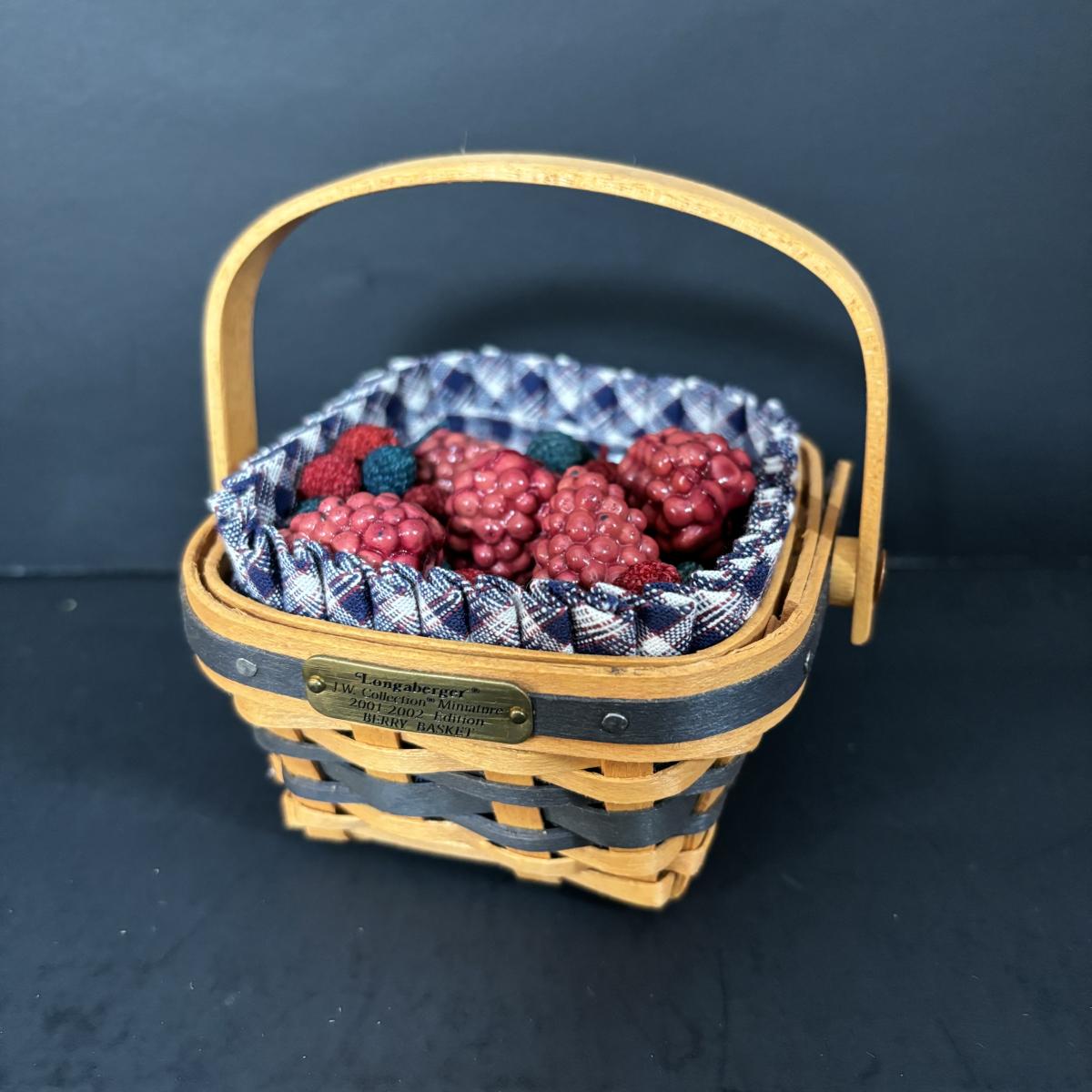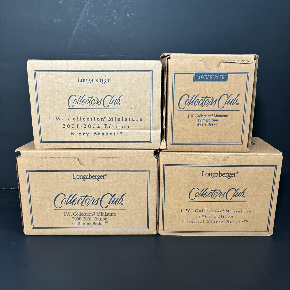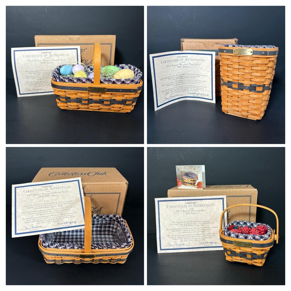 LOT 98: Longaberger Collectors Club Miniatures: Berry Basket, Gathering Basket, Original Easter Basket, Waste Basket