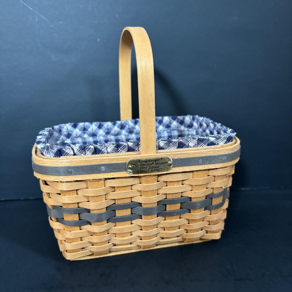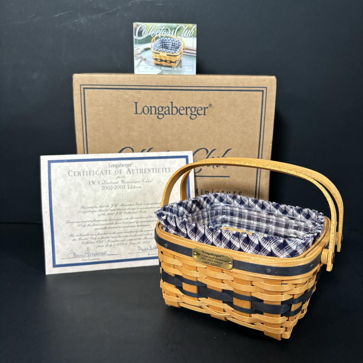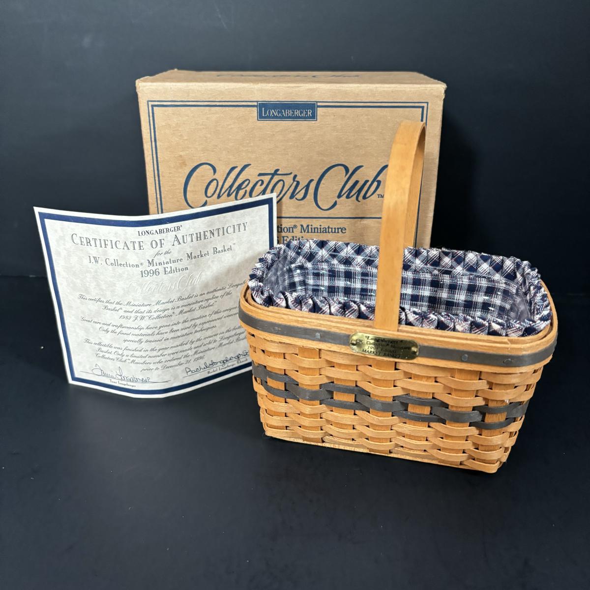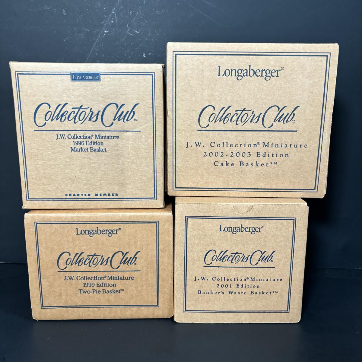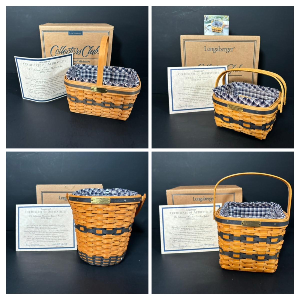 LOT 99: Longaberger Collectors Club Miniatures: Market Basket, Two-Pie Basket, Banker's Waste Basket, Cake Basket