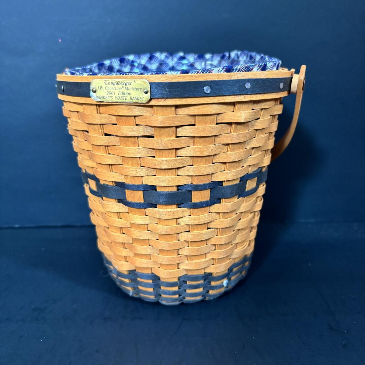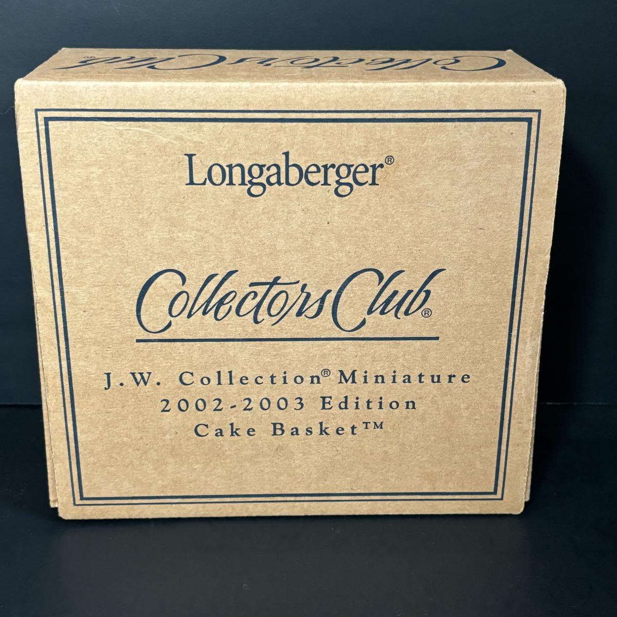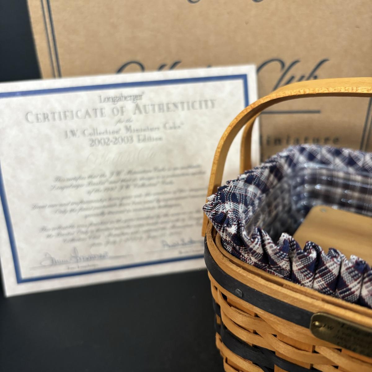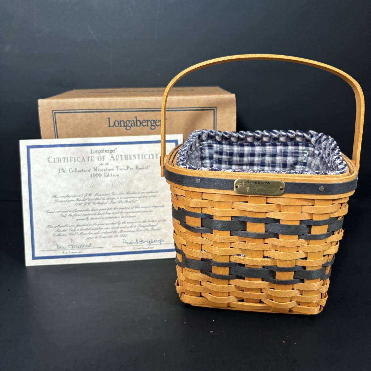 LOT 99: Longaberger Collectors Club Miniatures: Market Basket, Two-Pie Basket, Banker's Waste Basket, Cake Basket