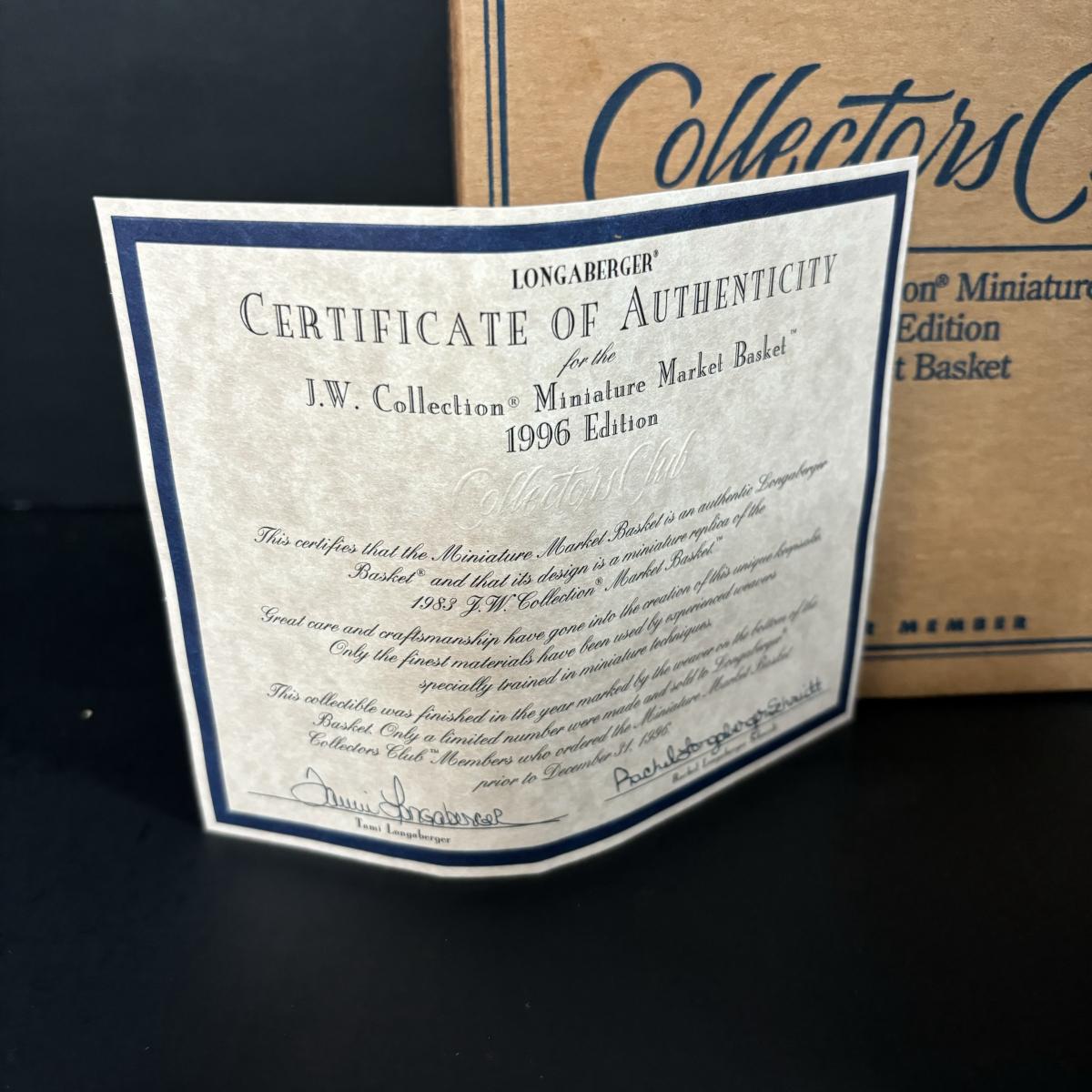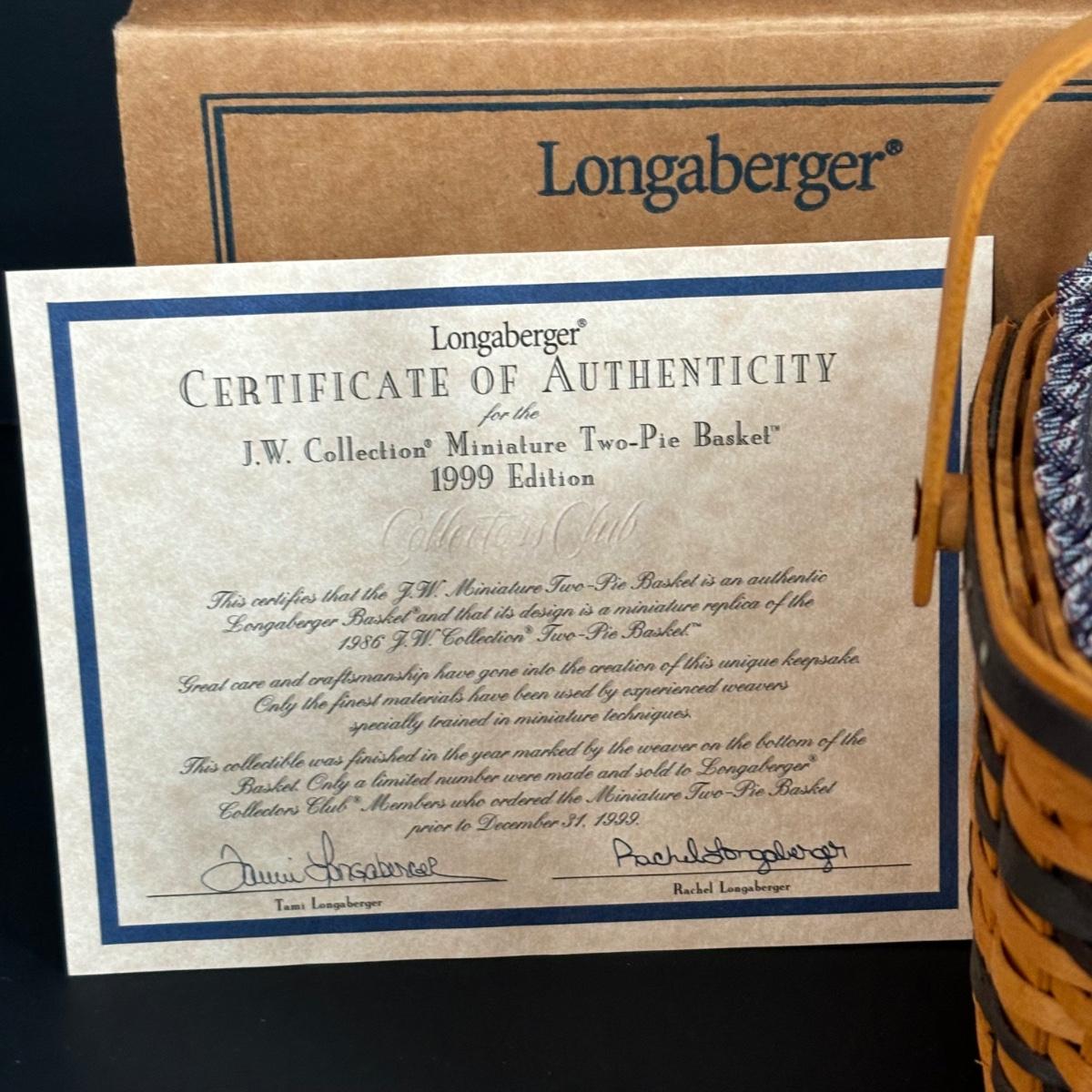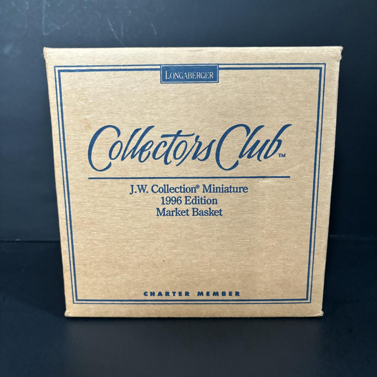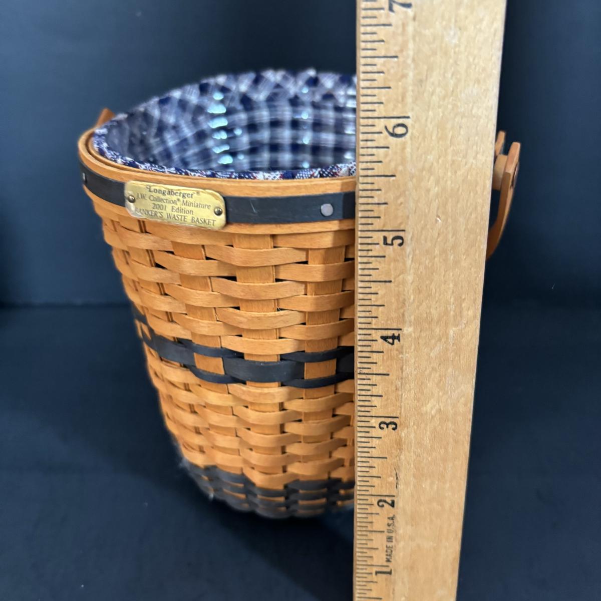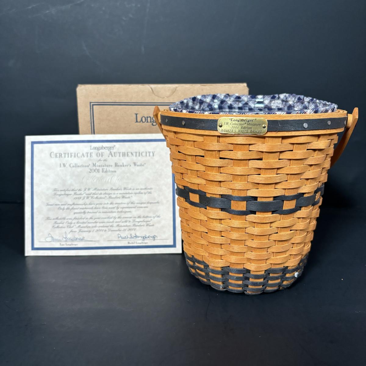 LOT 99: Longaberger Collectors Club Miniatures: Market Basket, Two-Pie Basket, Banker's Waste Basket, Cake Basket