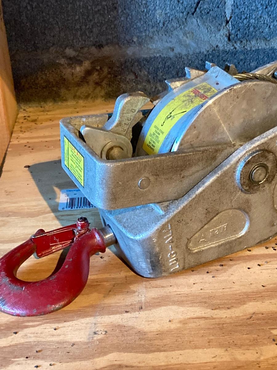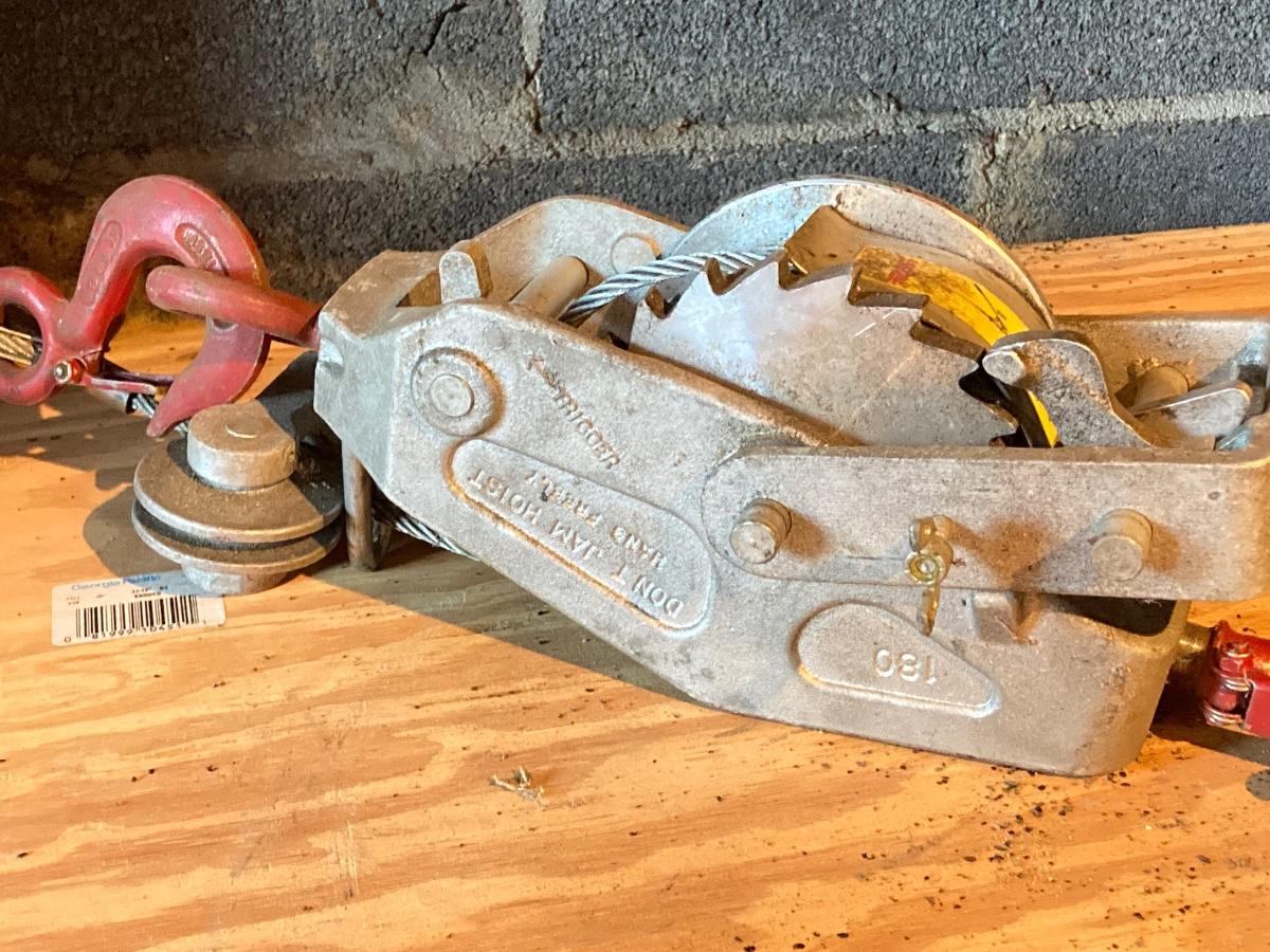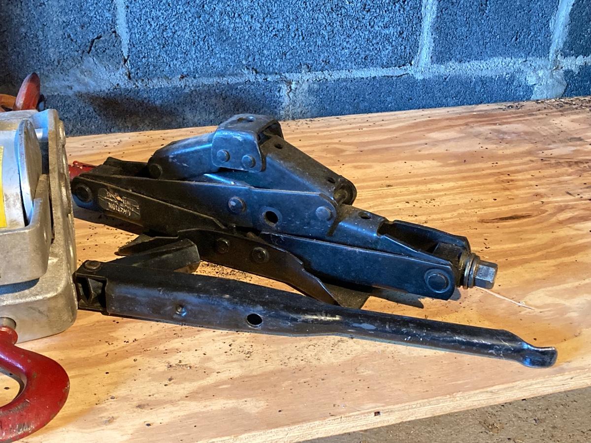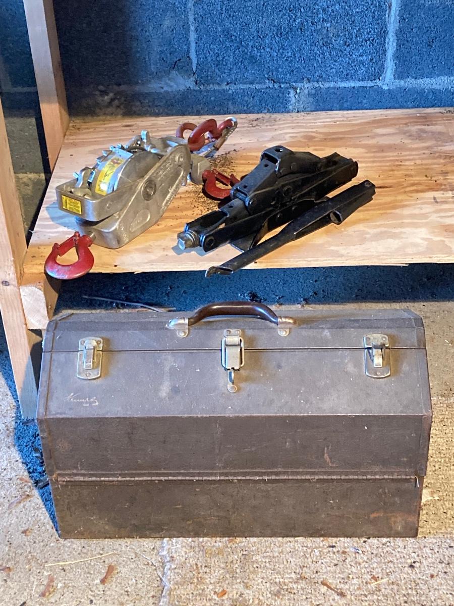 LOT 119: Metal Toolbox with Contents, Lug-All Hoist and Hand Jack
