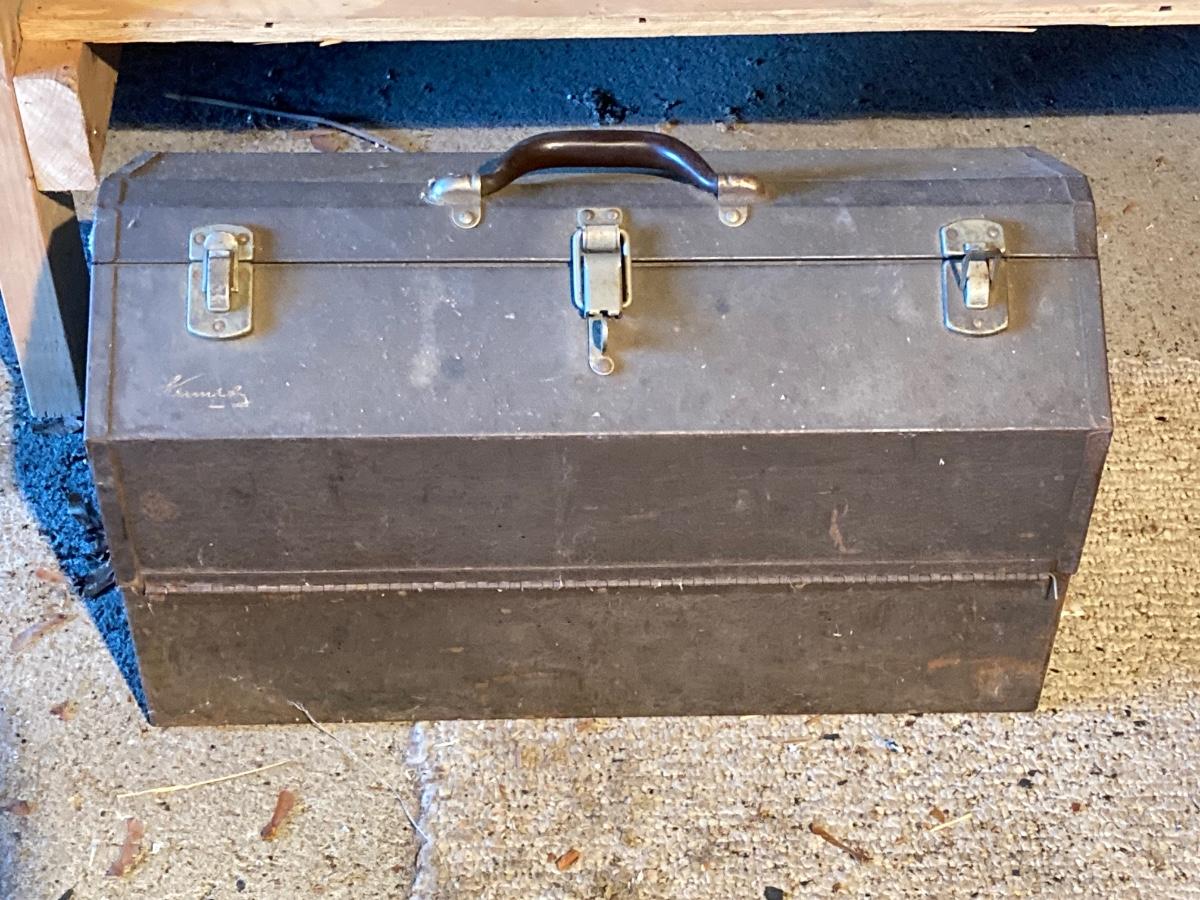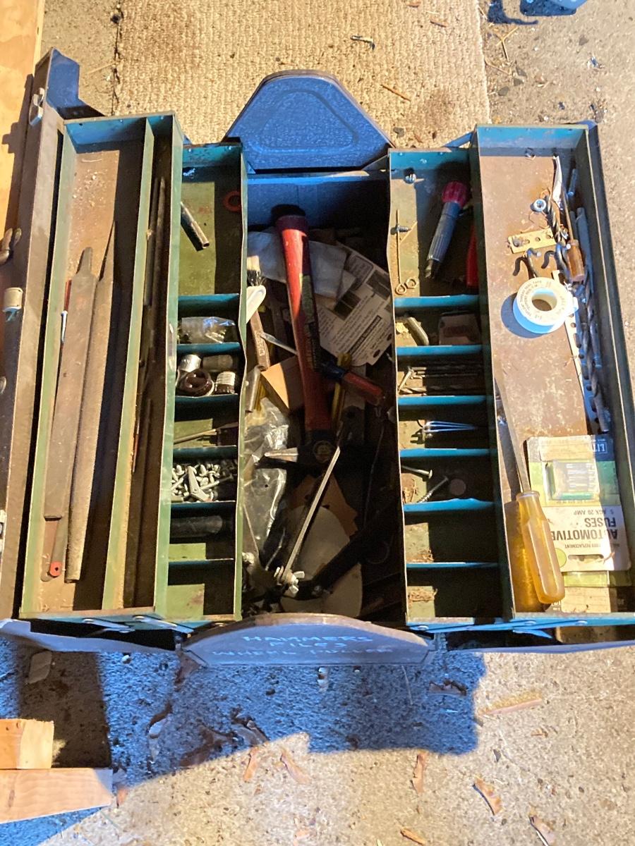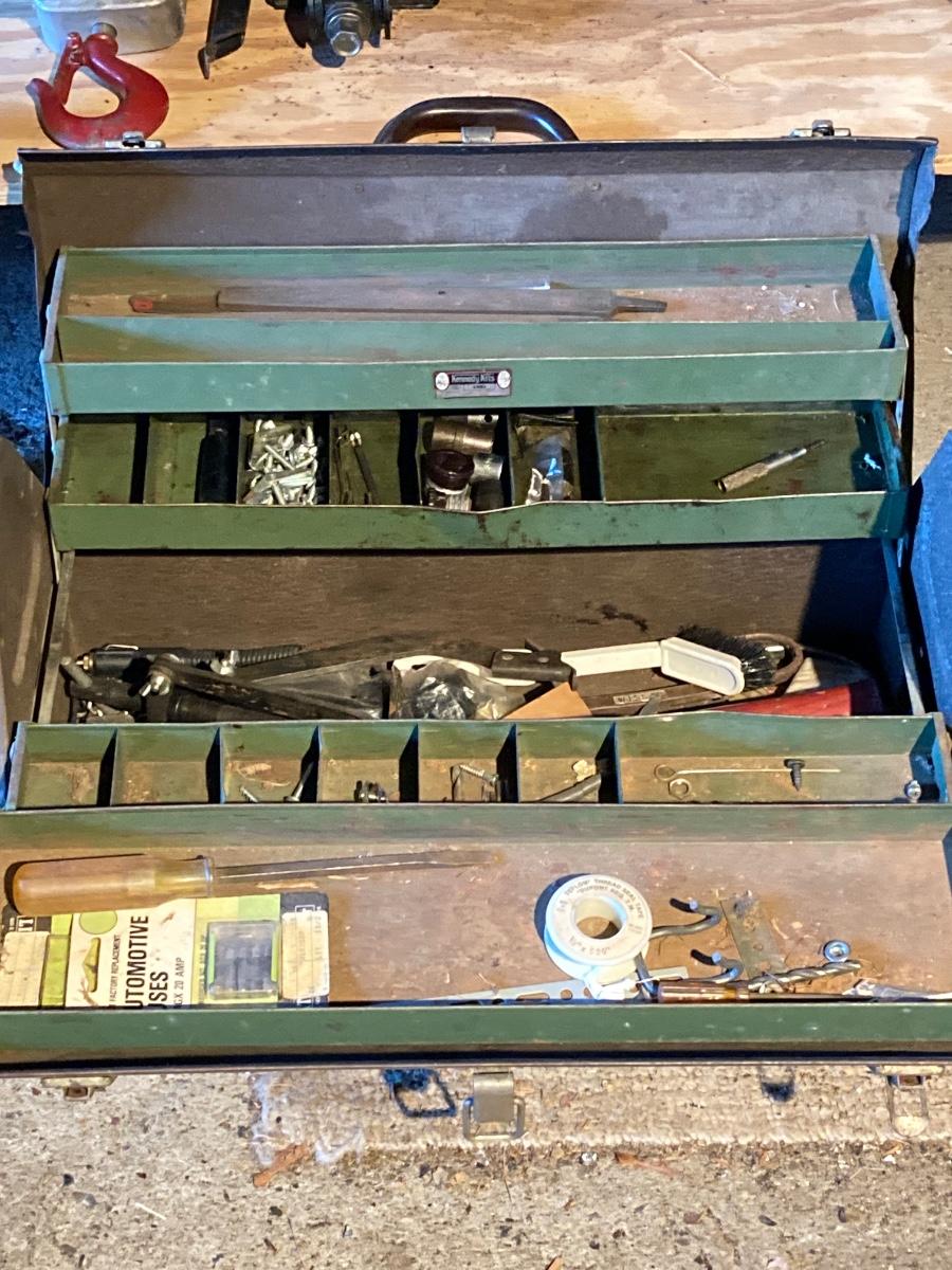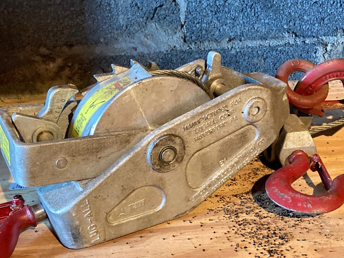 LOT 119: Metal Toolbox with Contents, Lug-All Hoist and Hand Jack