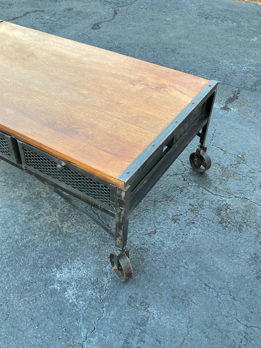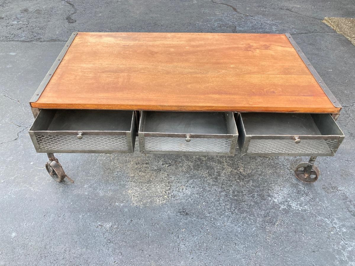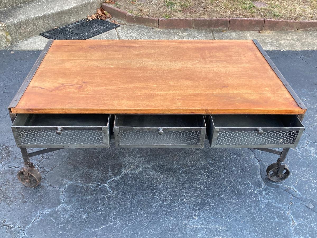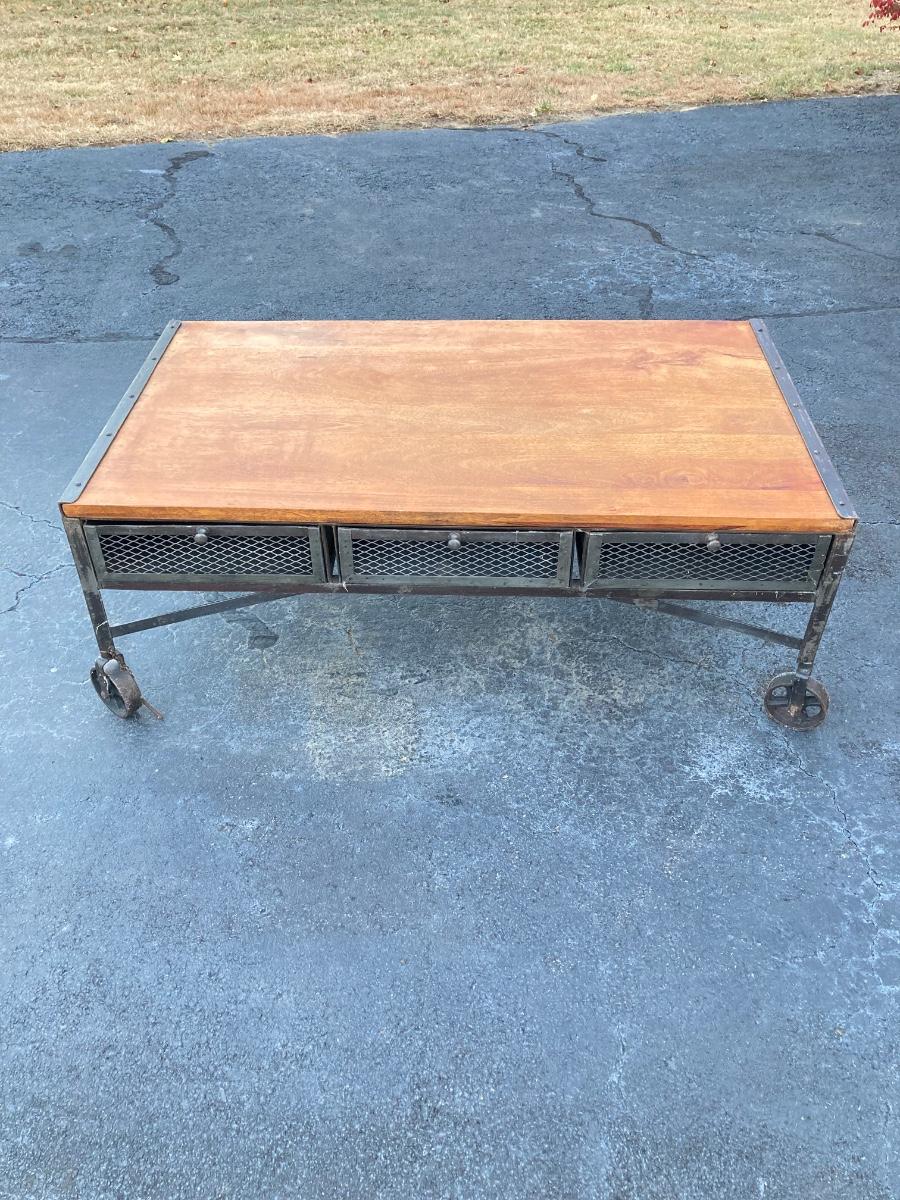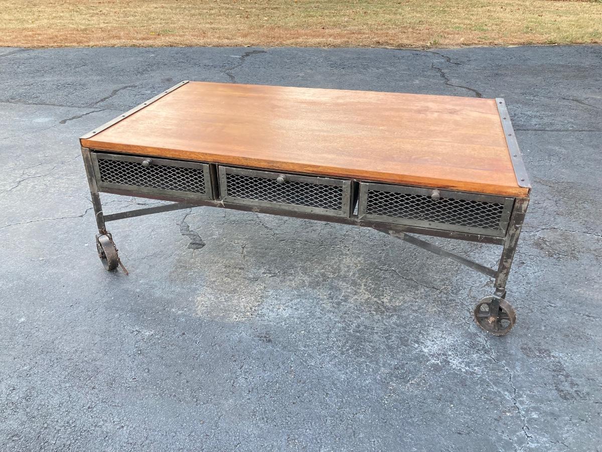 LOT 123: Unique Metal and Wood Rolling Coffee Table with Six Pullout Drawers