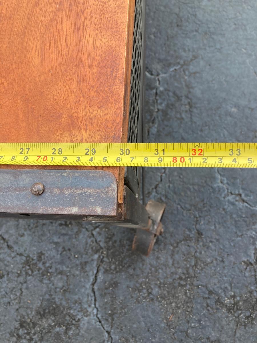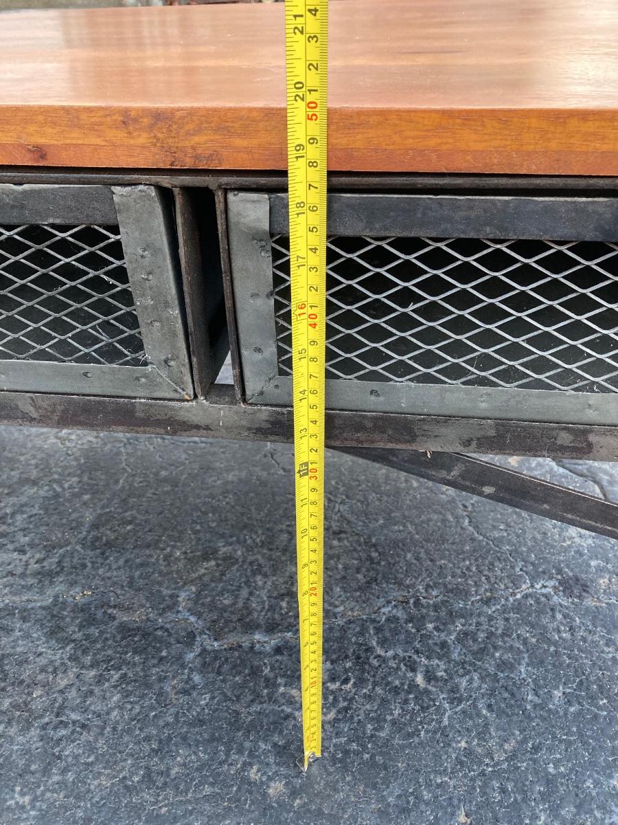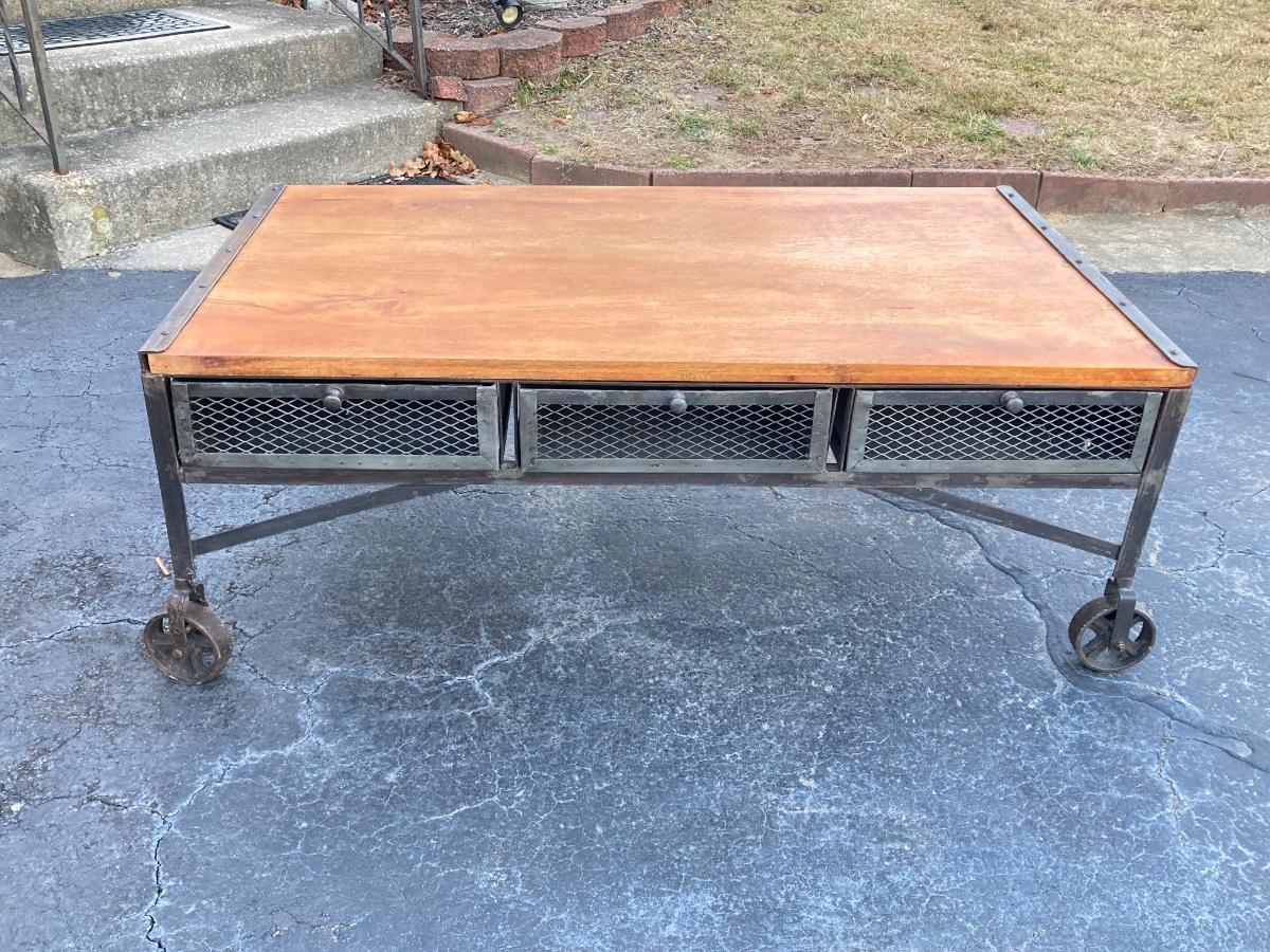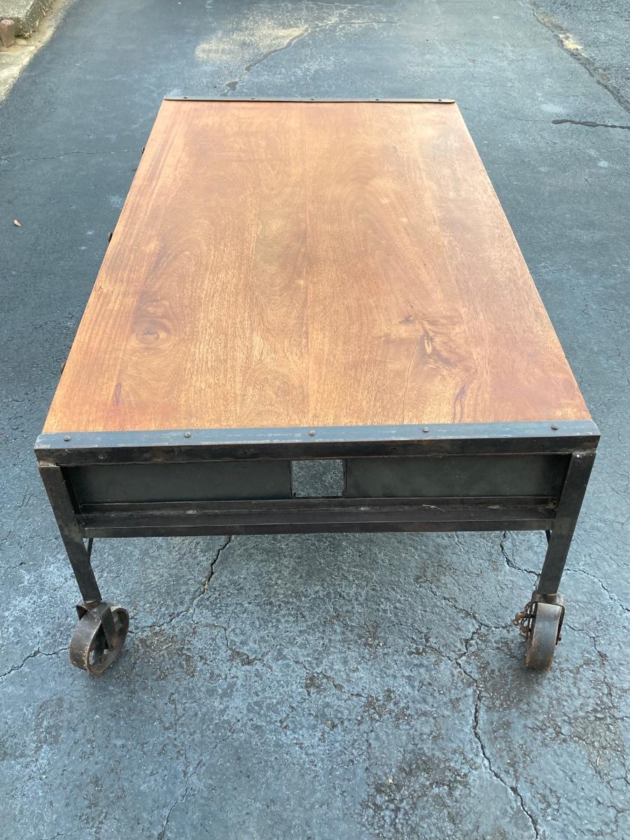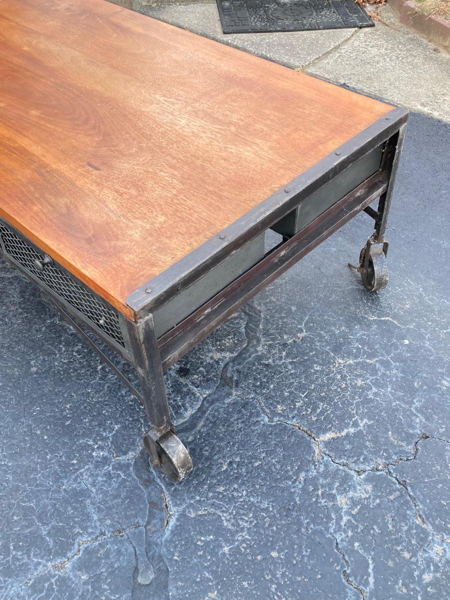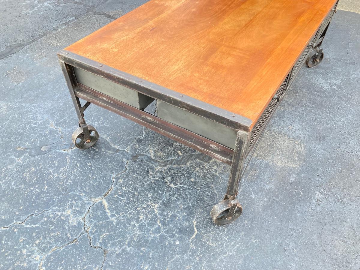 LOT 123: Unique Metal and Wood Rolling Coffee Table with Six Pullout Drawers