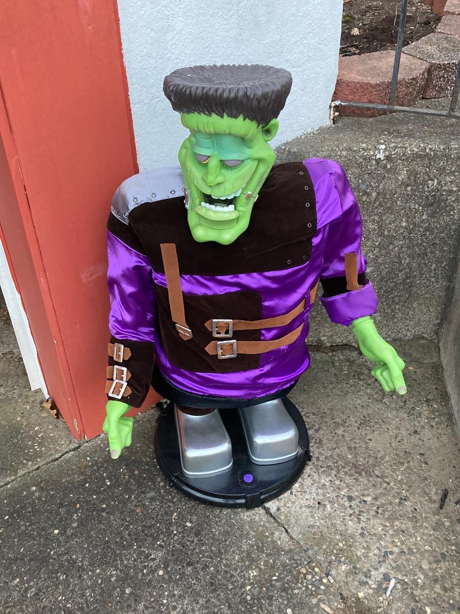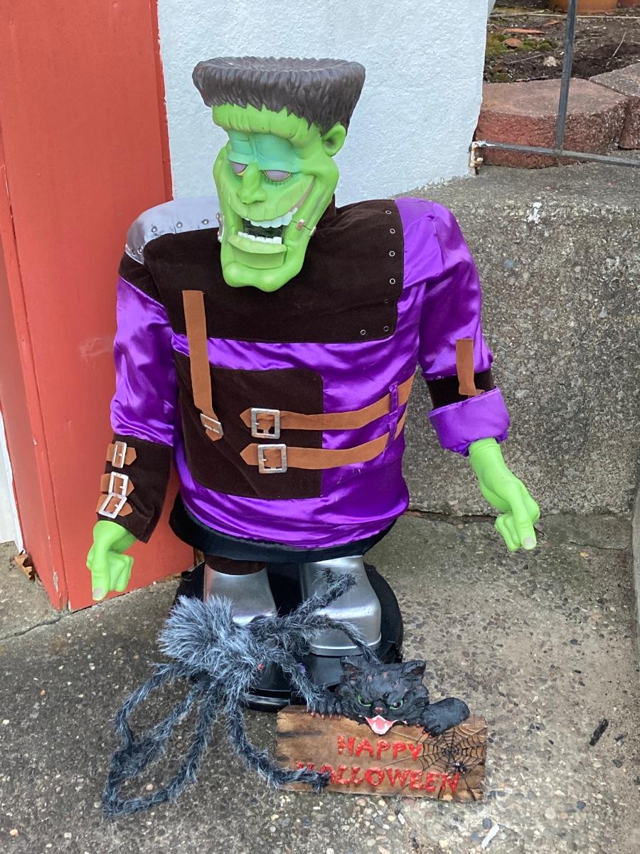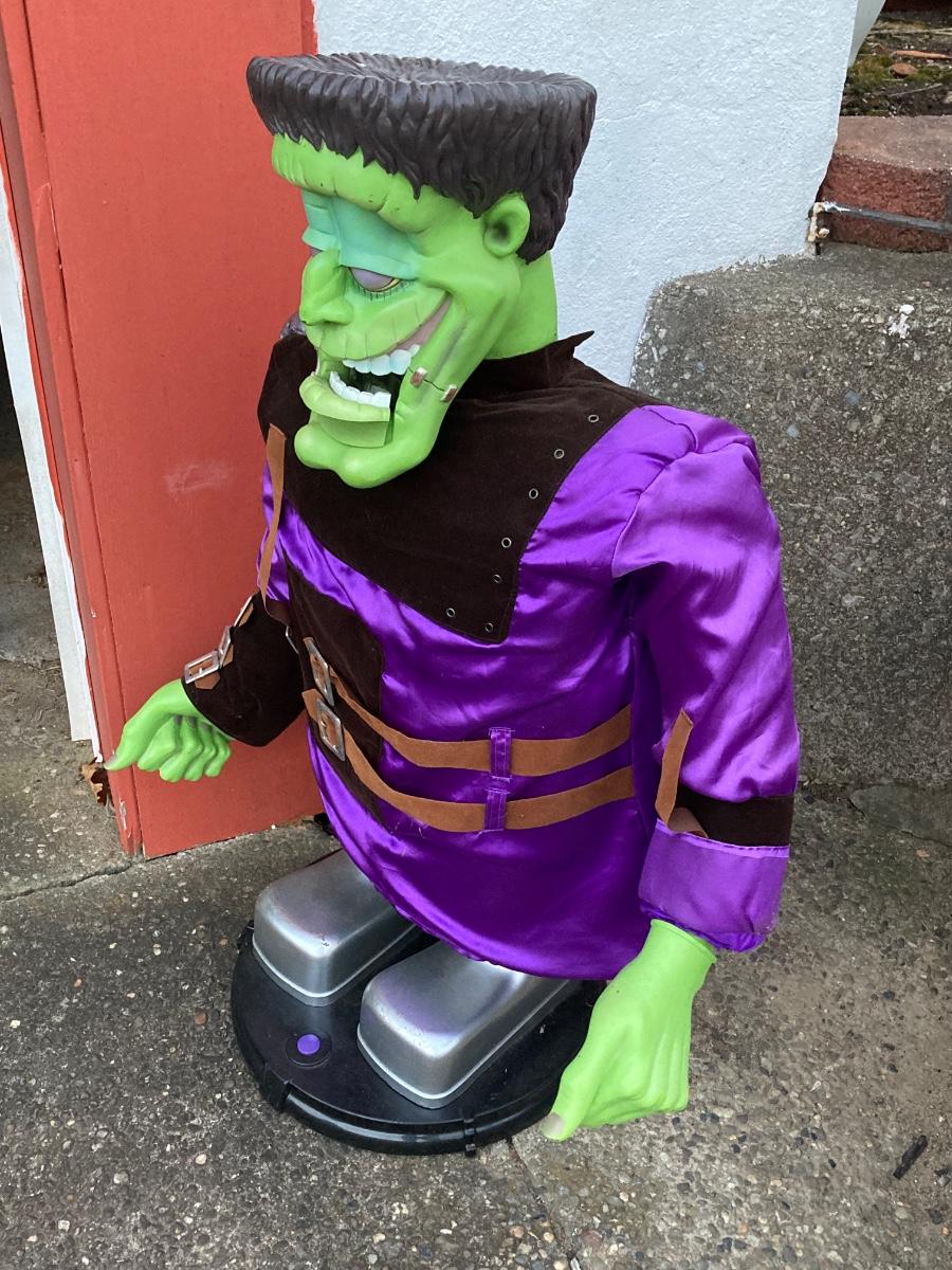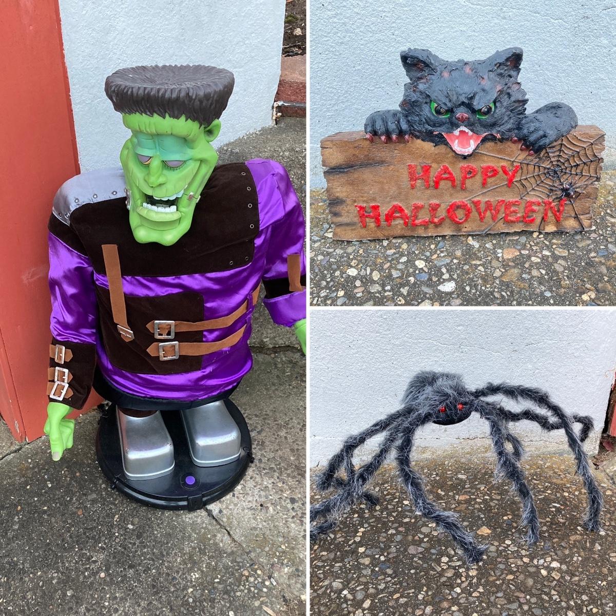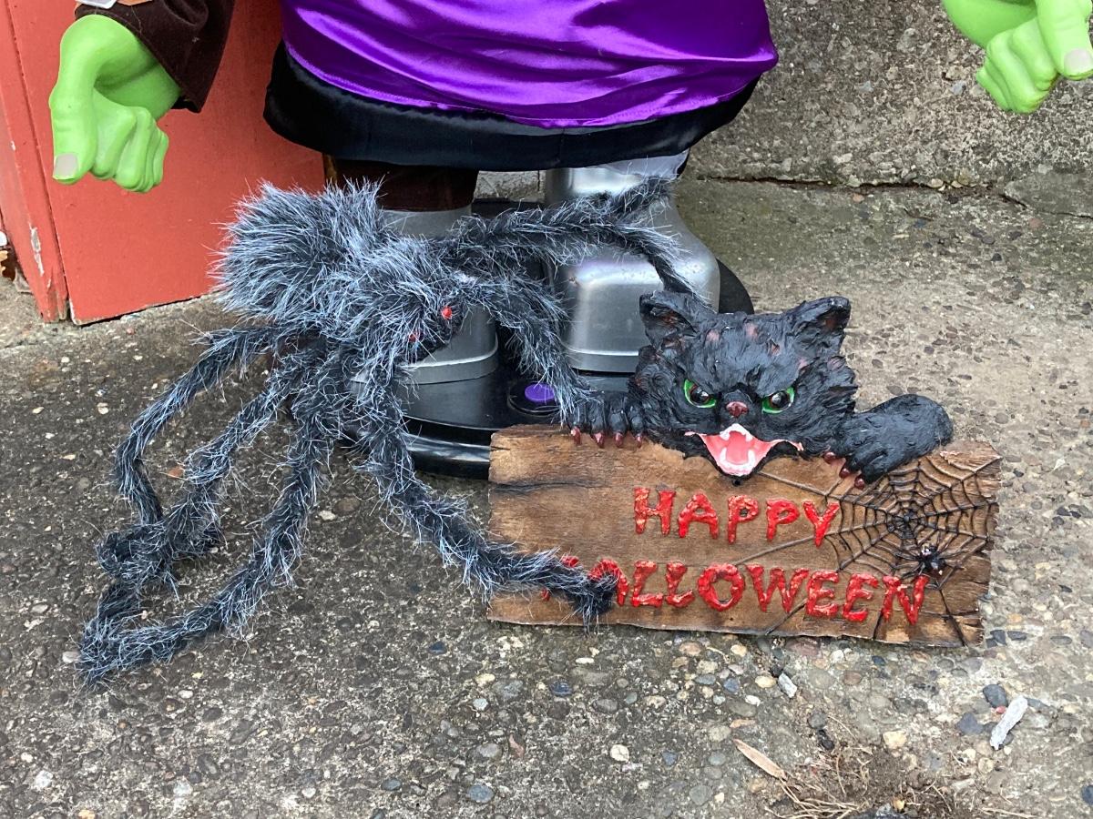 LOT 124: Vintage Gemmy Frankenstein, Happy Halloween Sign and Large Fuzzy Toy Spider