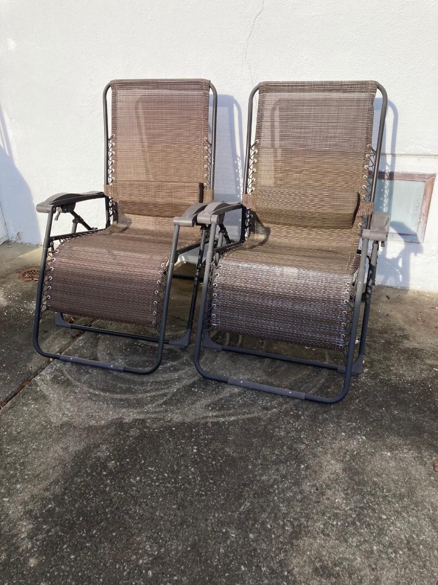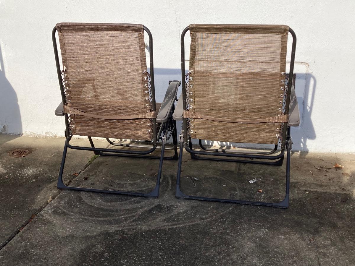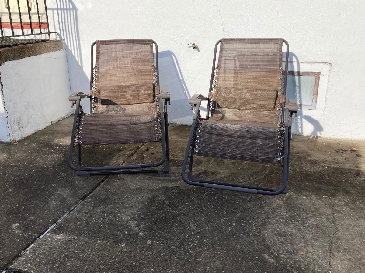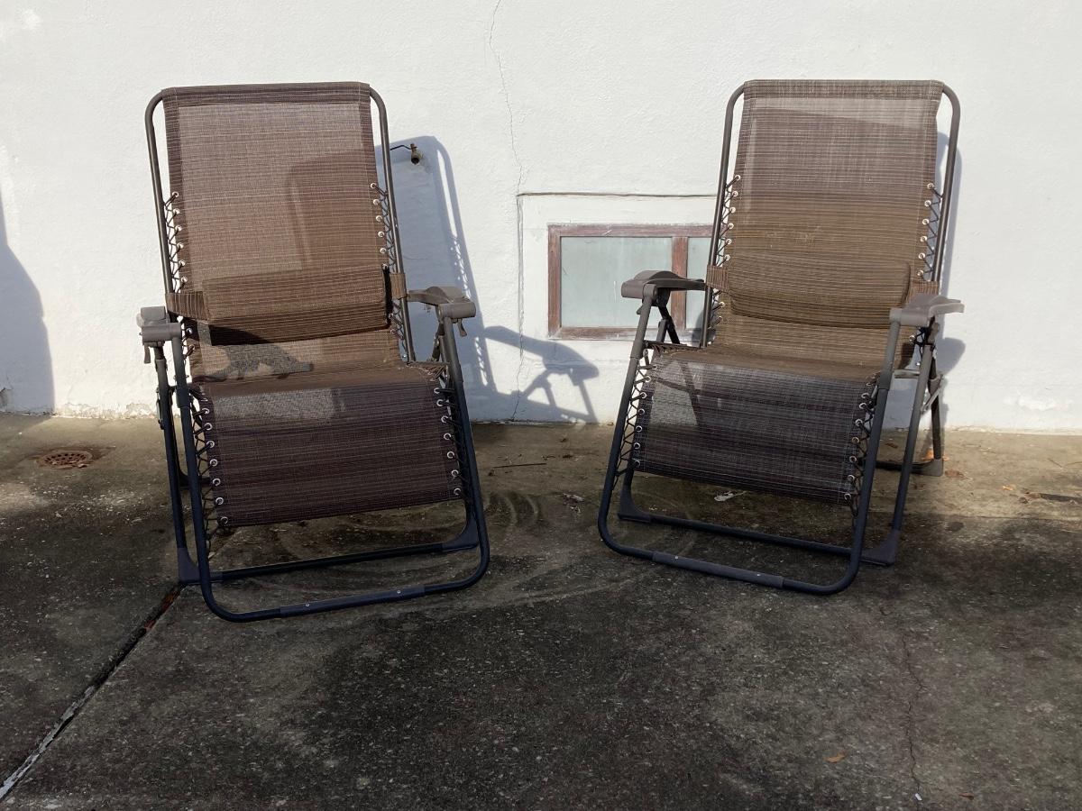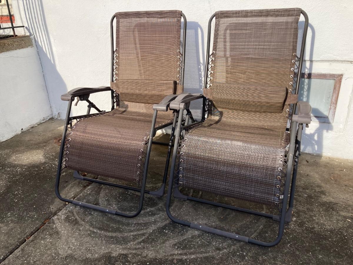 LOT 126: Pair of Brown Zero Gravity Folding Lounge / Patio Chairs