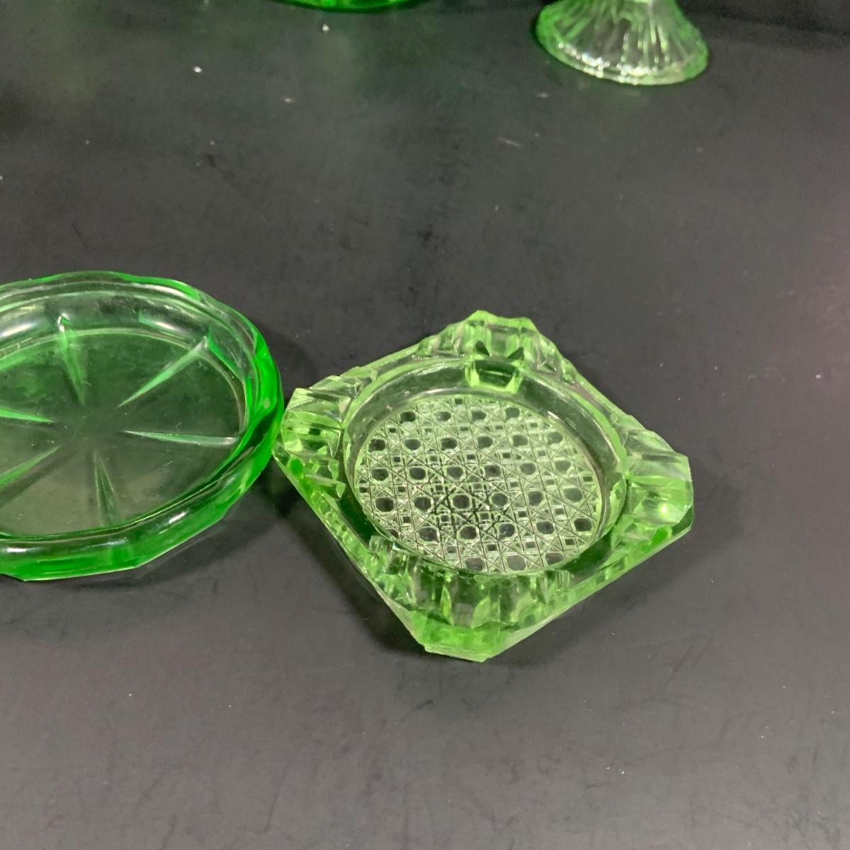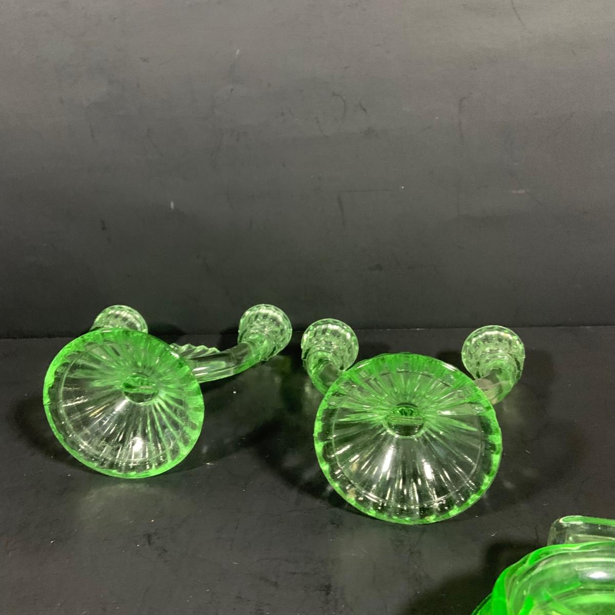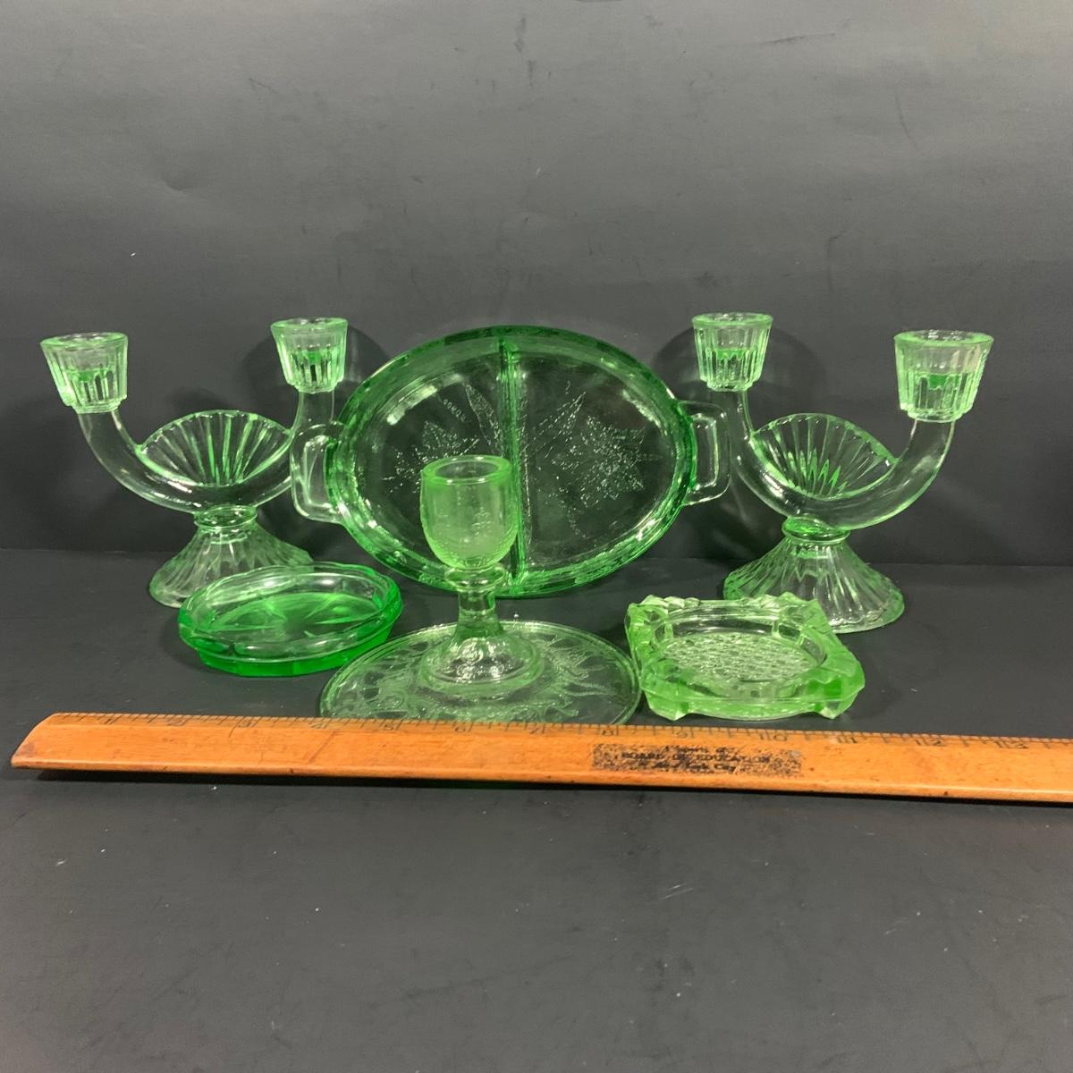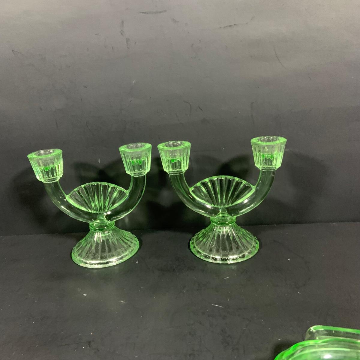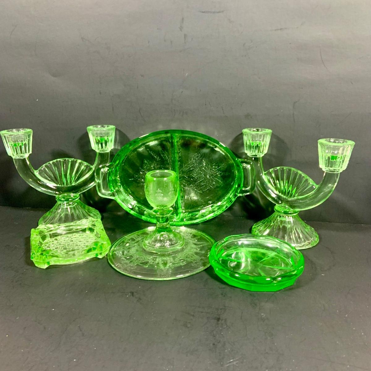 LOT:165: Vintage Green Uranium Glass Candle Stick, Ashtrays, Dish and Green Glass Candle Holders