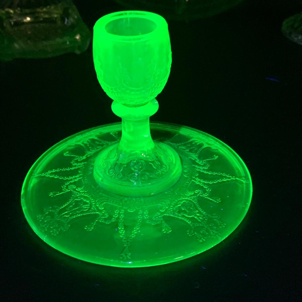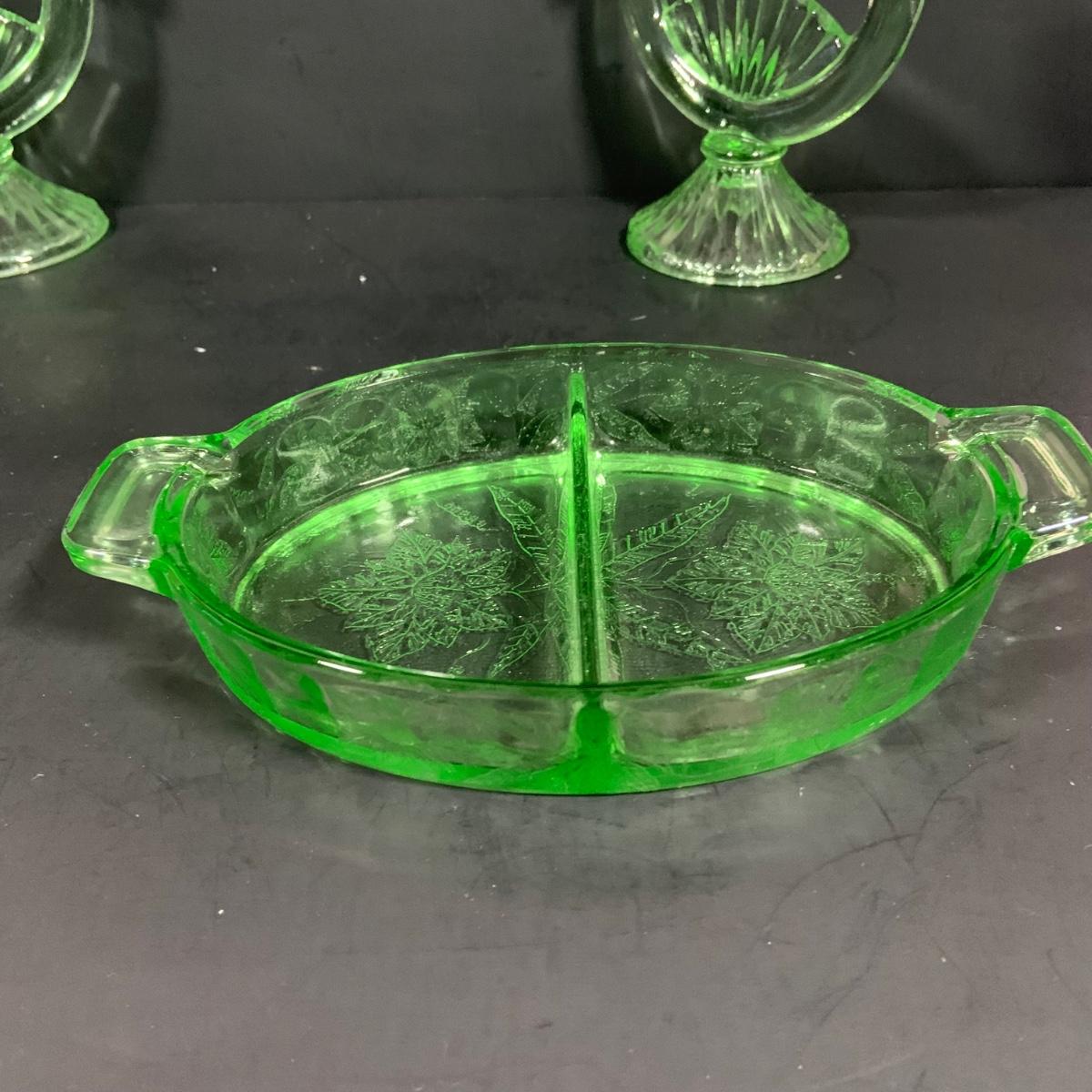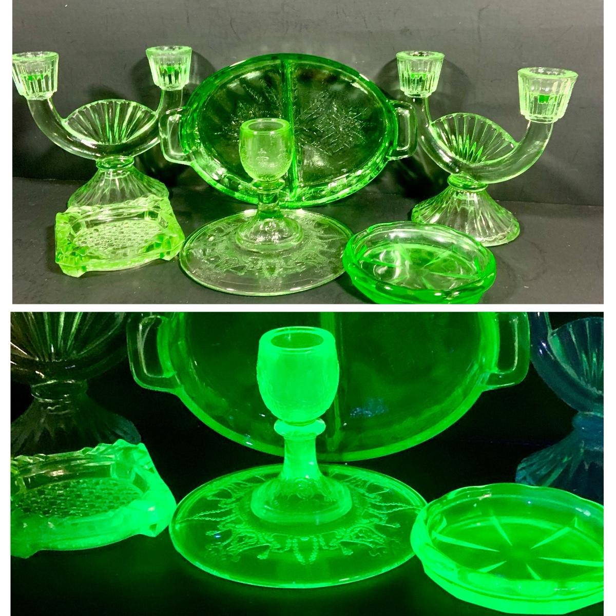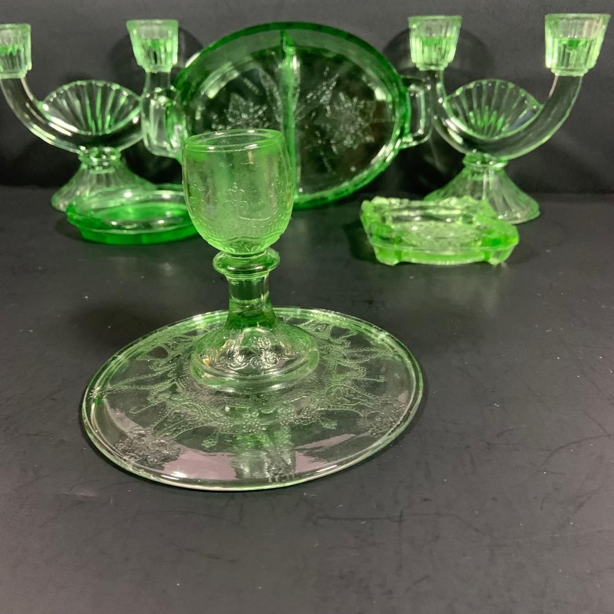 LOT:165: Vintage Green Uranium Glass Candle Stick, Ashtrays, Dish and Green Glass Candle Holders