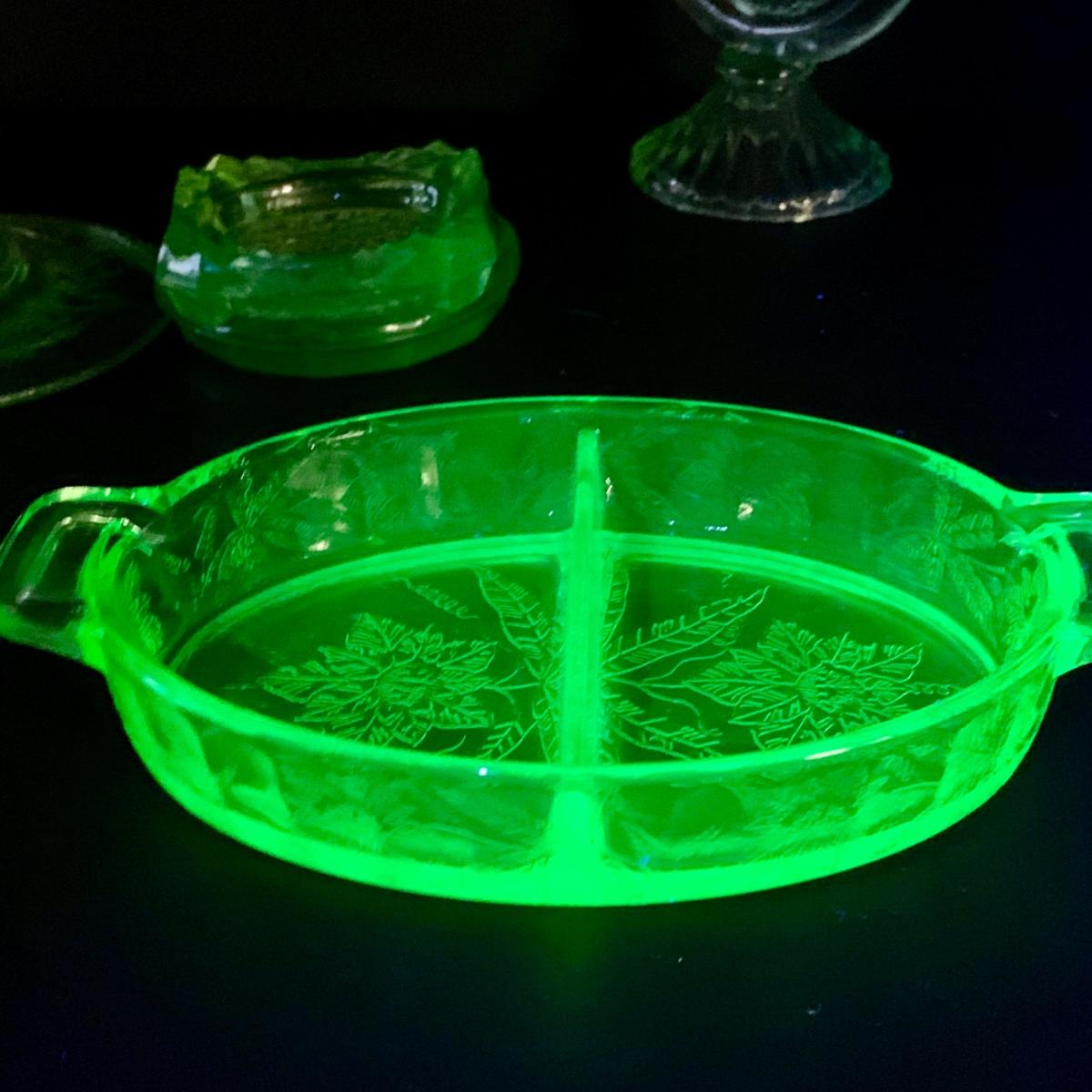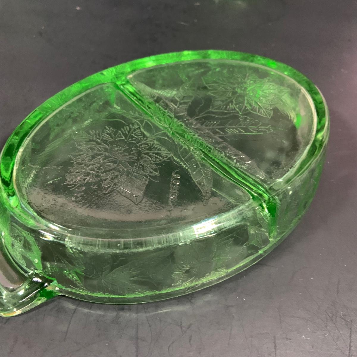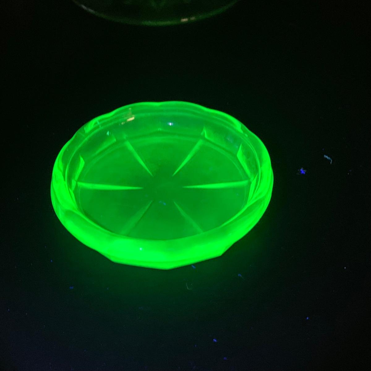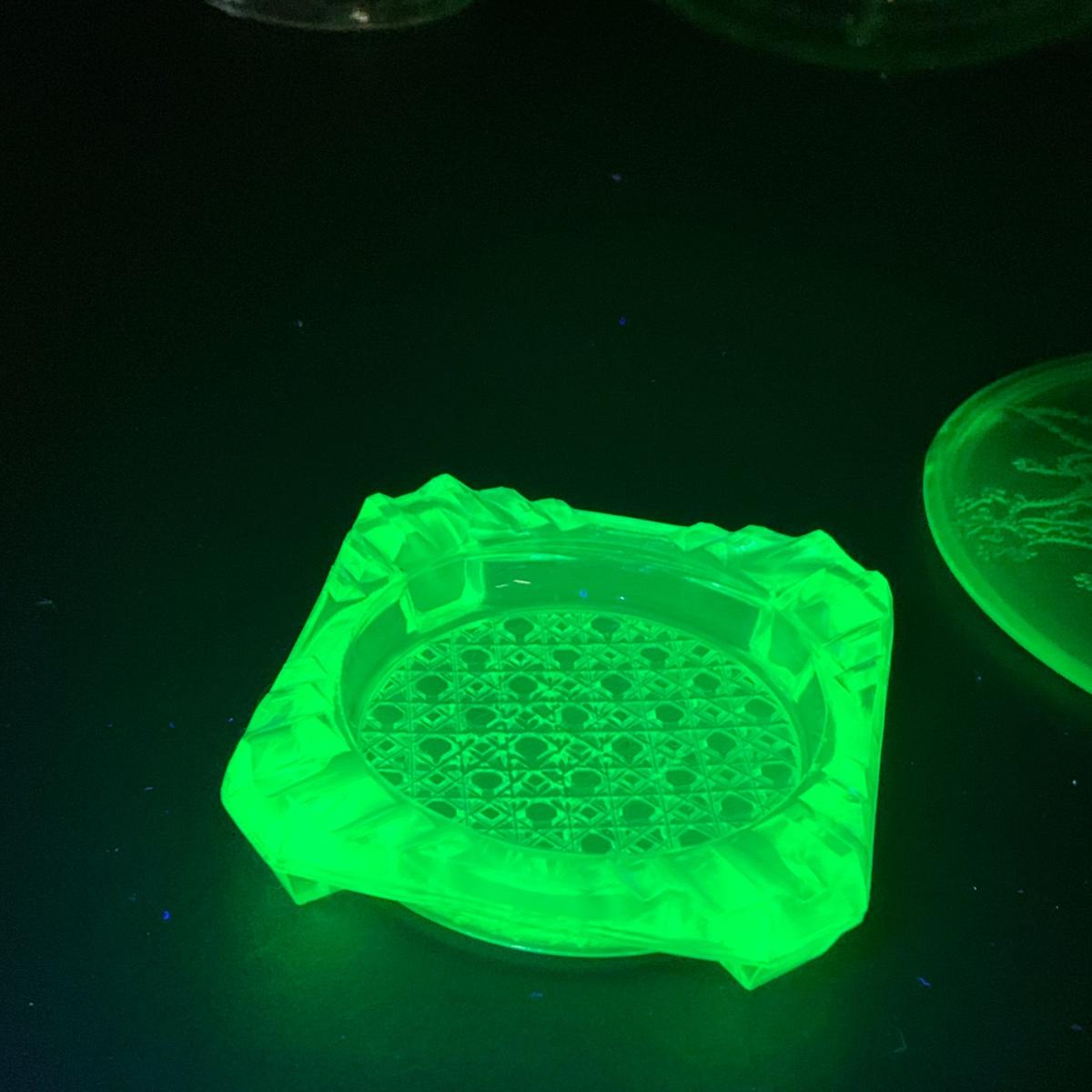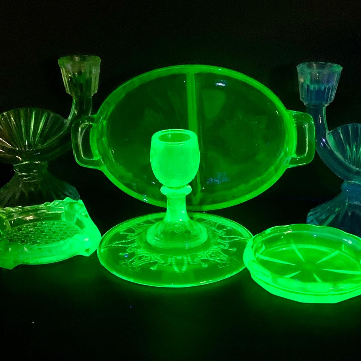 LOT:165: Vintage Green Uranium Glass Candle Stick, Ashtrays, Dish and Green Glass Candle Holders