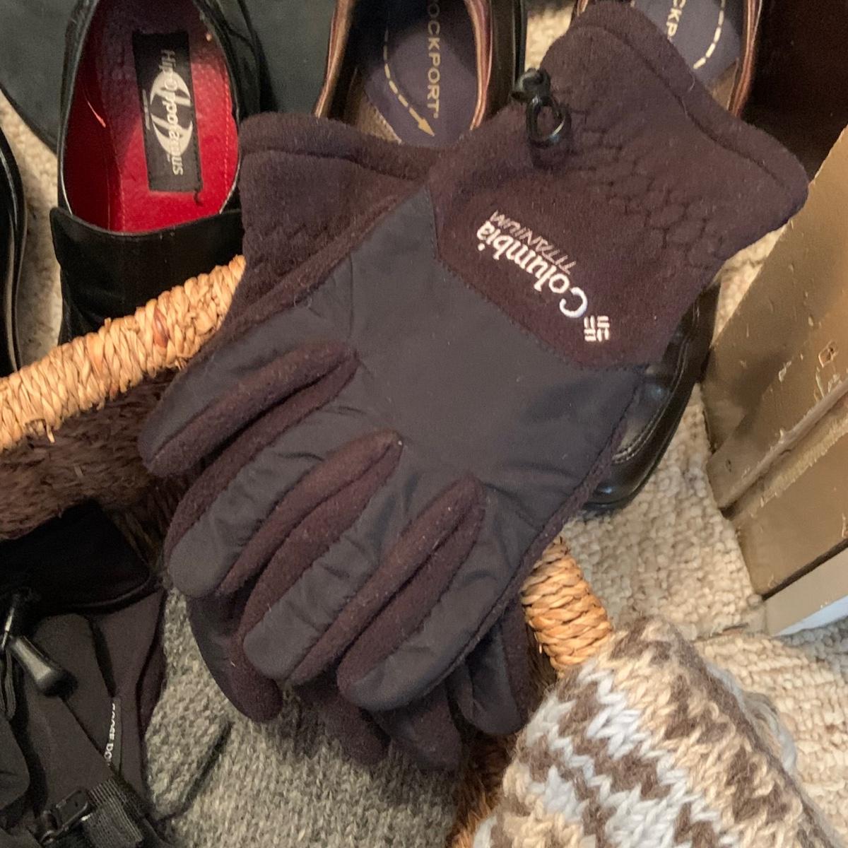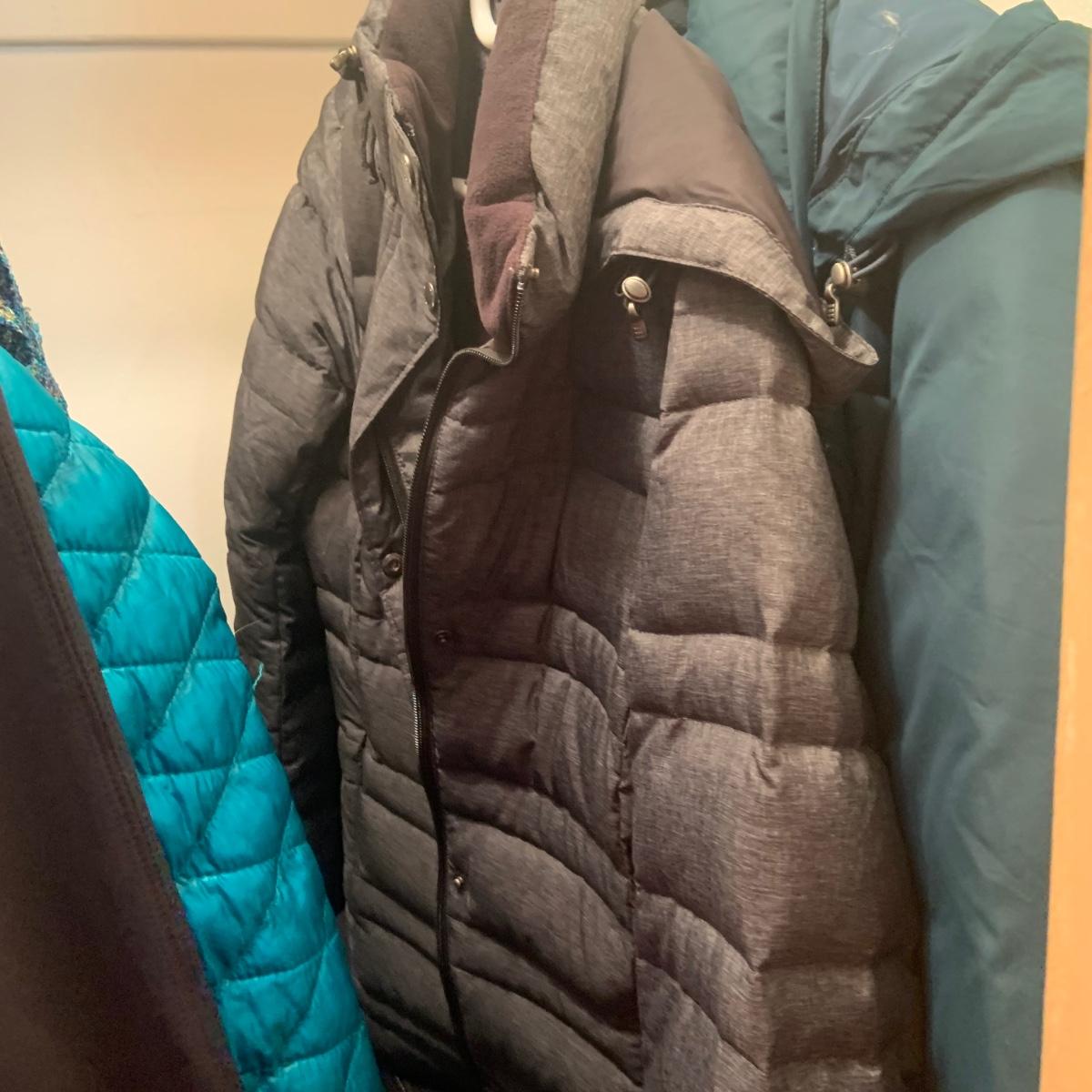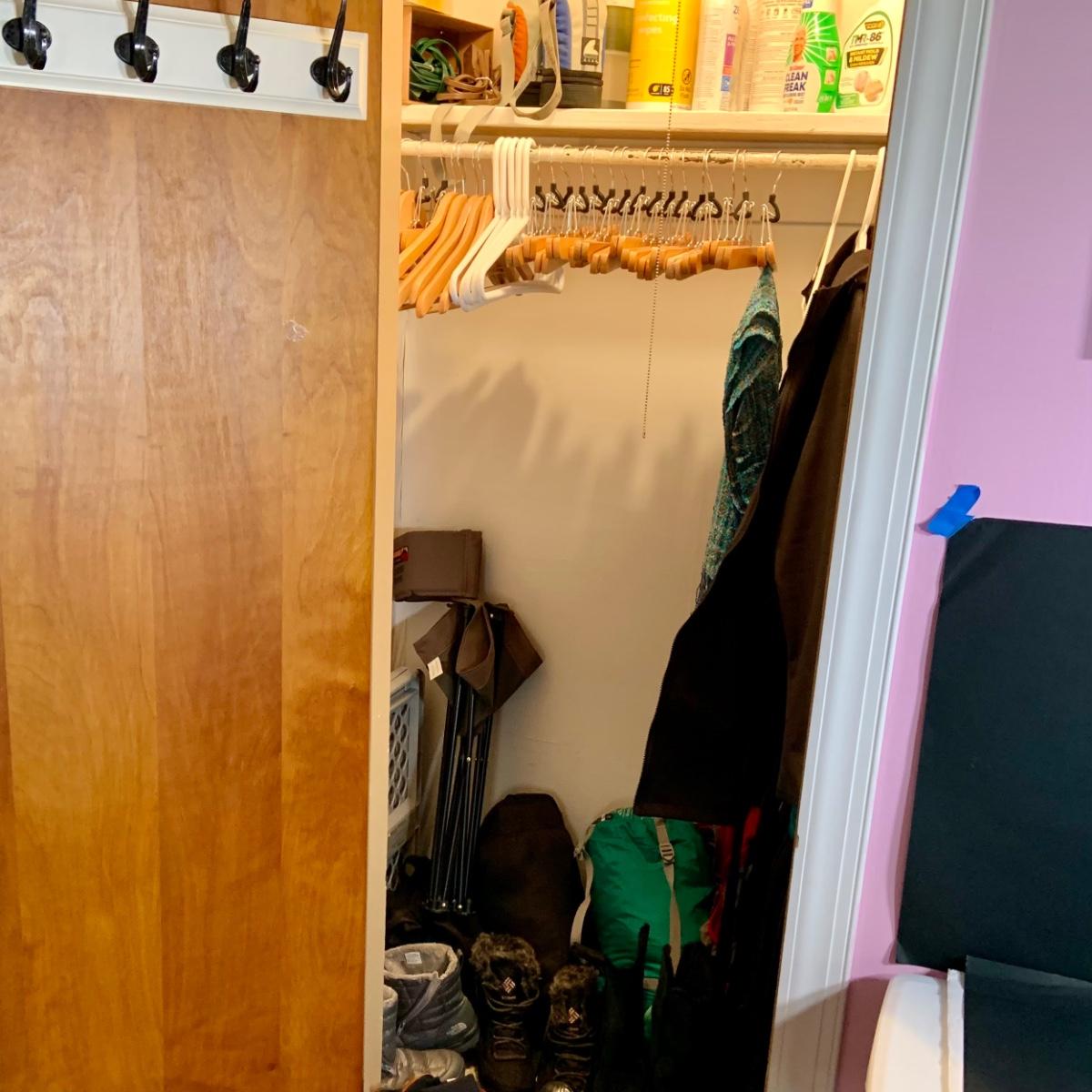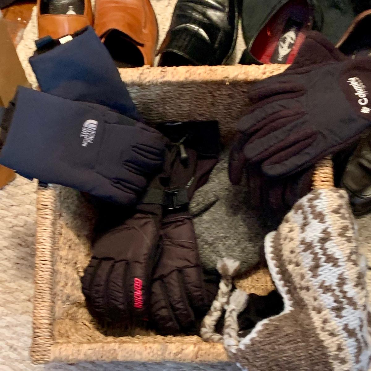 LOT:174: Contents of Closet Including Columbia and North Face Gloves, Boots, Northface and Land's End Coats. Hipoppotamus Italian Leather Shoes, Cleaning Supplies Bowling Ball and Much More