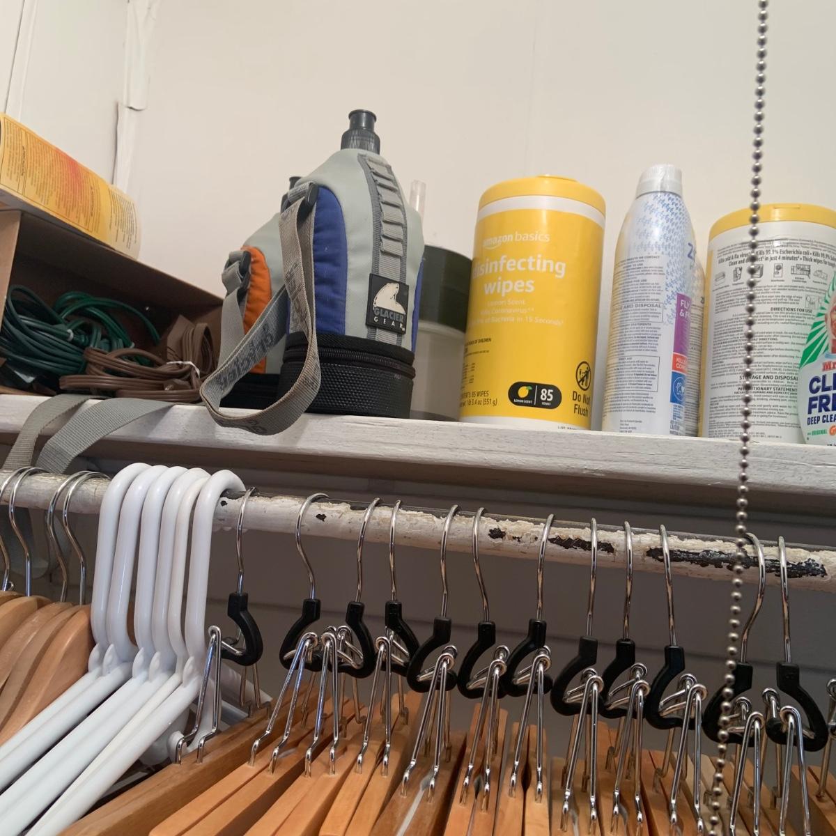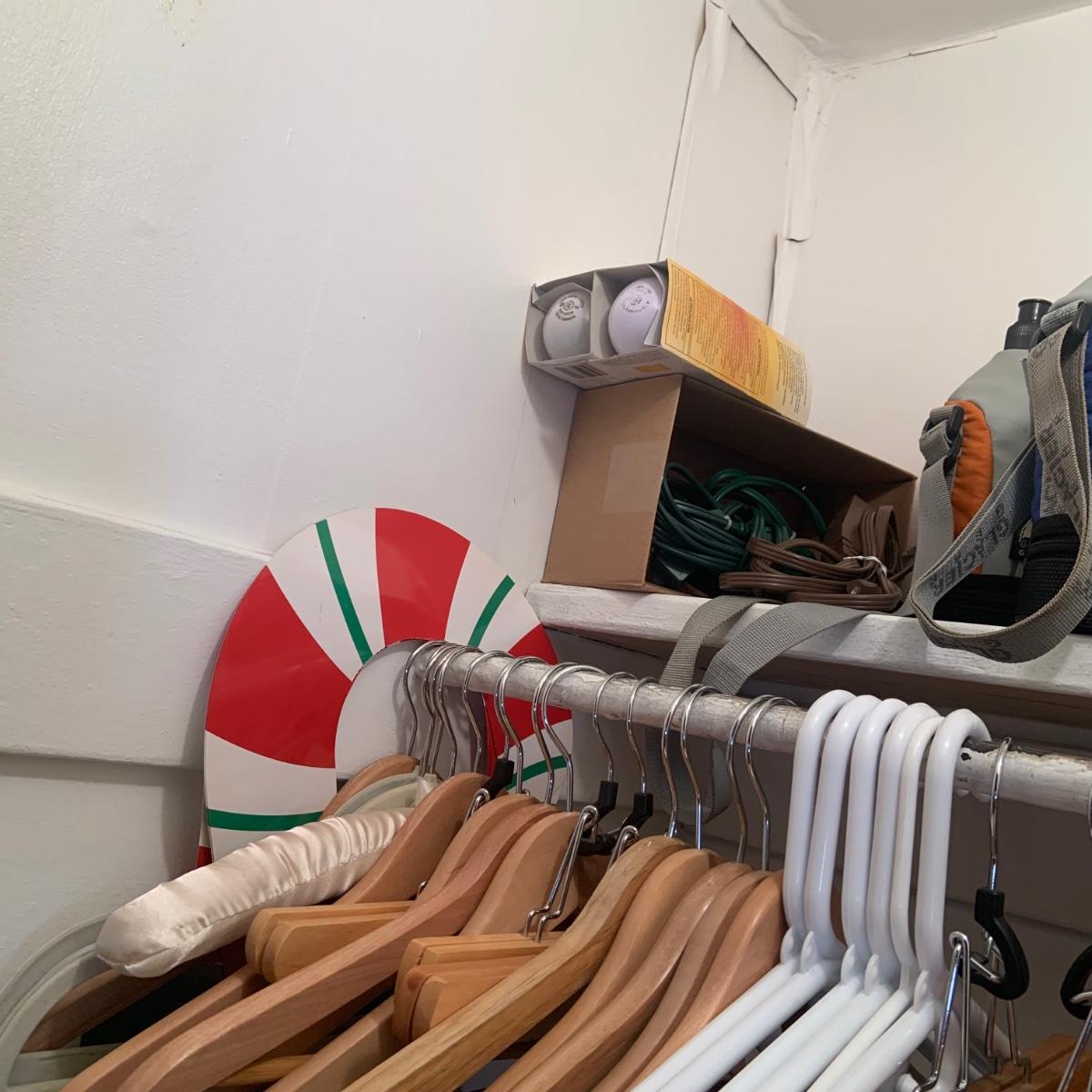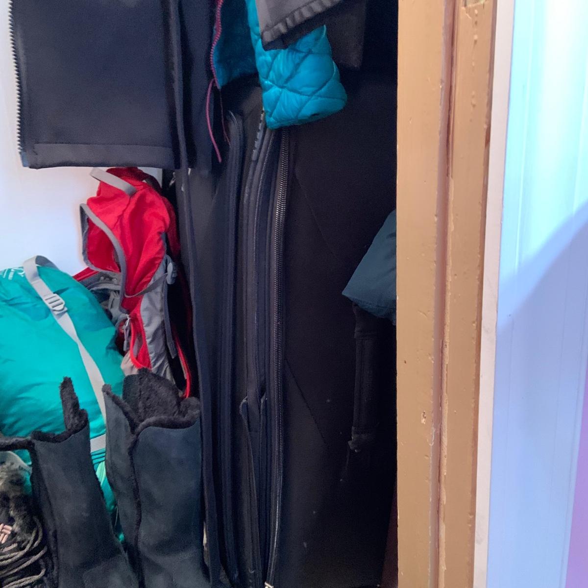 LOT:174: Contents of Closet Including Columbia and North Face Gloves, Boots, Northface and Land's End Coats. Hipoppotamus Italian Leather Shoes, Cleaning Supplies Bowling Ball and Much More