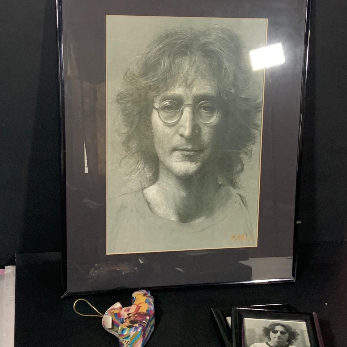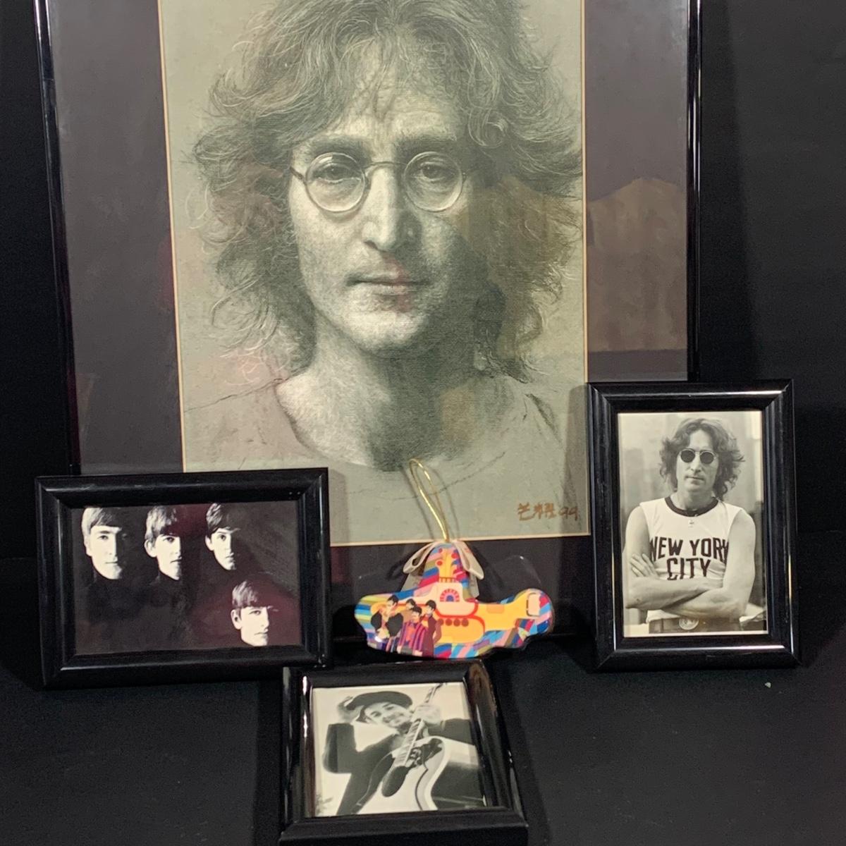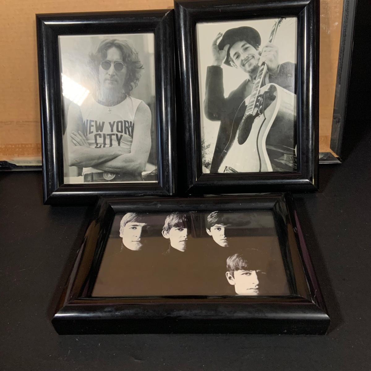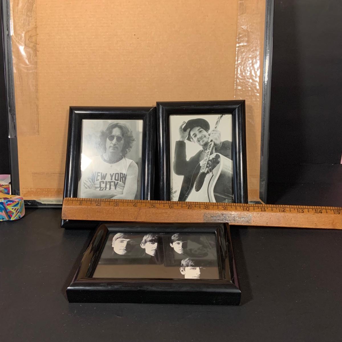 LOT:176: Framed Wall Art Featuring John Lennon, The Beatles and Bob Dylan and a Beatles Ornament