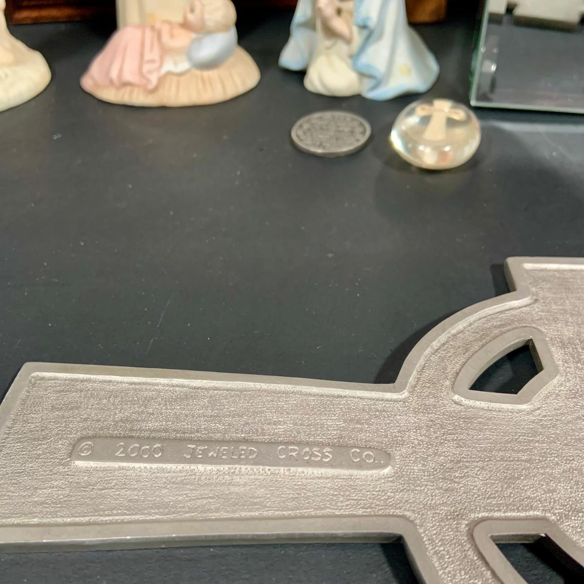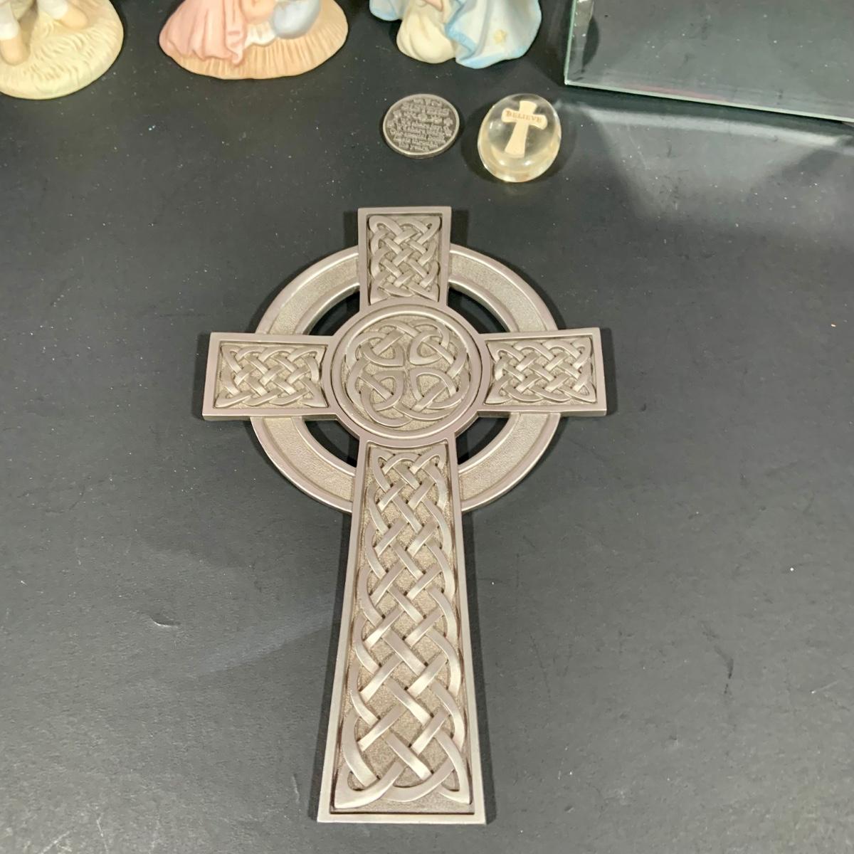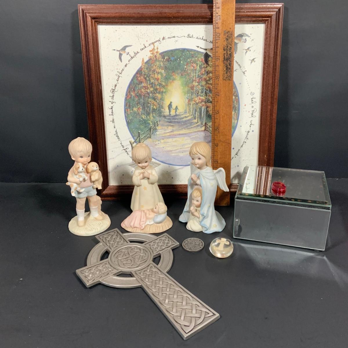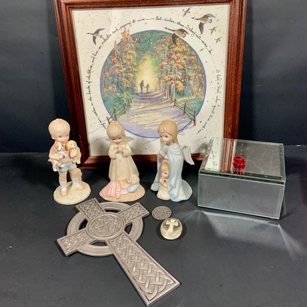LOT:181: Set of 3 Lefton The Christopher Collection Figurines, Inspriational Wall Art, Glass Box, Celtic Style Cross and More