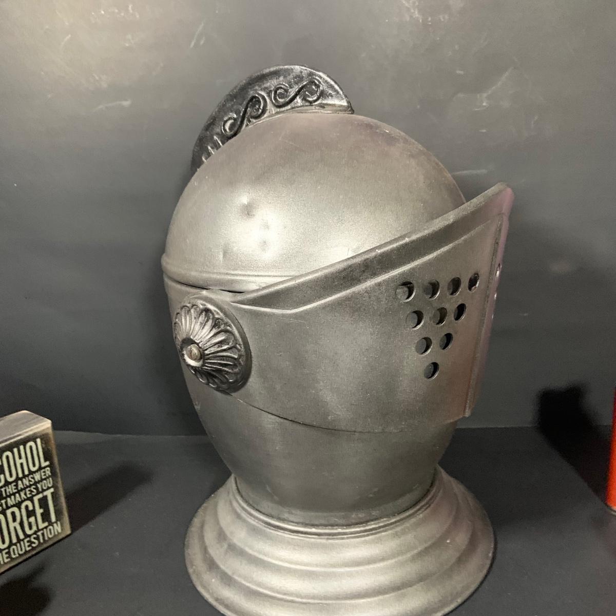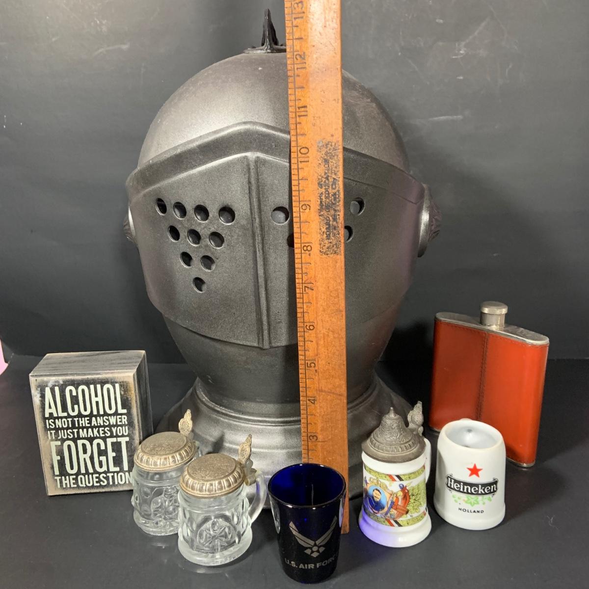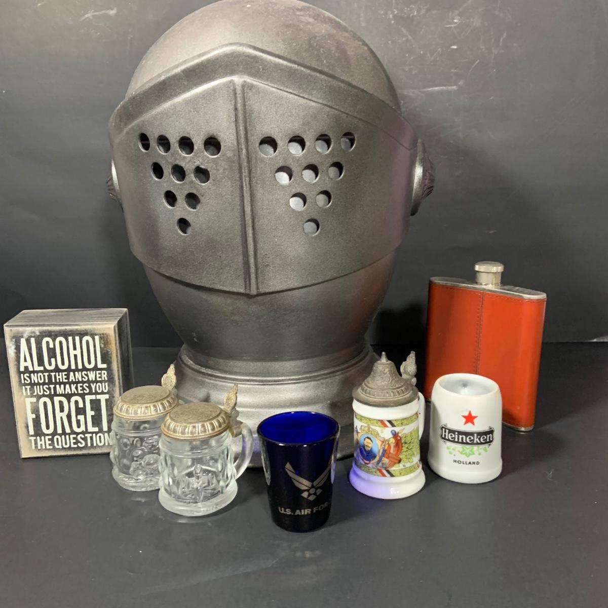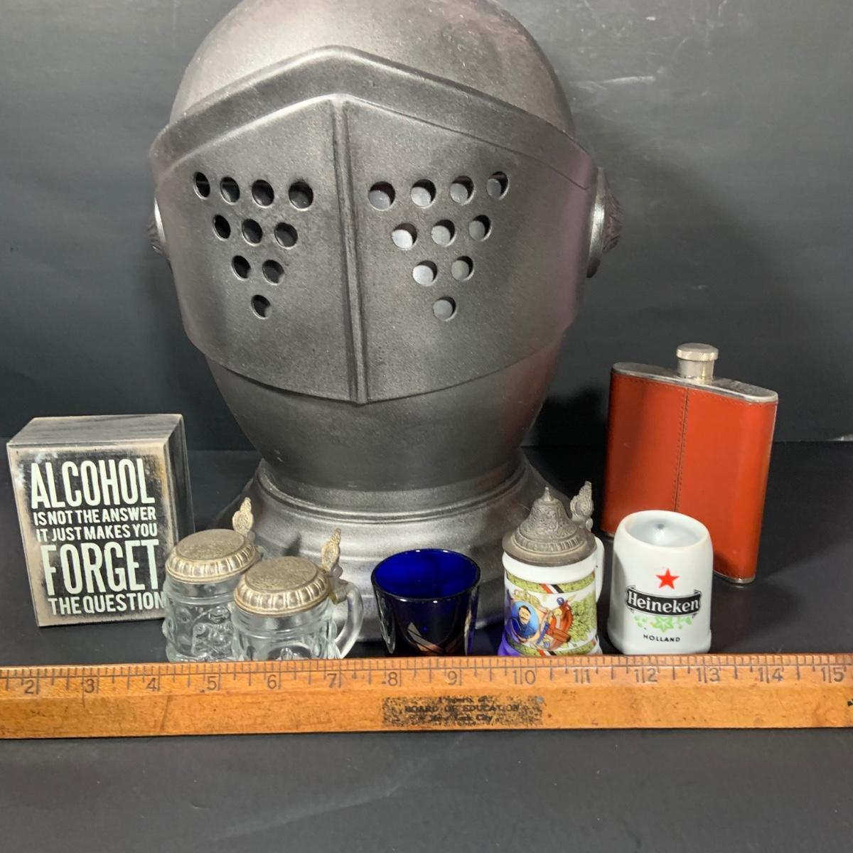 LOT:184: Vintage Kinght Helmet Ice Bucket, Flask, Assorted Shot Glasses and More