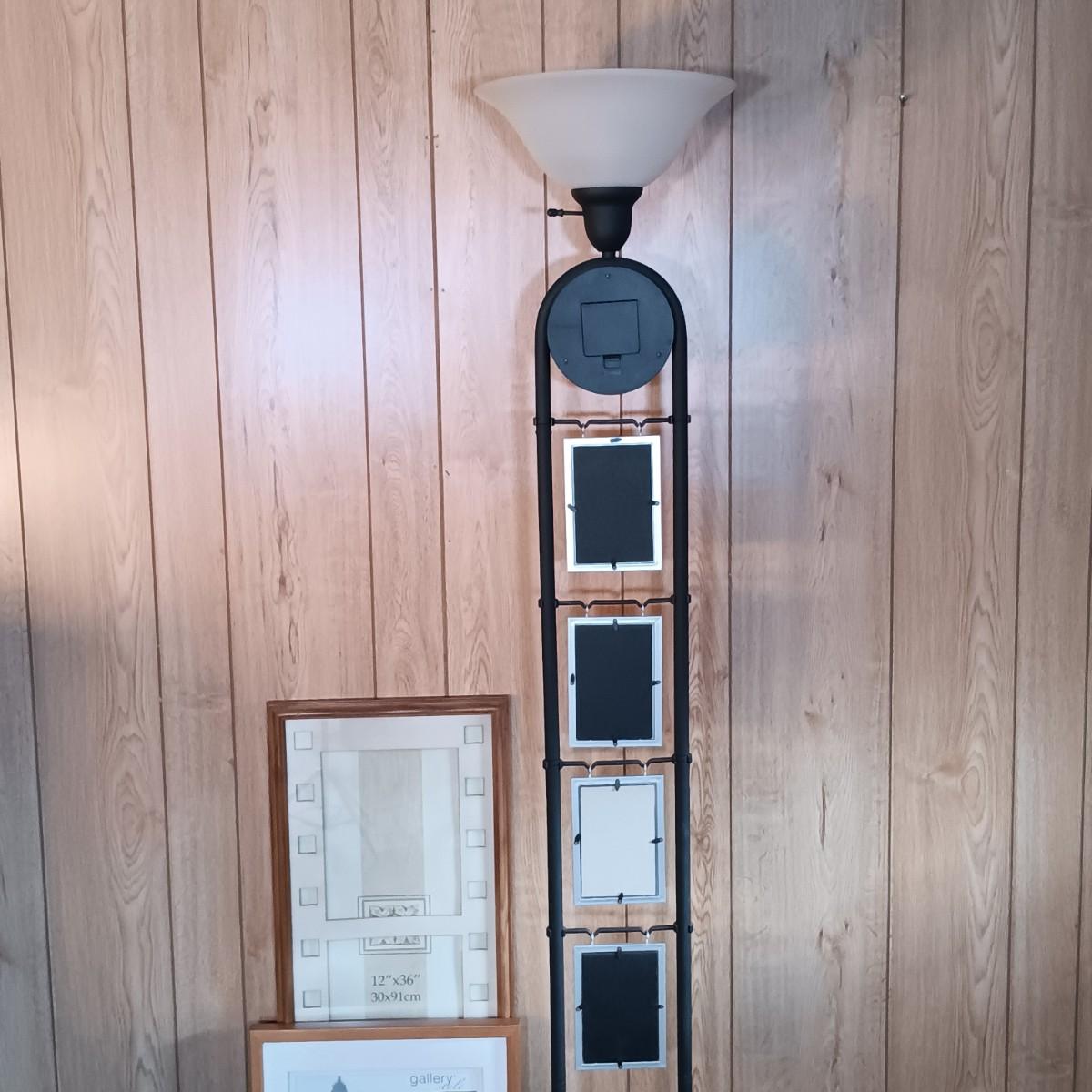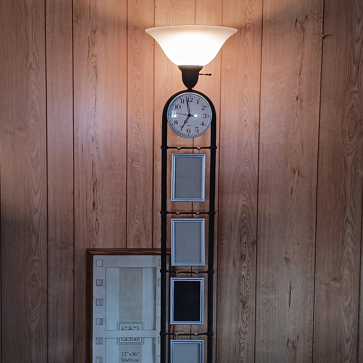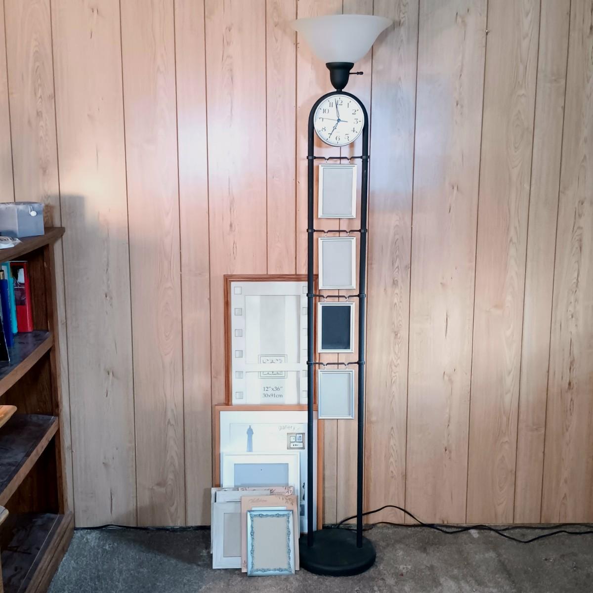 LOT 199: Clock and Picture Frame Floor Lamp with Picture Frames