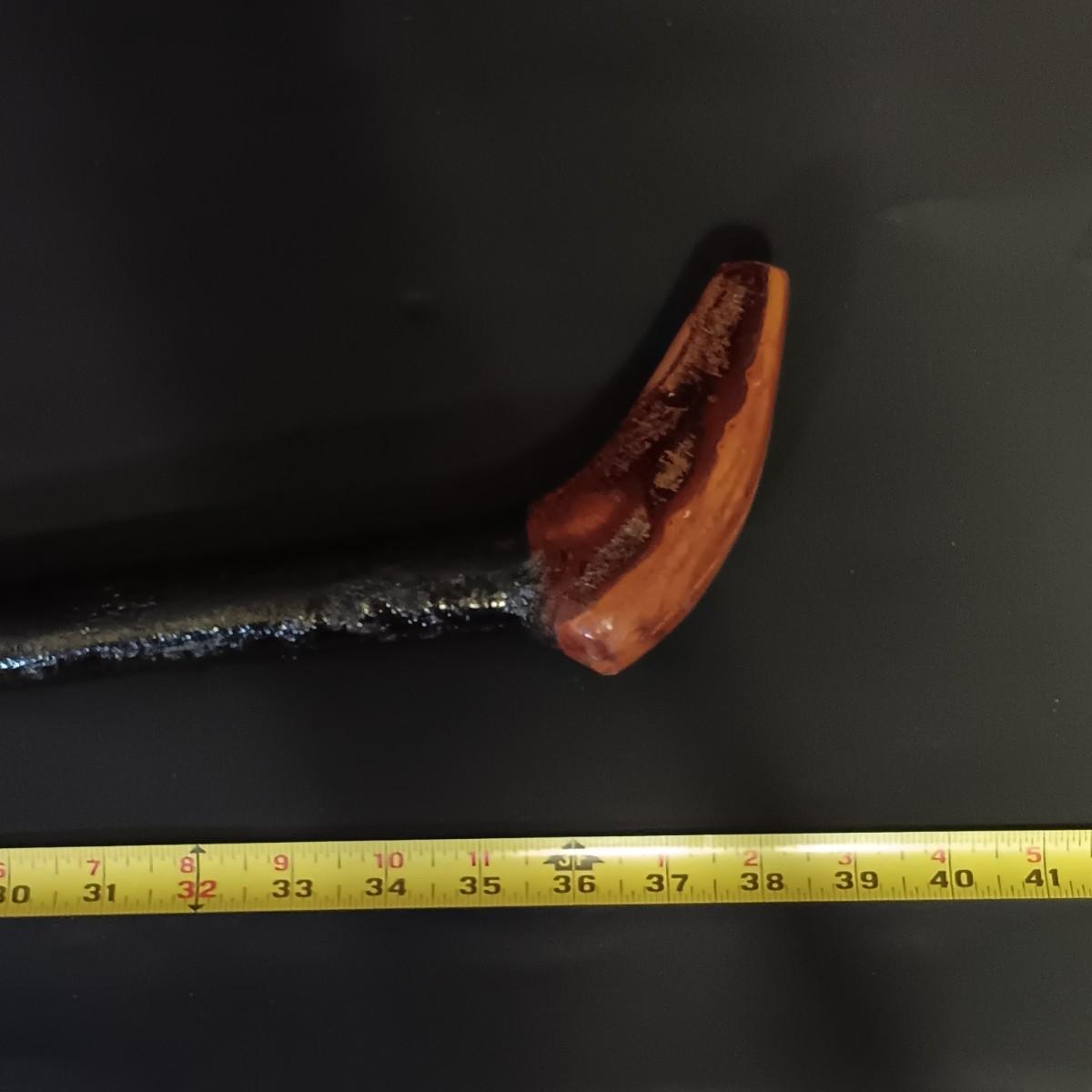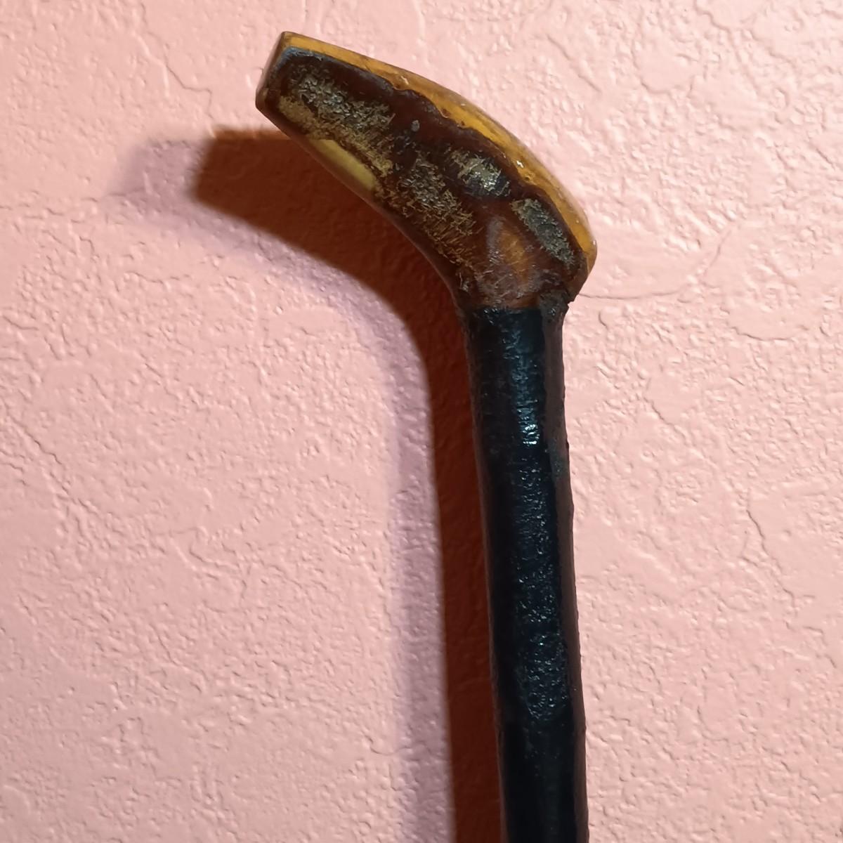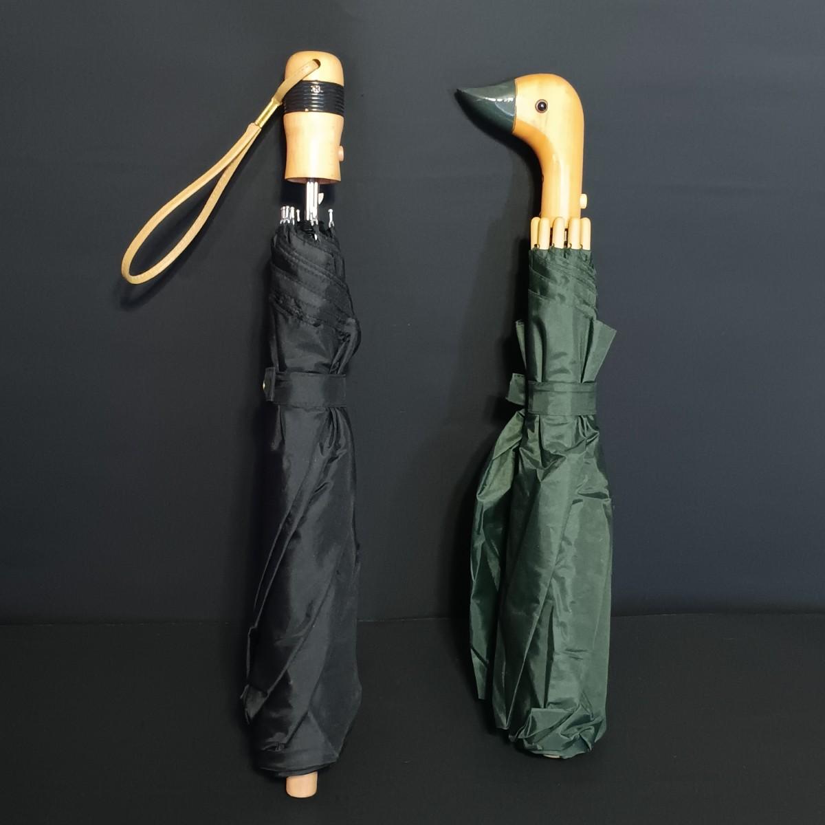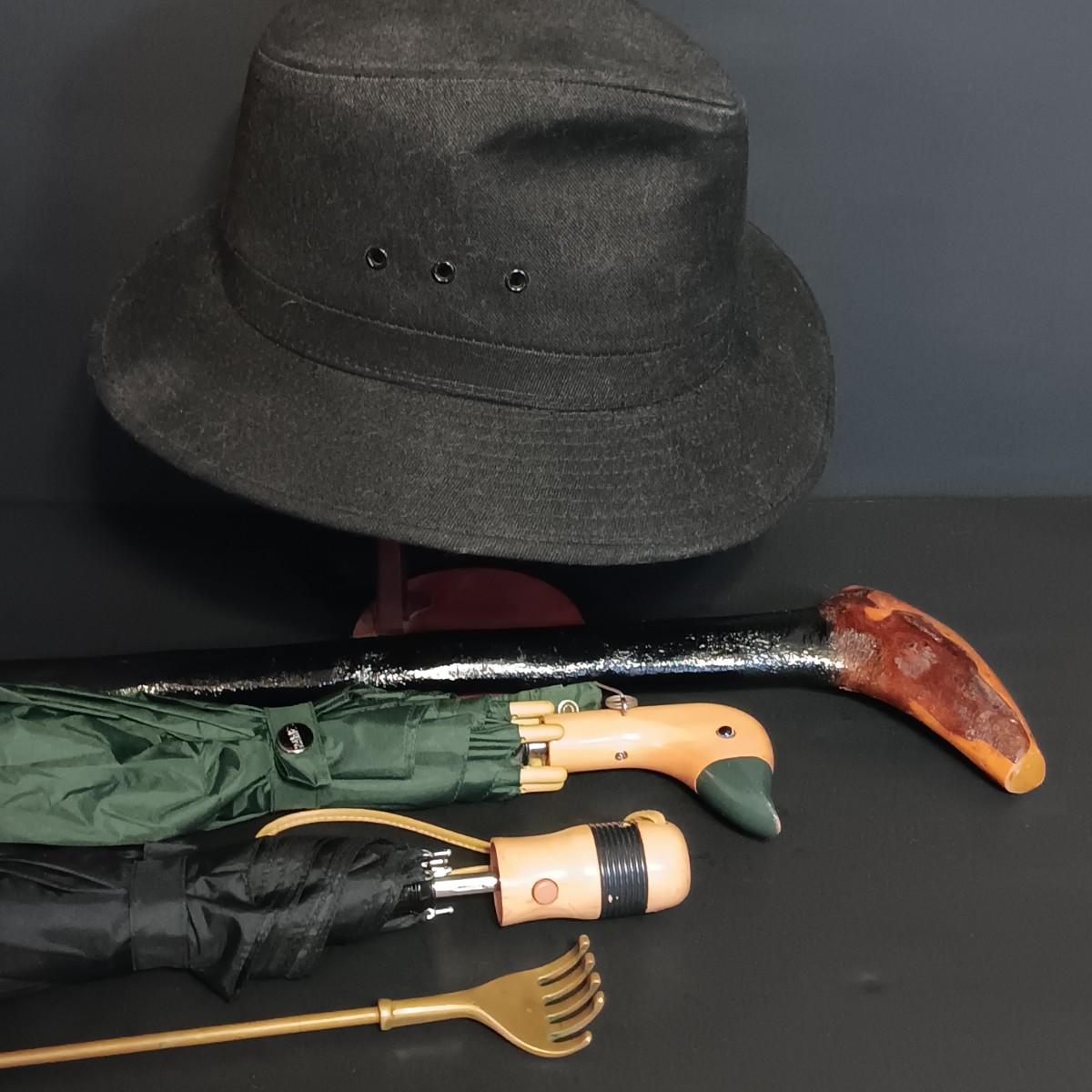 LOT 208: Blackthorn Walking Stick, Brass Shoe Horn / Scratcher, Dorman Pacific Hat & Vintage Wood Handled Umbrellas