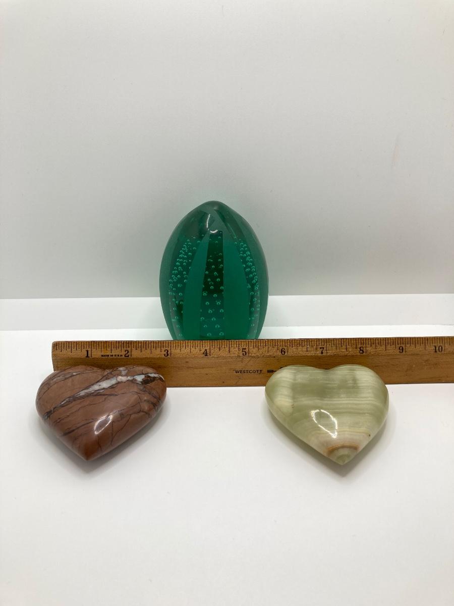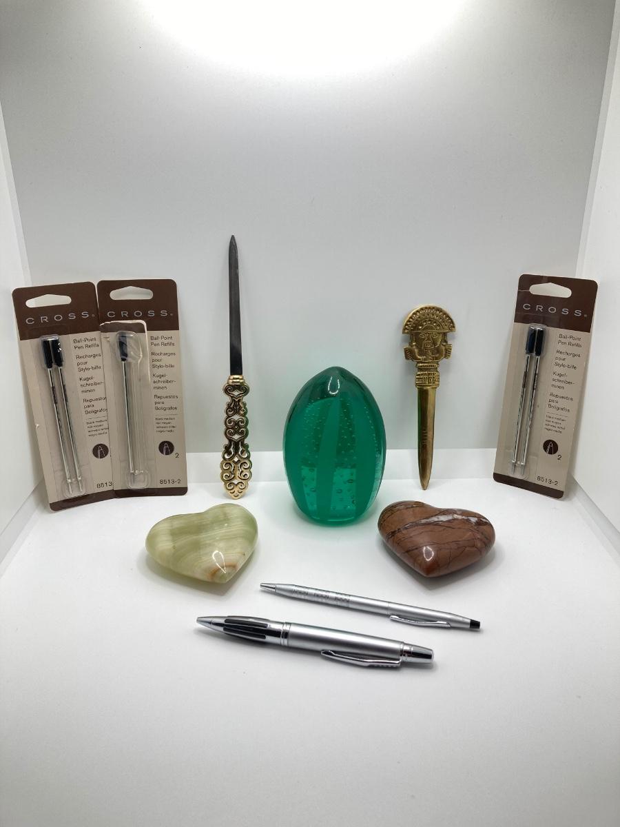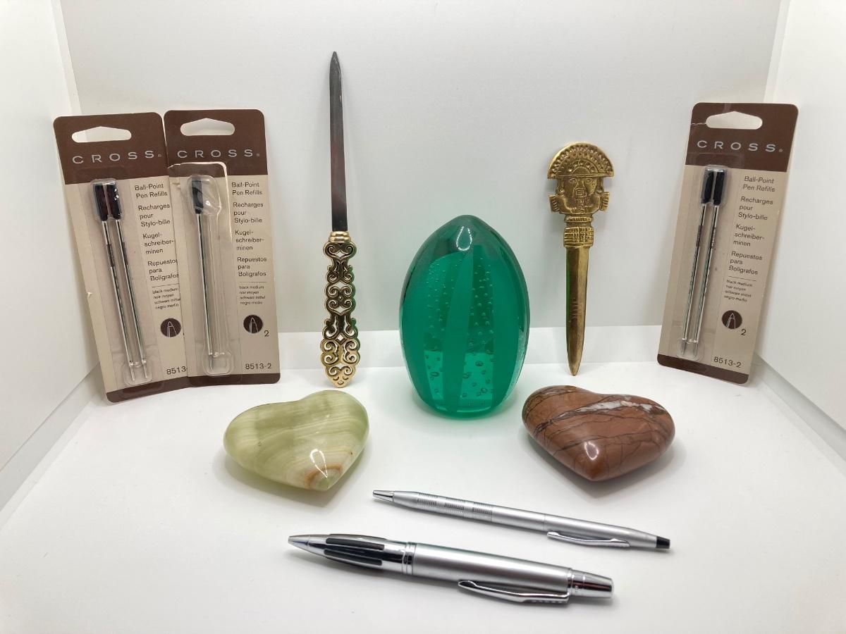 LOT 230: Classic Desk / Writing Collection - Signed A Depalma Paperweight, Onyx Heart Paperweights, Cross Pens / Refills and Letter Openers