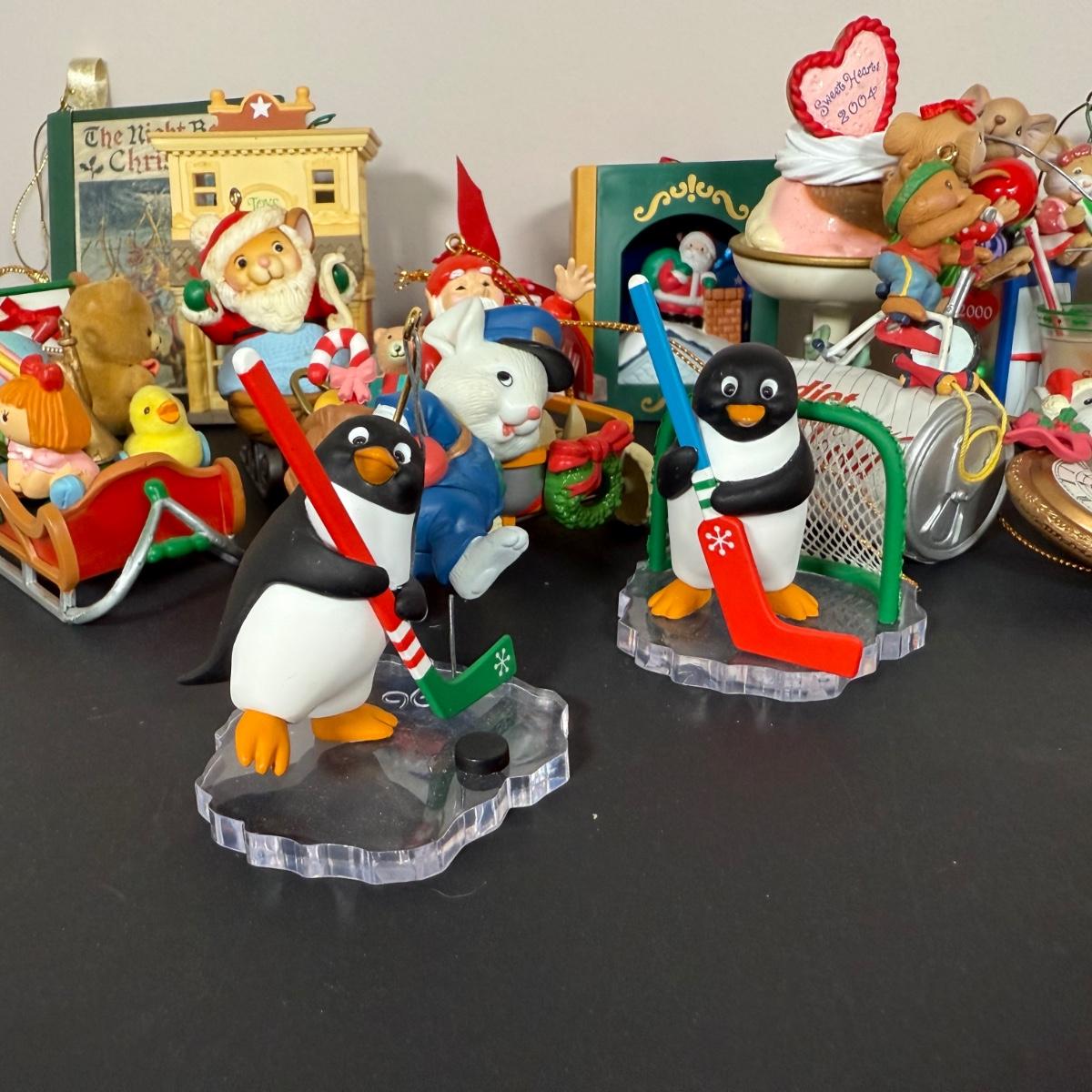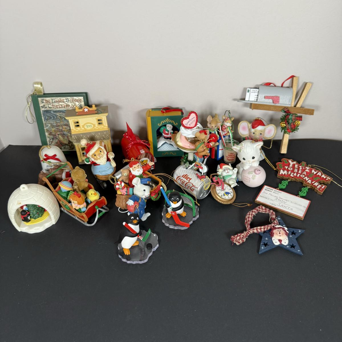 LOT 8G: Kurt S Adler Mailbox, Diet Coke, Raggedy Ann Rustic Star Ornament, Hockey Penguins & More Christmas Ornaments