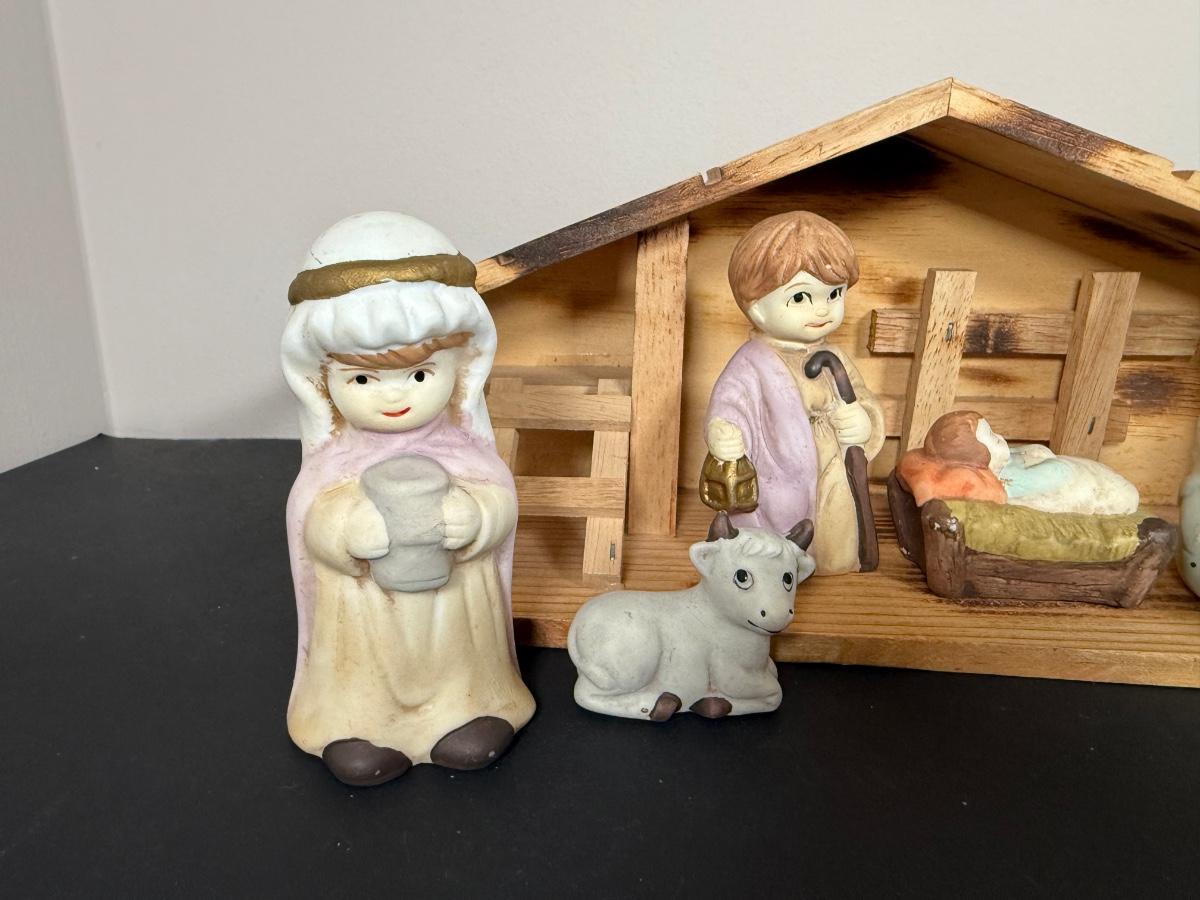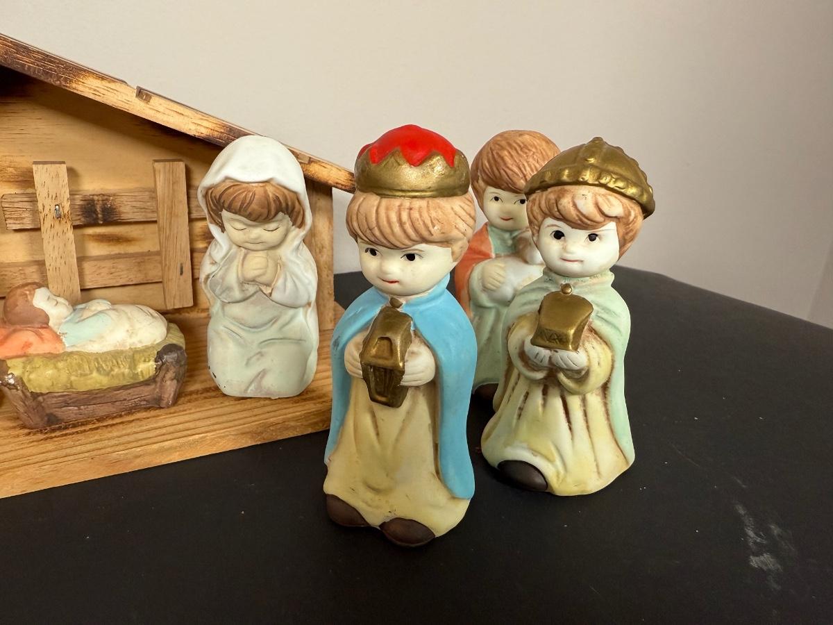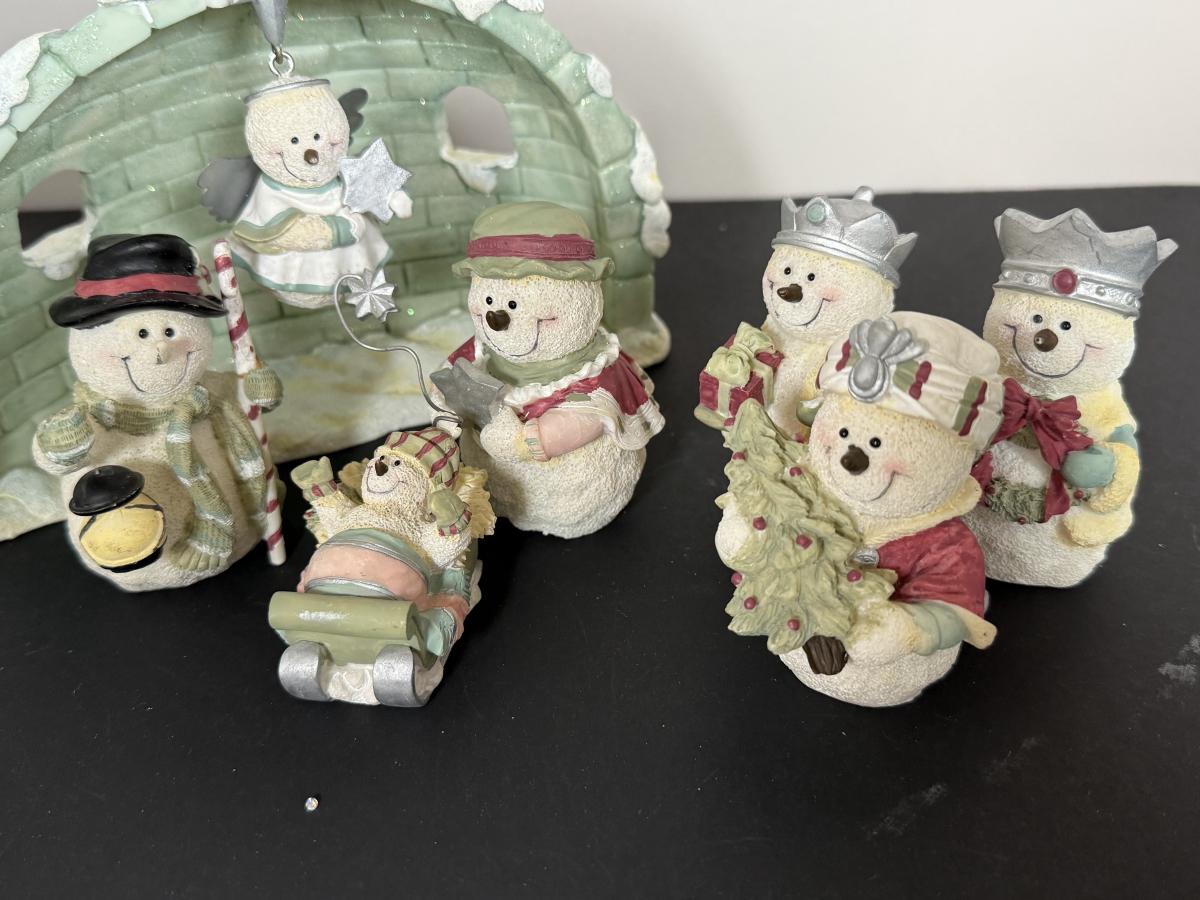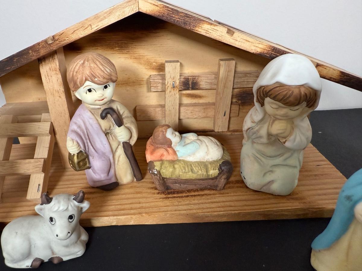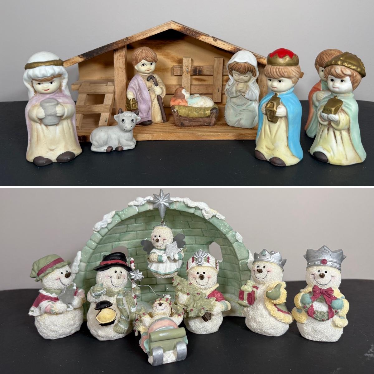 LOT 12G: Nativity Collection - Vintage Porcelain Children w/ Wooden Creche & Snowpeople w/ Igloo Creche