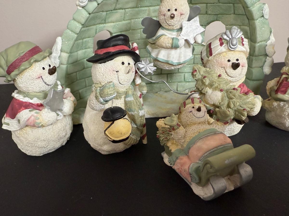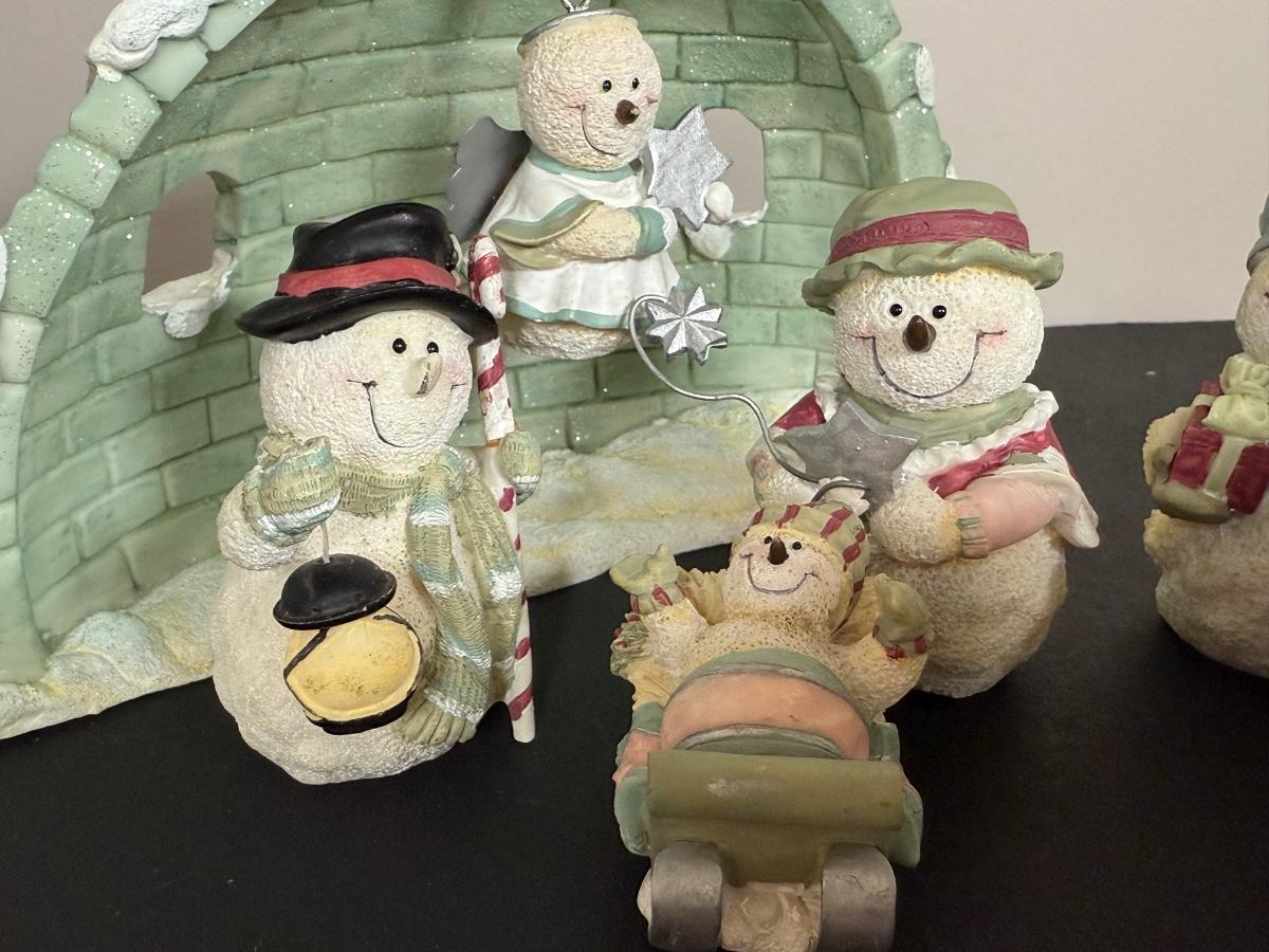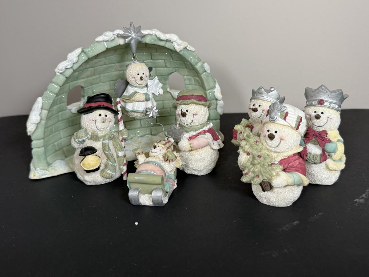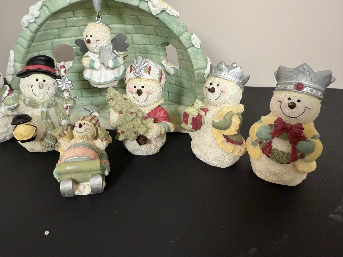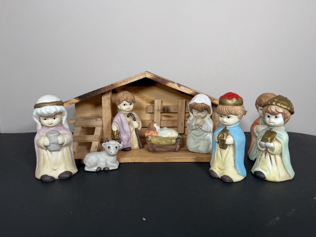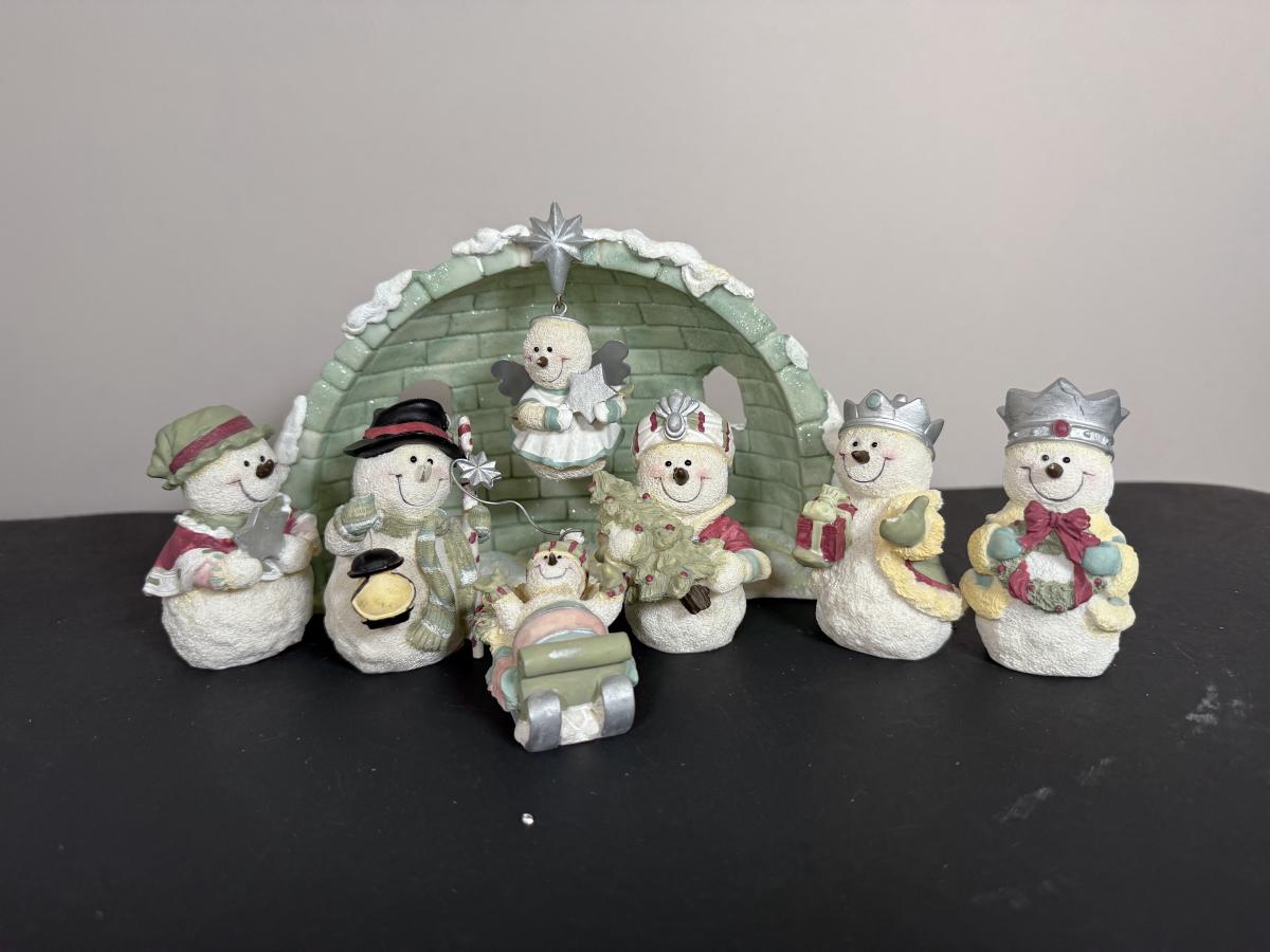 LOT 12G: Nativity Collection - Vintage Porcelain Children w/ Wooden Creche & Snowpeople w/ Igloo Creche