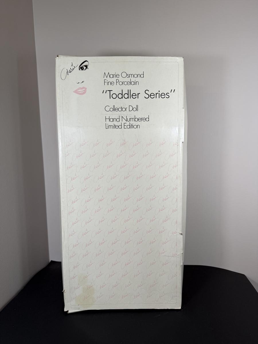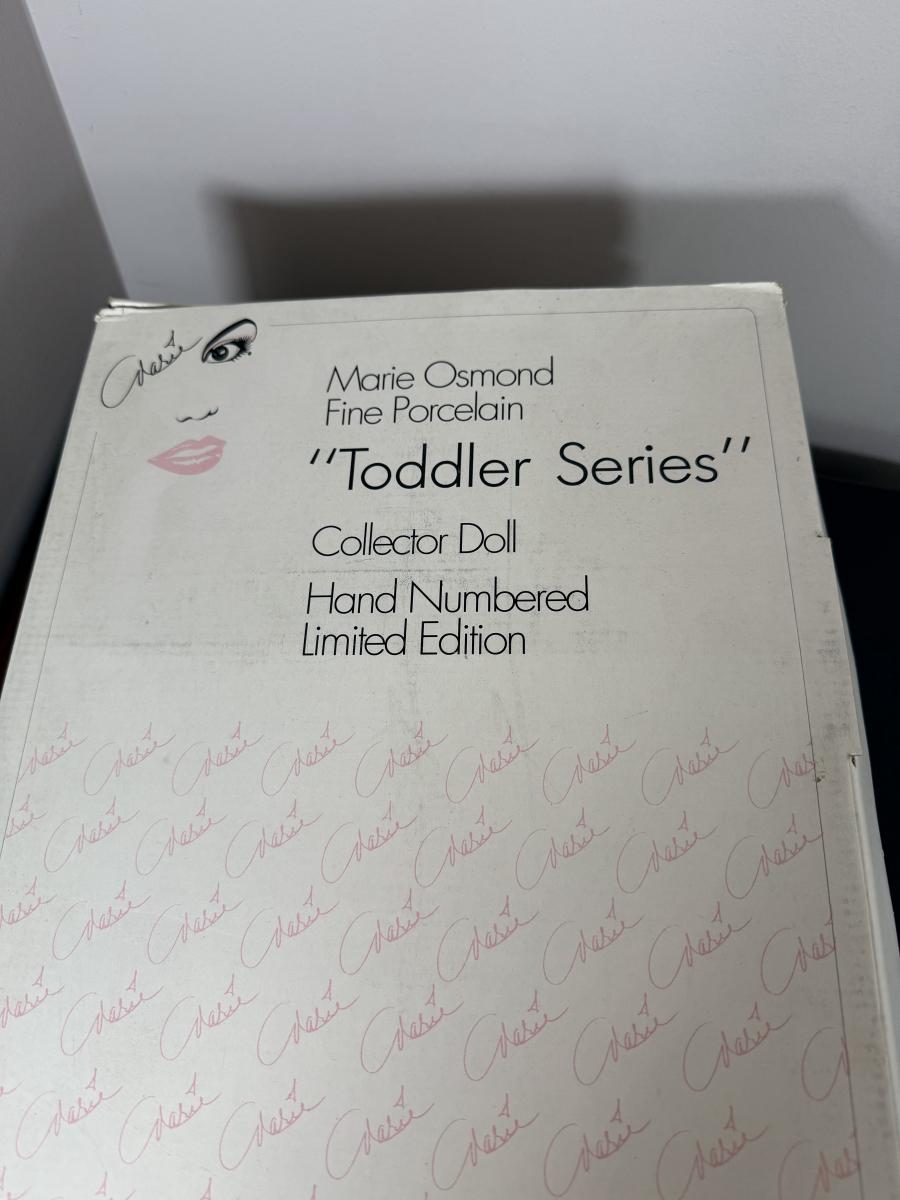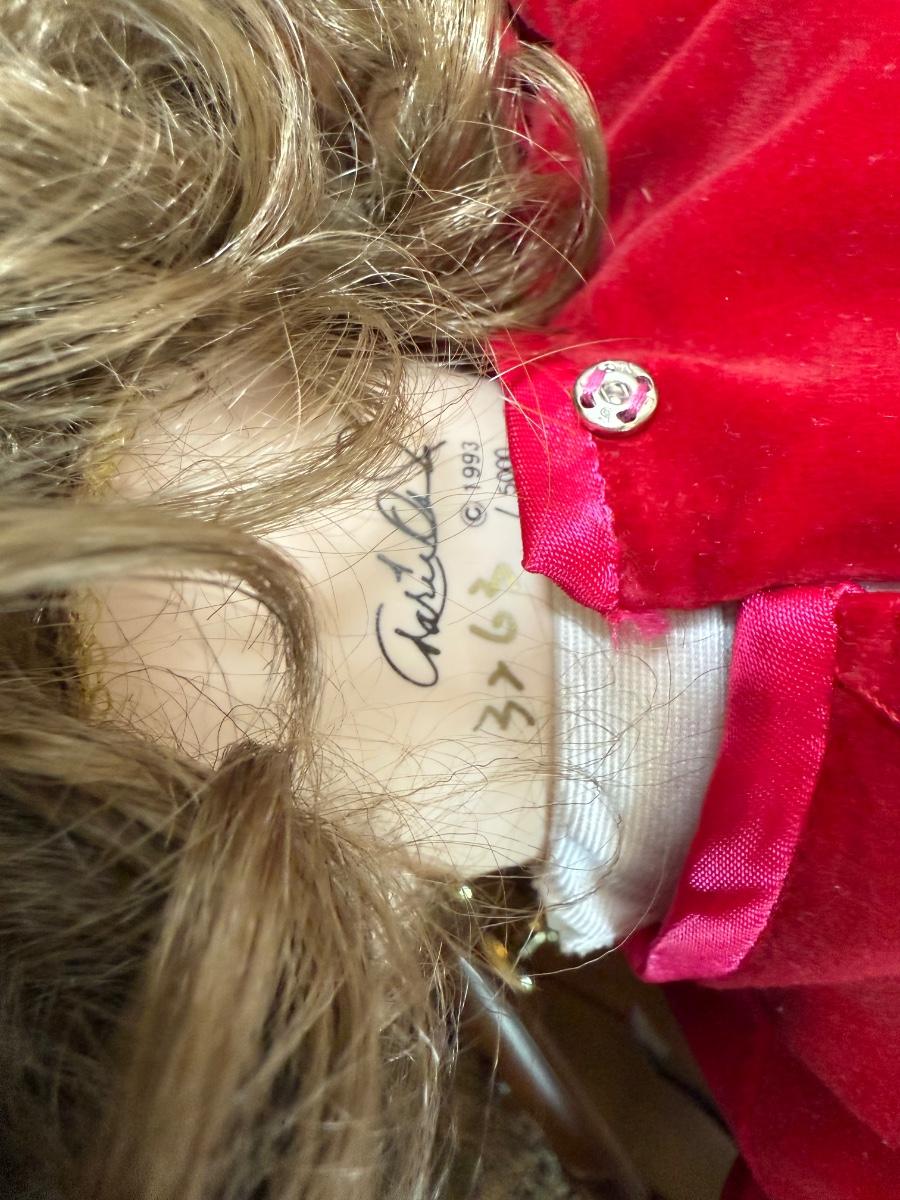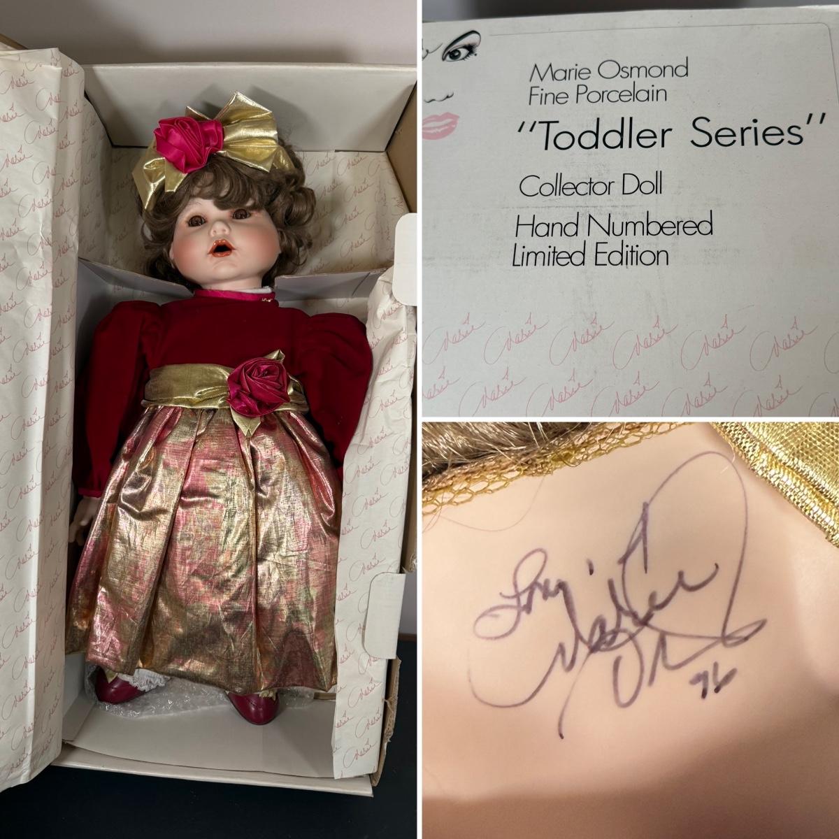 LOT 19G: Signed by Marie Osmond 1996 Porcelain Marie Osmond Toddler Series Collector Doll w/ Box - Gold & Red Dress, #3763/5000