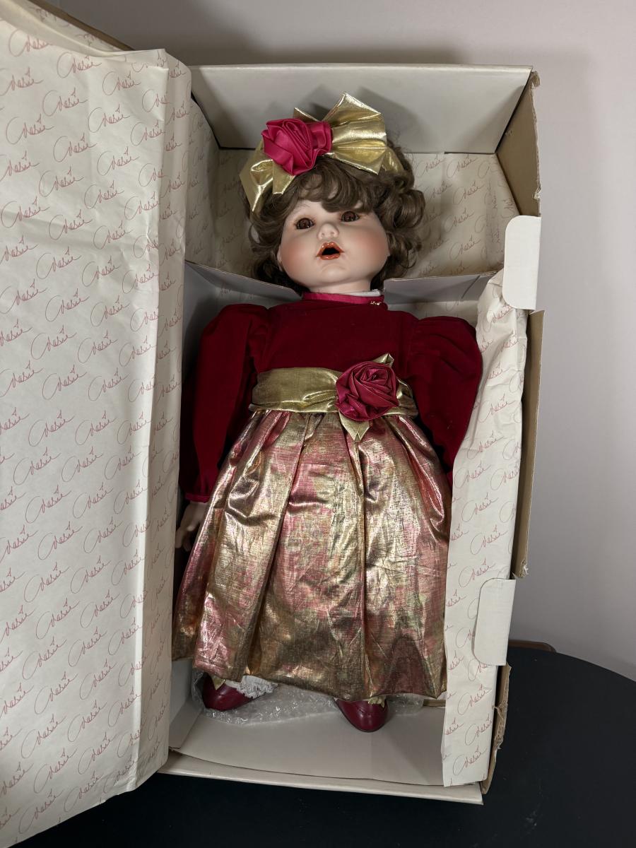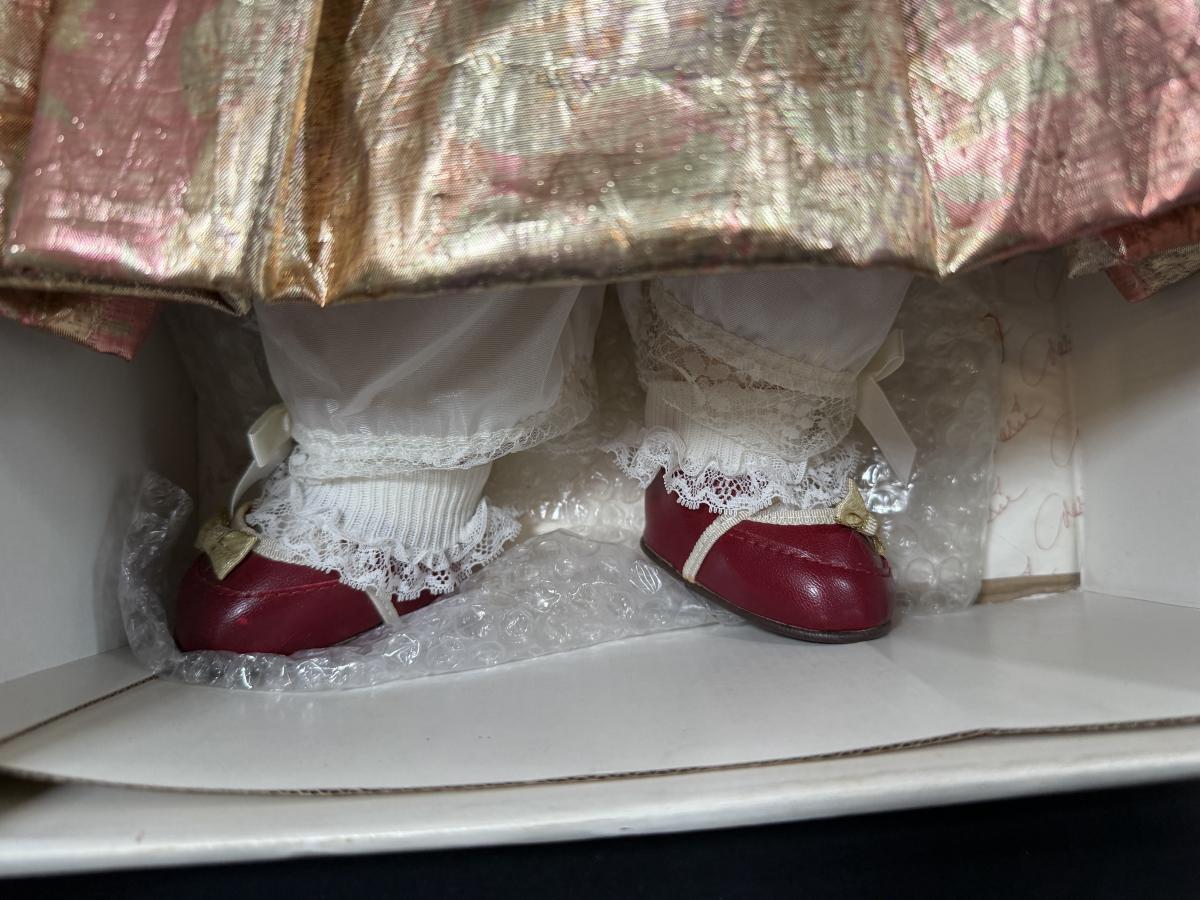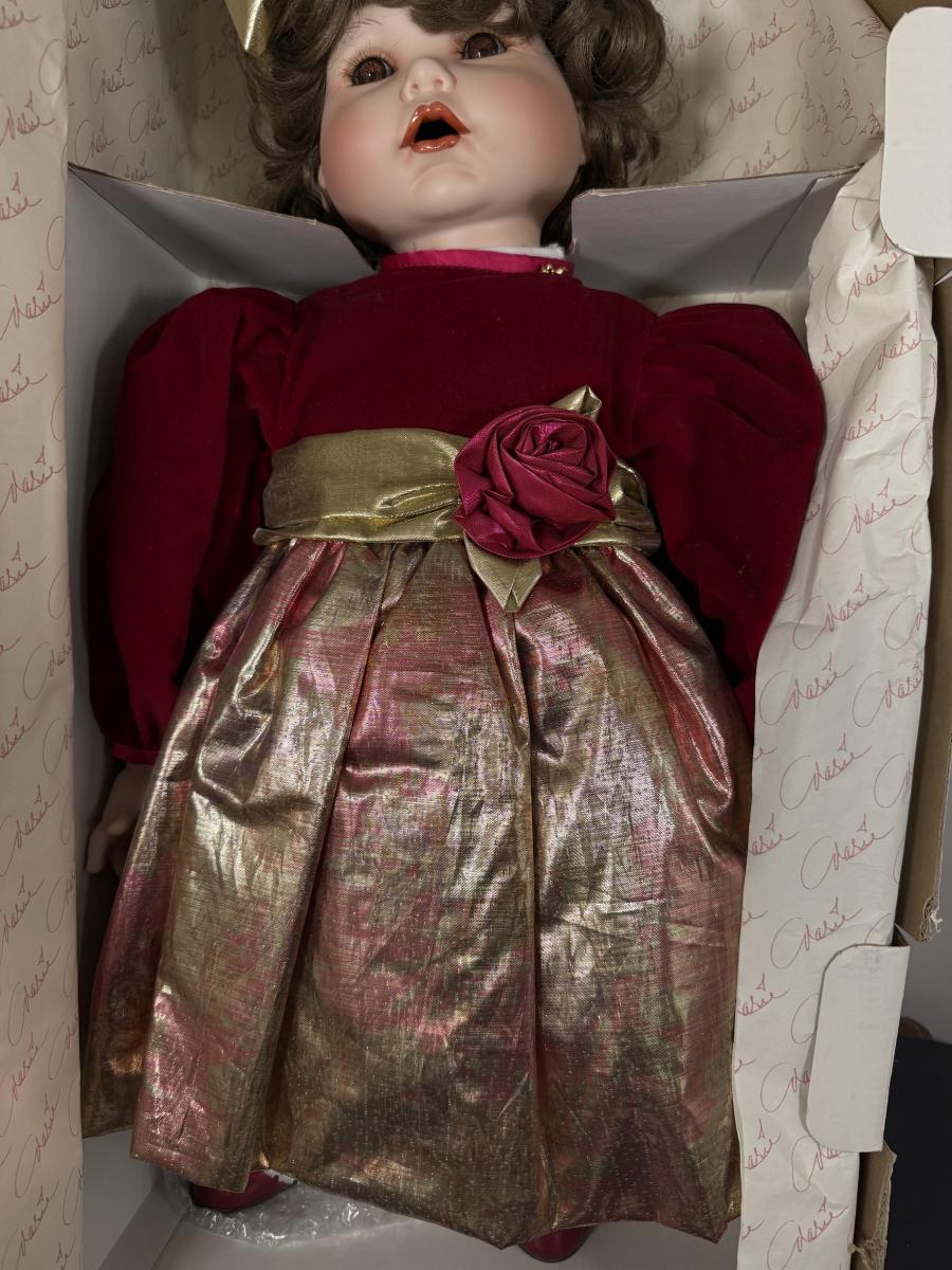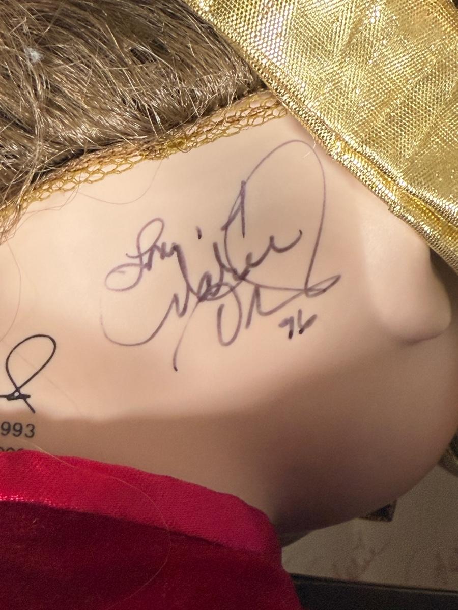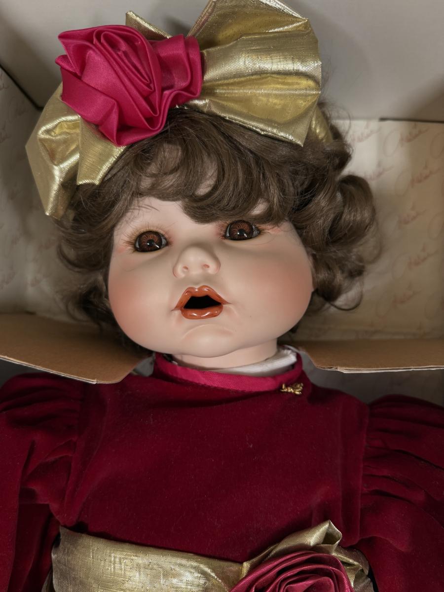 LOT 19G: Signed by Marie Osmond 1996 Porcelain Marie Osmond Toddler Series Collector Doll w/ Box - Gold & Red Dress, #3763/5000