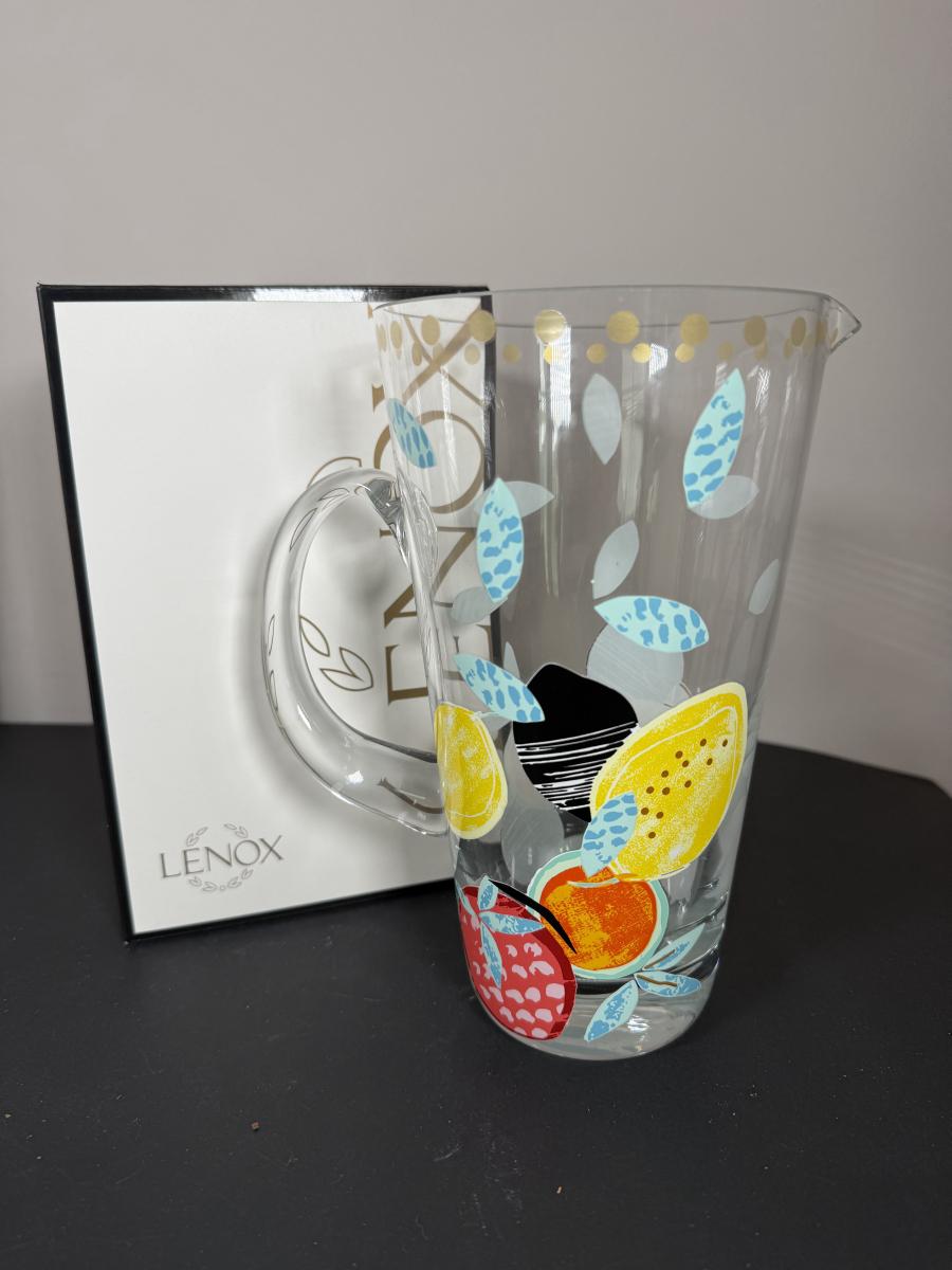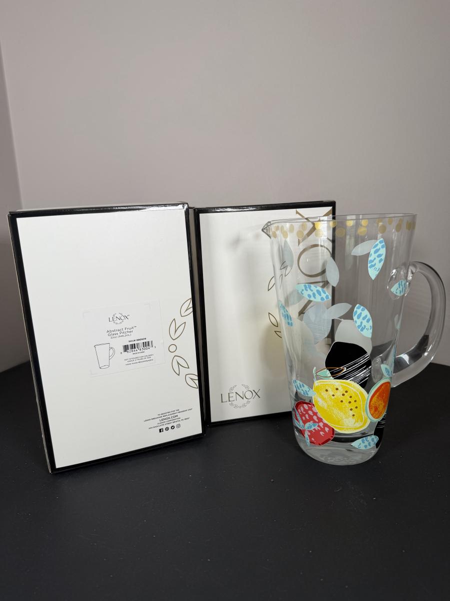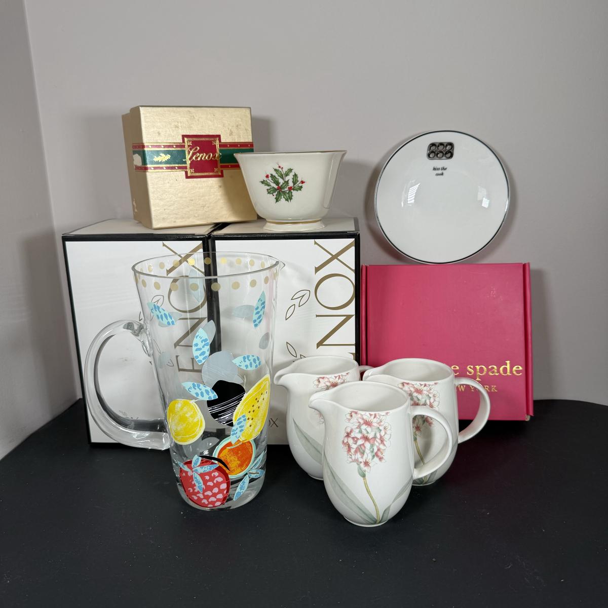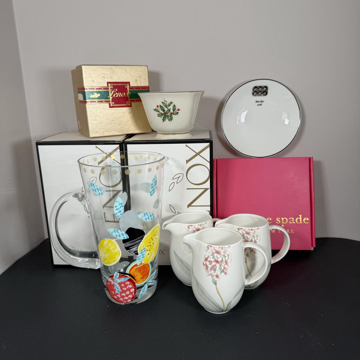 LOT 81G: Lenox Collection - 2 Abstract Fruit Glass Pitchers w/ Boxes, Kate Spade Concord Square Cause A Stir Tidbit Plates w/ Box, Vintage Holly Bowl & More
