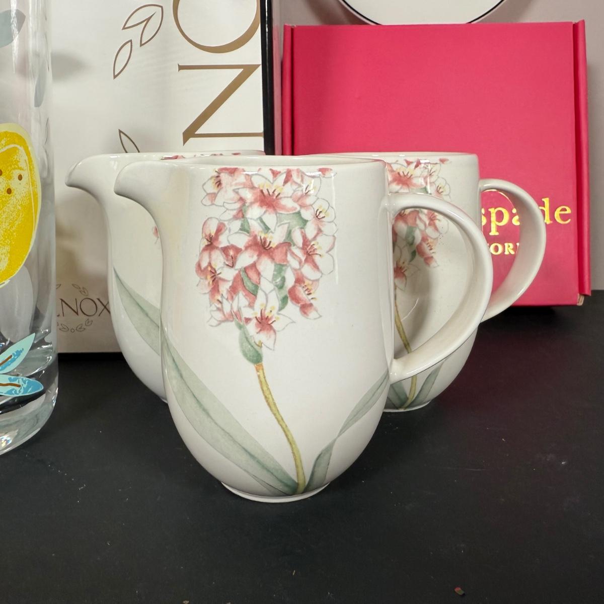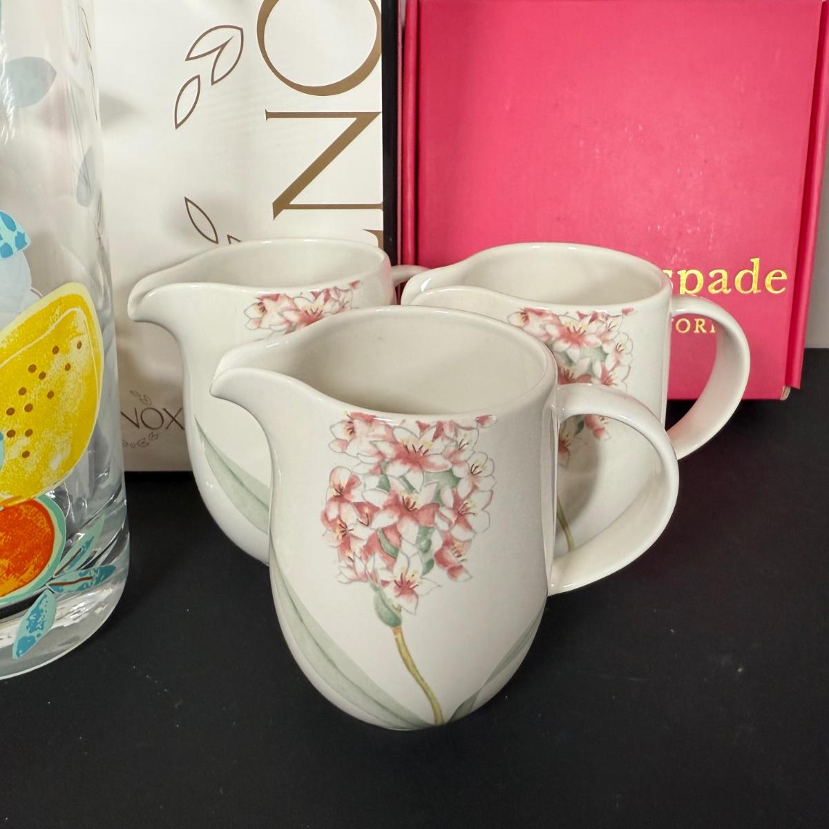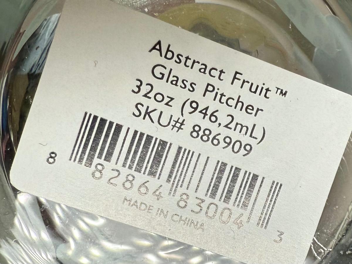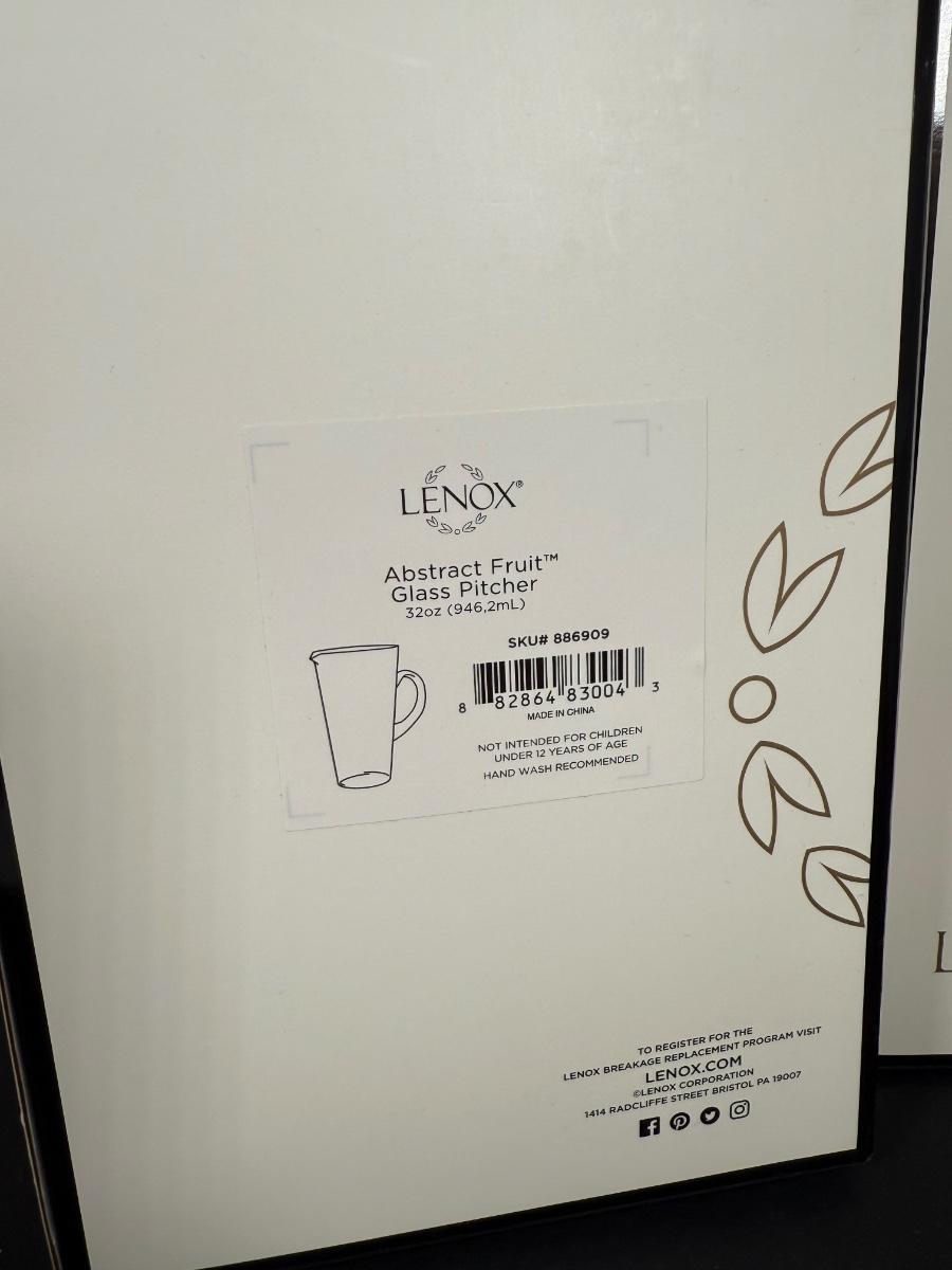 LOT 81G: Lenox Collection - 2 Abstract Fruit Glass Pitchers w/ Boxes, Kate Spade Concord Square Cause A Stir Tidbit Plates w/ Box, Vintage Holly Bowl & More