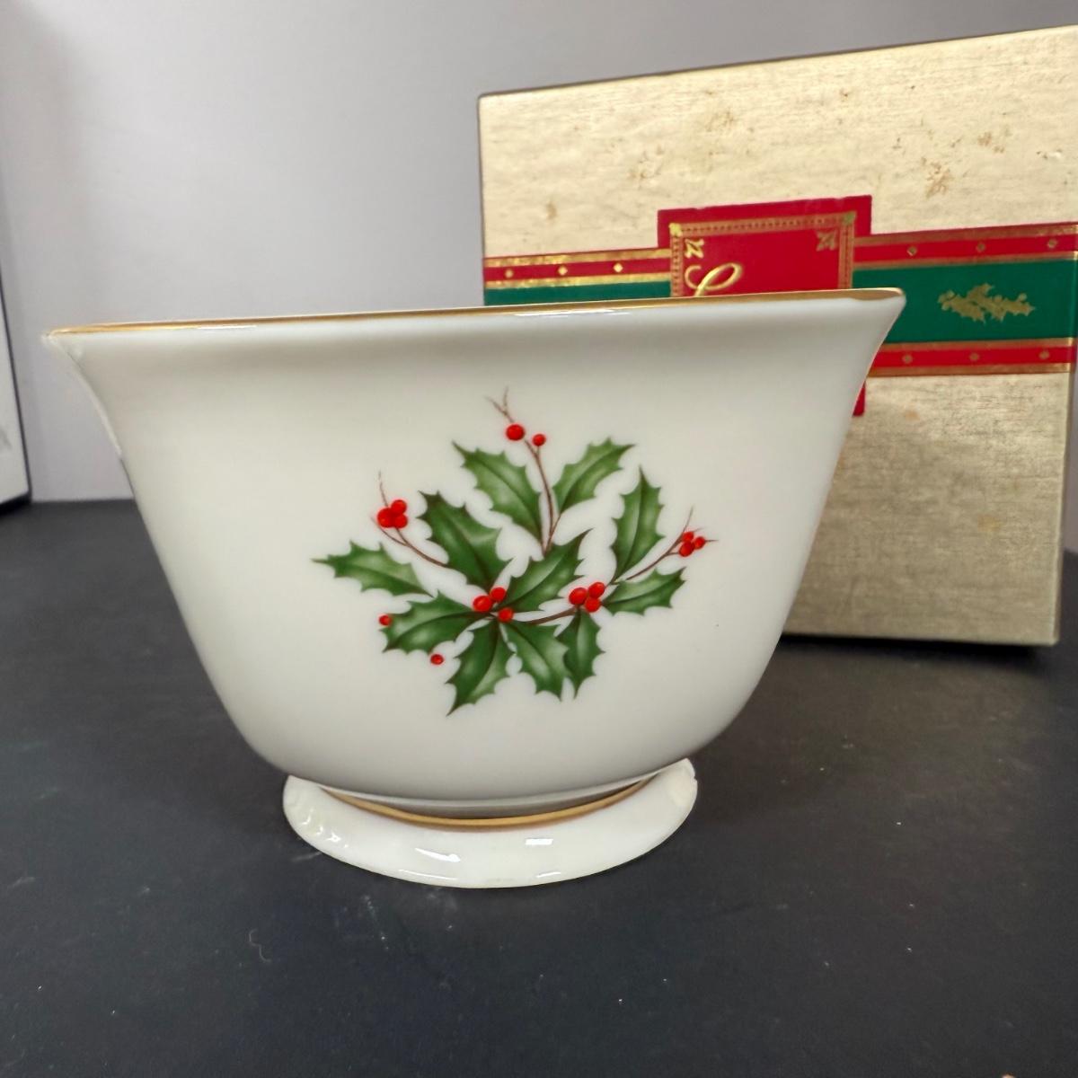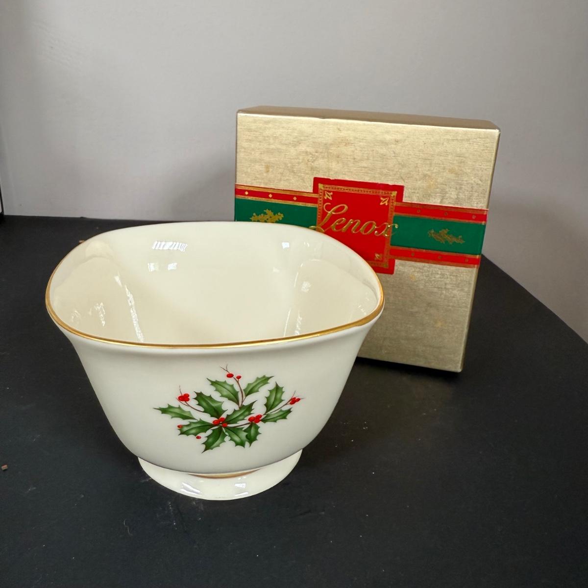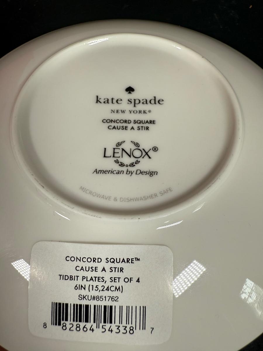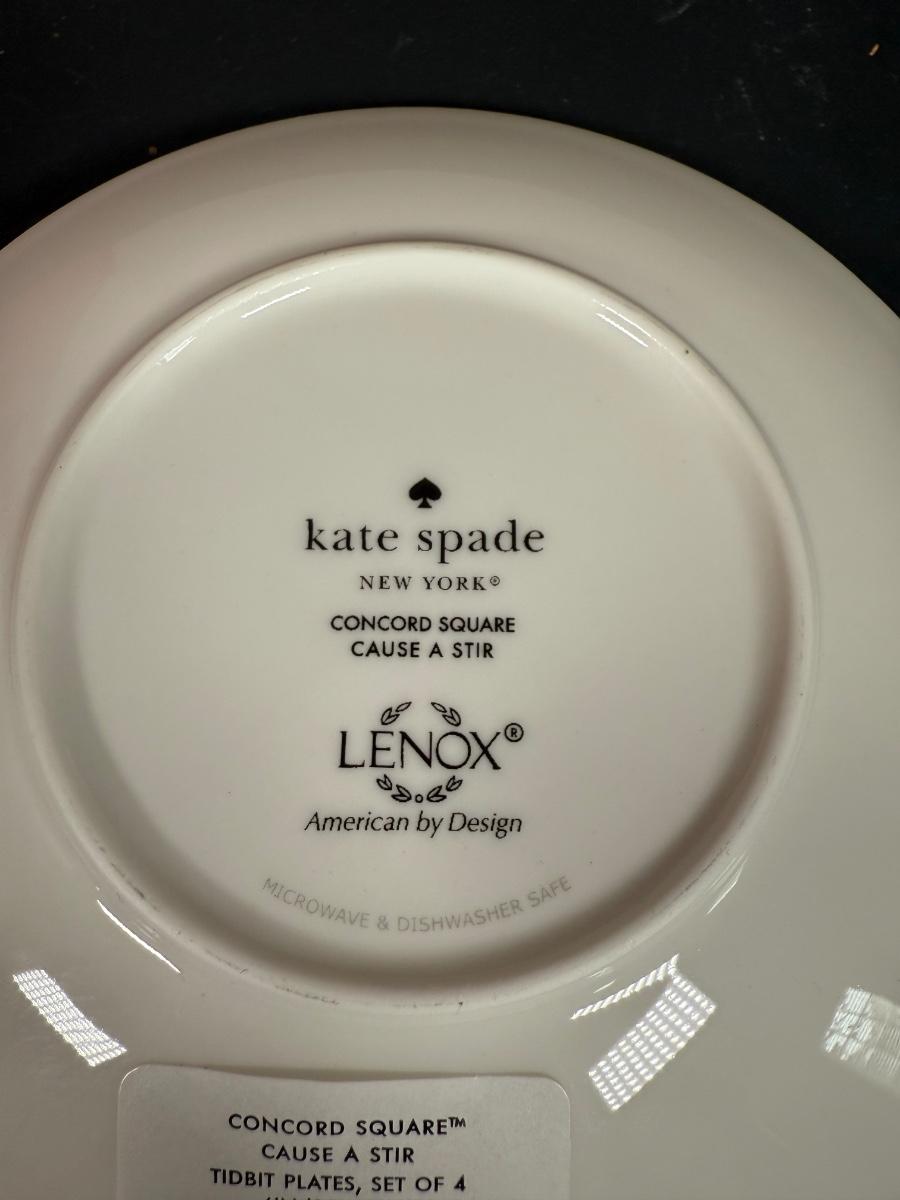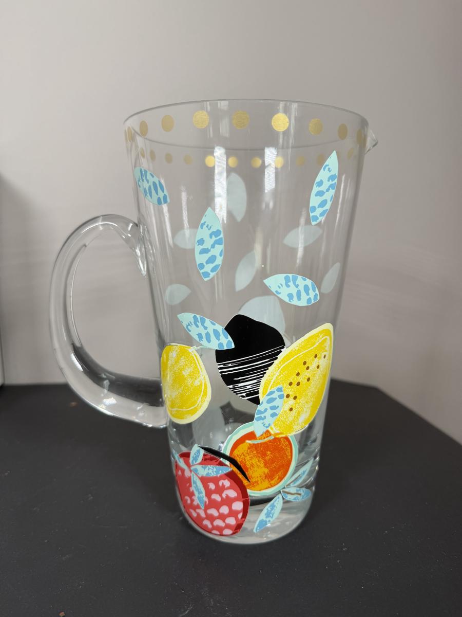 LOT 81G: Lenox Collection - 2 Abstract Fruit Glass Pitchers w/ Boxes, Kate Spade Concord Square Cause A Stir Tidbit Plates w/ Box, Vintage Holly Bowl & More