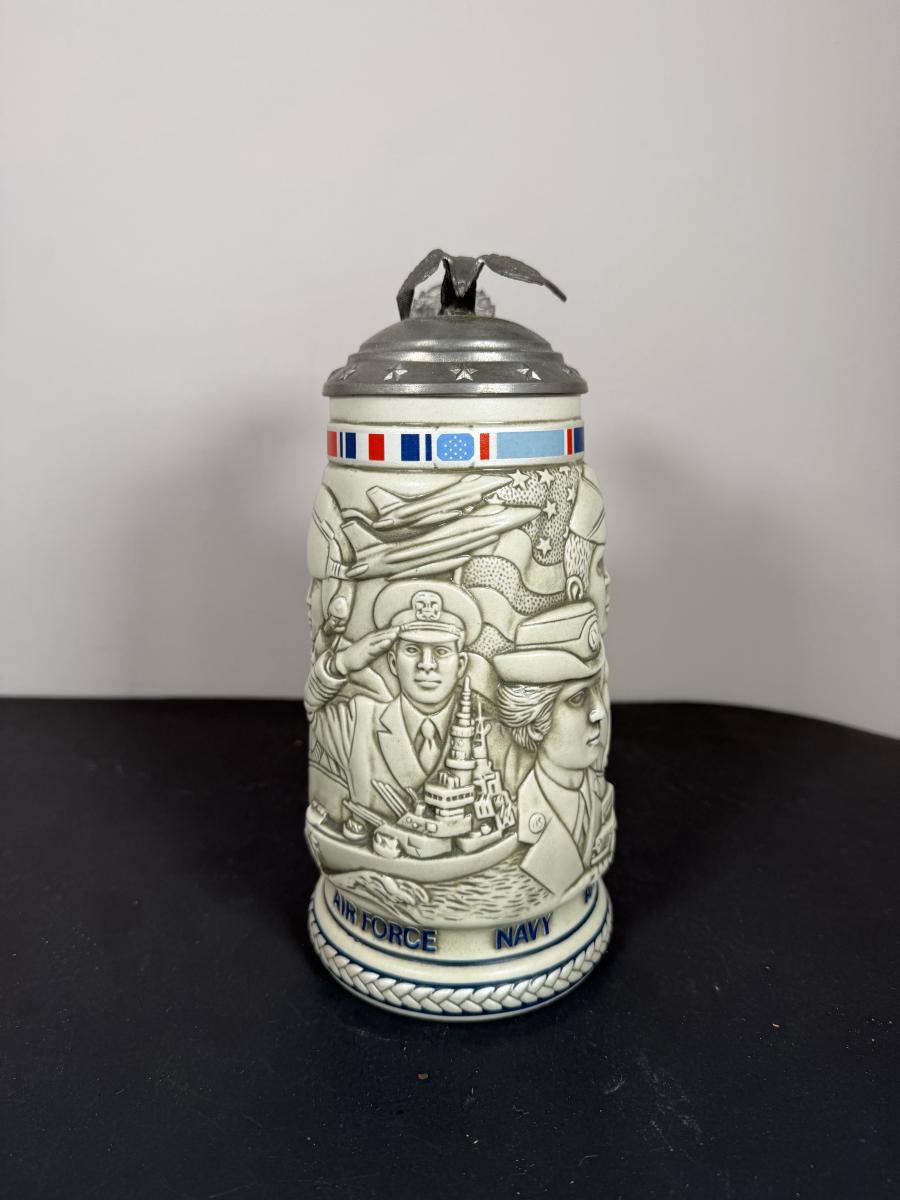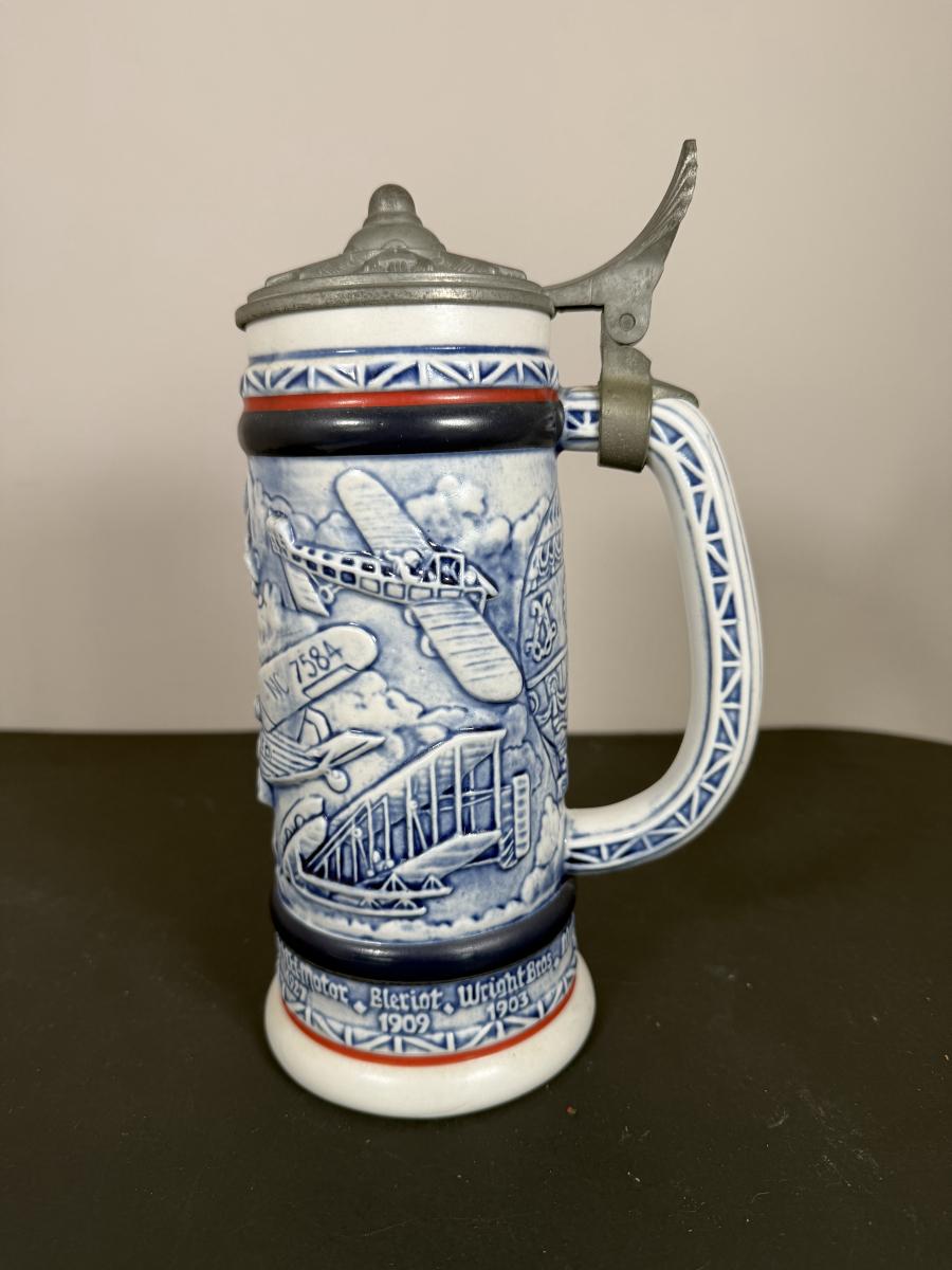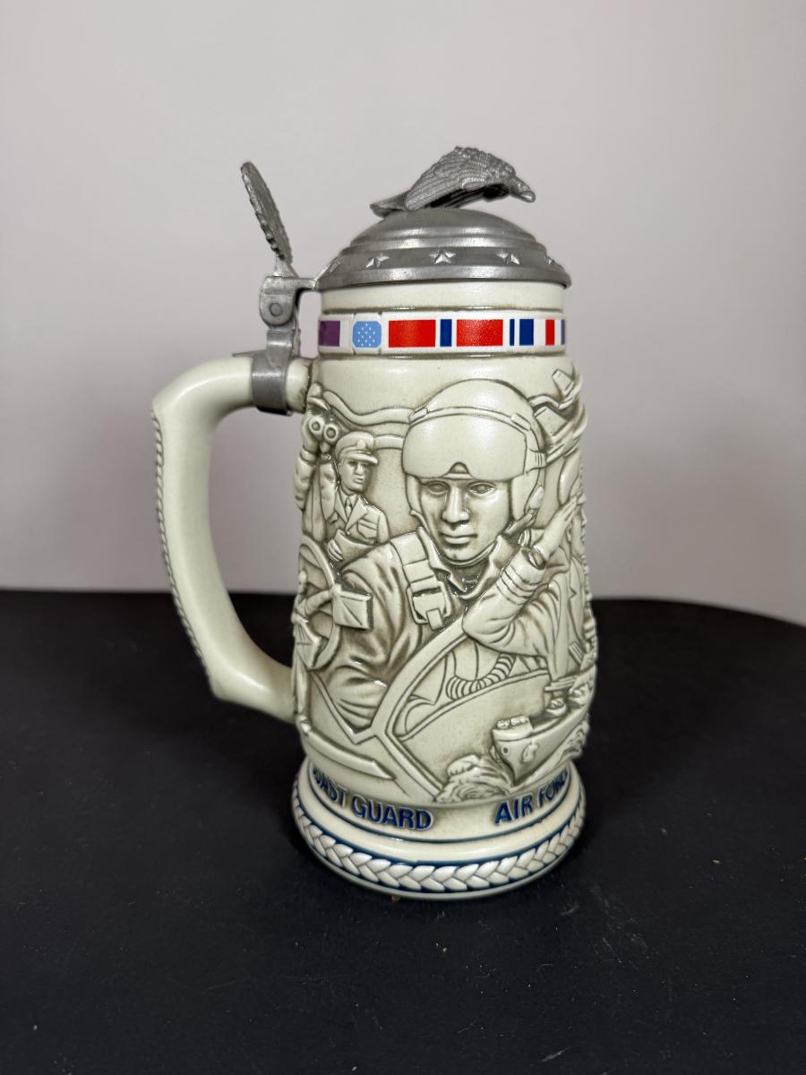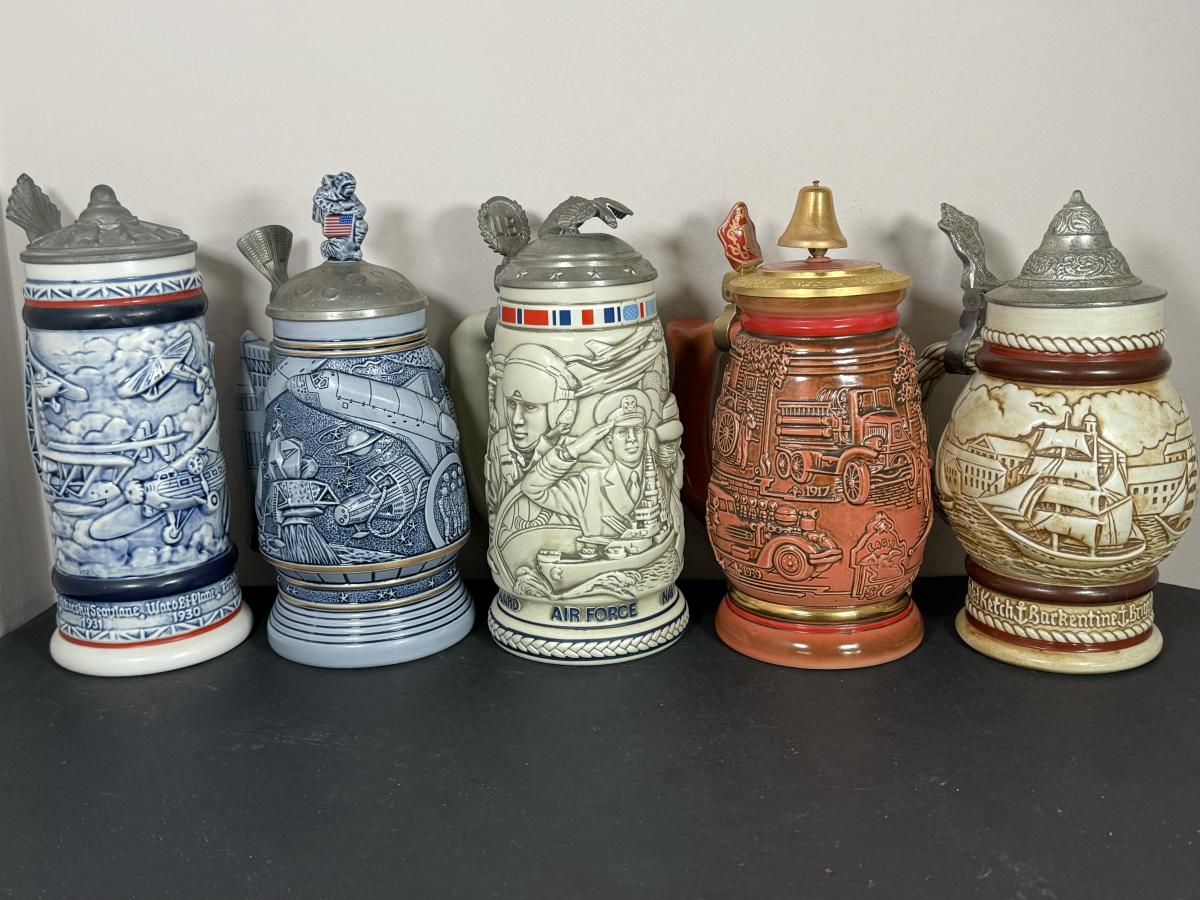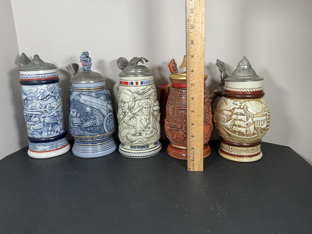 LOT 84G: Avon Steins - 1981 Flying Classics, 1991 Conquest of Space, 1990 Tribute to American Armed Forces, 1989 Tribute to American Firefighters & 1977 Sailing Ships