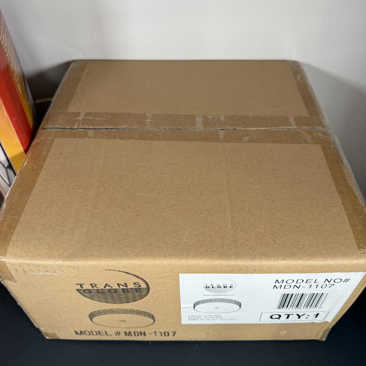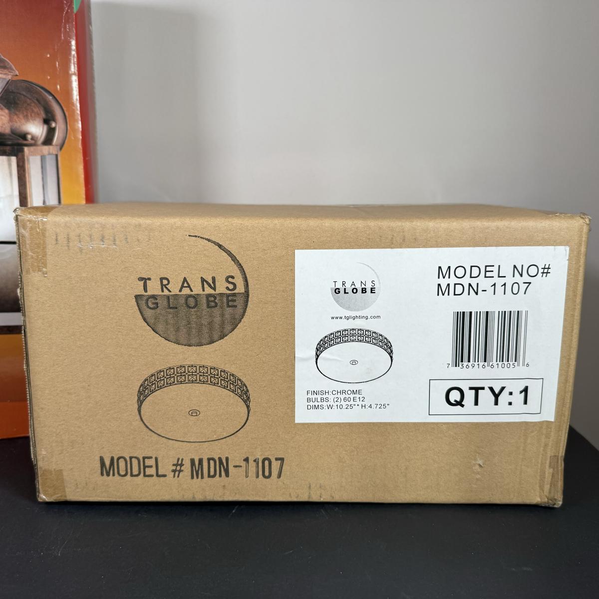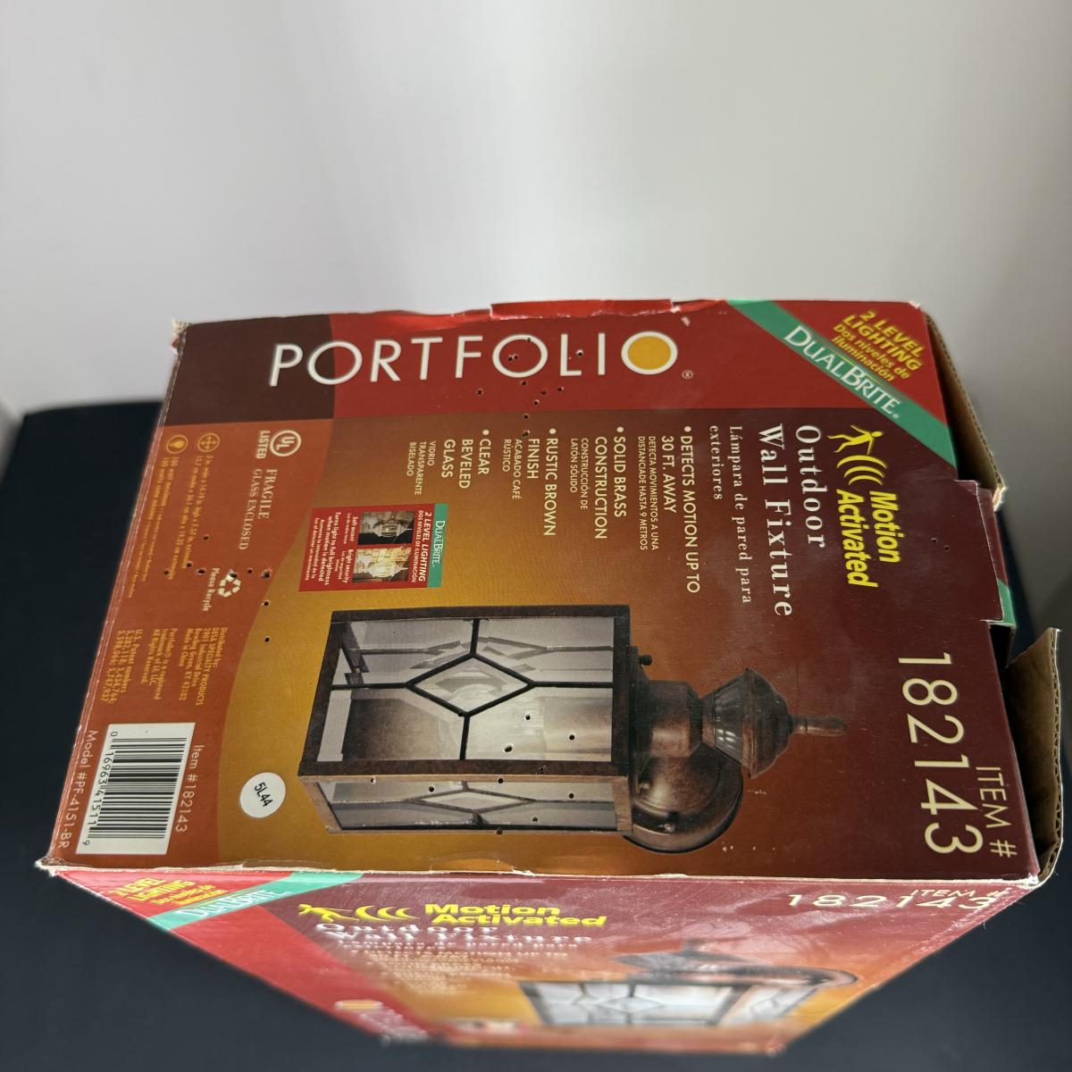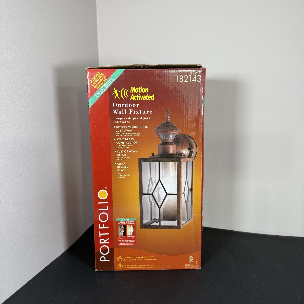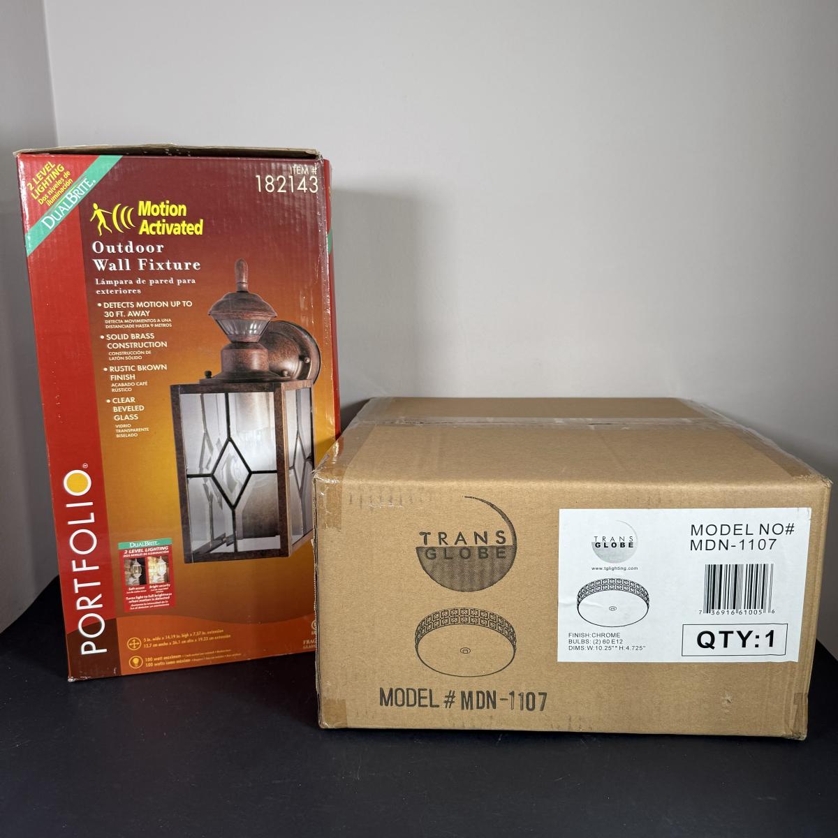 LOT 87G: NIB Portfolio Motion Activated Outdoor Wall Fixture #182143 & Trans Globe Chrome Light Model #MDN-1107